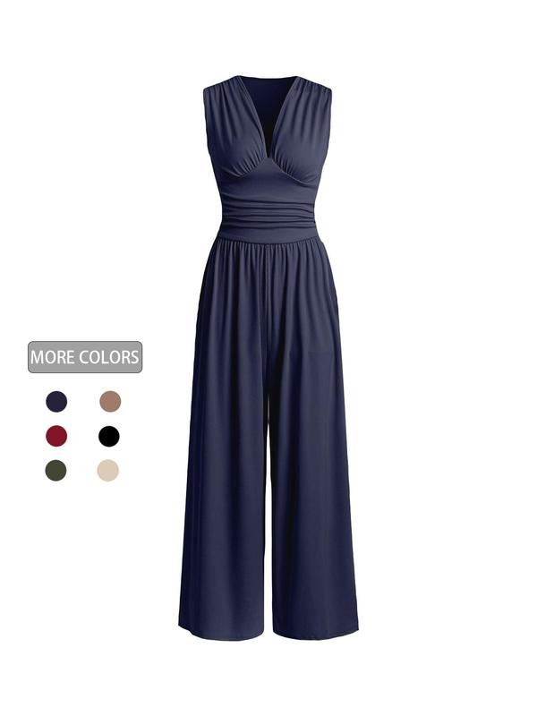 Women's new jumpsuit with pockets Plain Ruched V Neck Ribbed Tank Jumpsuit, Summer Outfits 2026, Elegant Sleeveless Wide Leg Jumpsuit for Women for Vacation Holiday Party, Ladies Summer Clothes