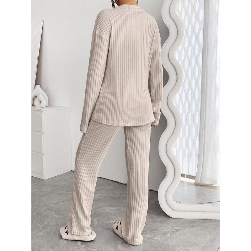 Women's Solid Drop Shoulder Pocket Lounge Set, Casual Long Sleeve V Neck Top & Straight Leg Pants Two-piece Set, Women's Sleepwear