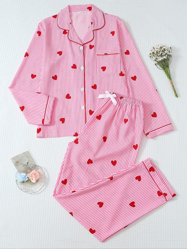 • Women's Striped Bow Print Long Sleeve Pajama Set, Sweet Cute Button Front Top and Pants, Casual Home Wear for All Seasons