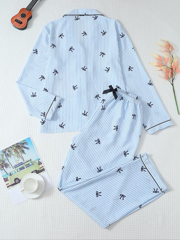 Women's Striped Bow Print Long Sleeve Pajama Set, Sweet Cute Button Front Top and Pants, Casual Home Wear for All Seasons