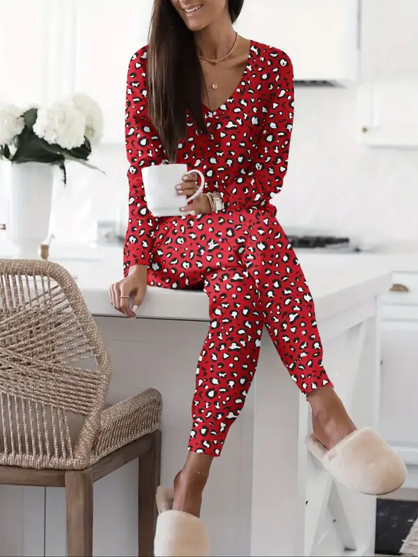 • Women's V-NeckLeopard Print Loungewear Set. This relaxed-fit two-piece features a short-sleeve top and pants for effortlessly chic, casual comfort.