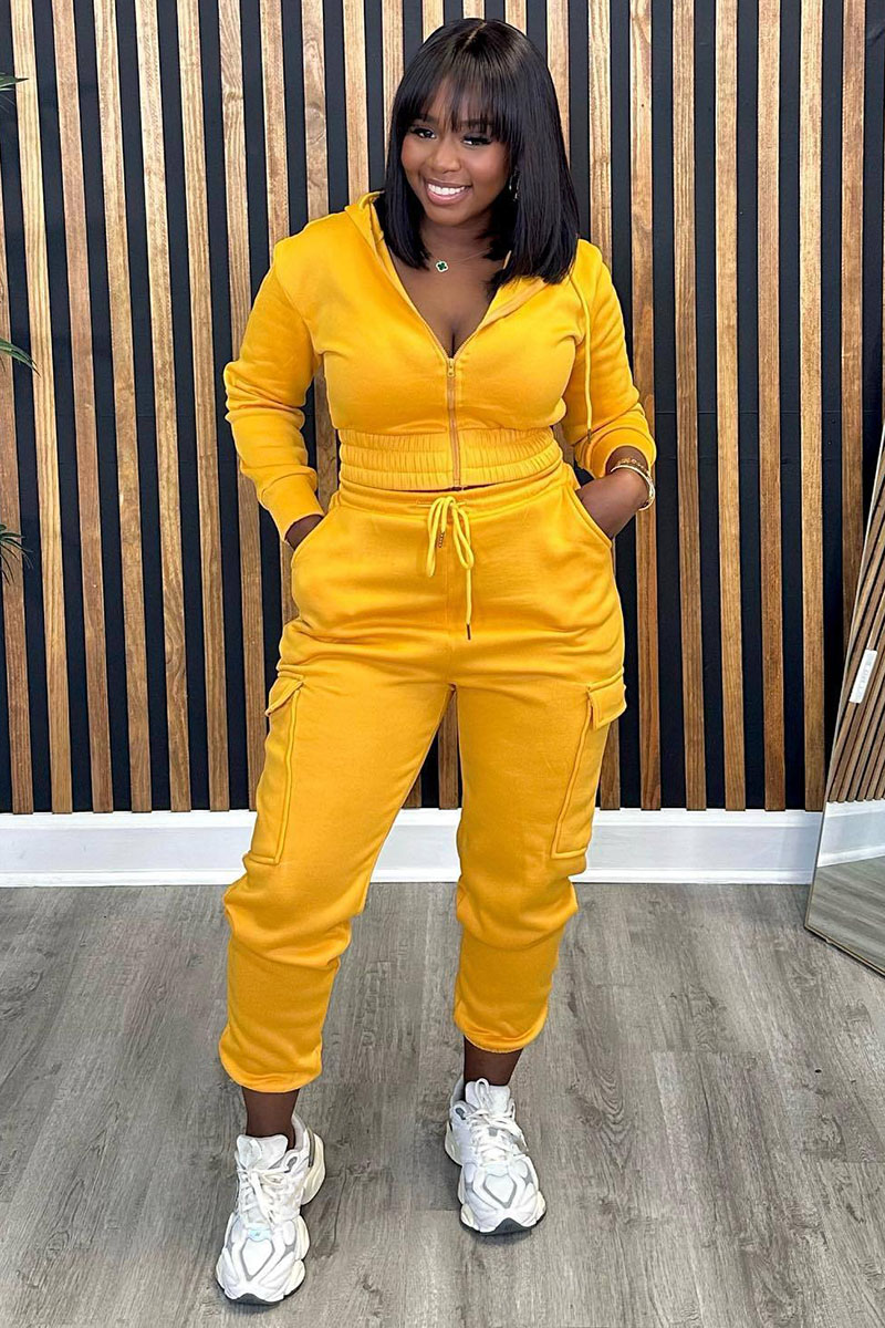 Zip Crop Hoodie Pocket Jogger Pants Matching Set-Green