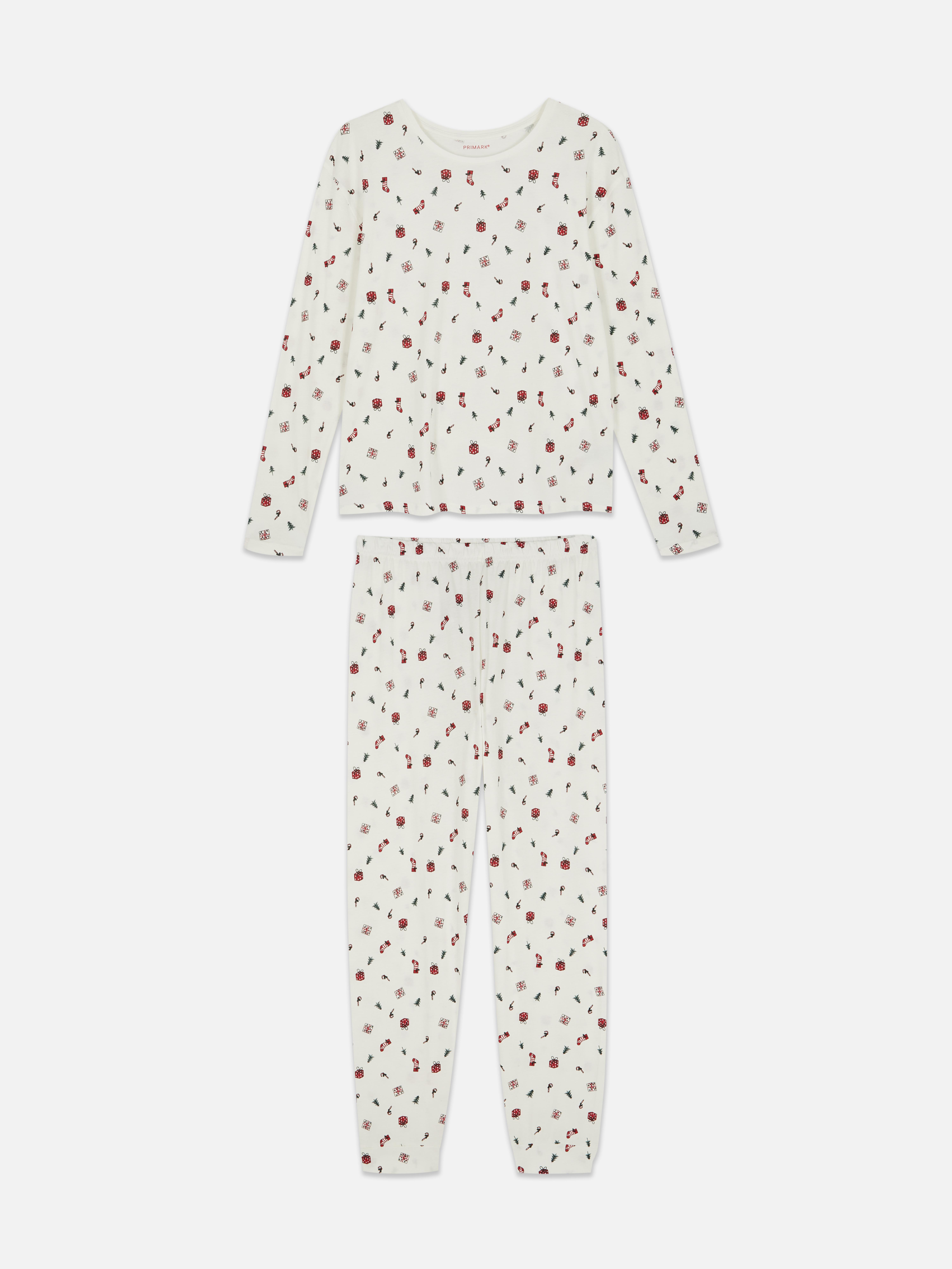 Christmas pajama set featuring a long sleeve top and tapered bottoms with an allover Christmassy print