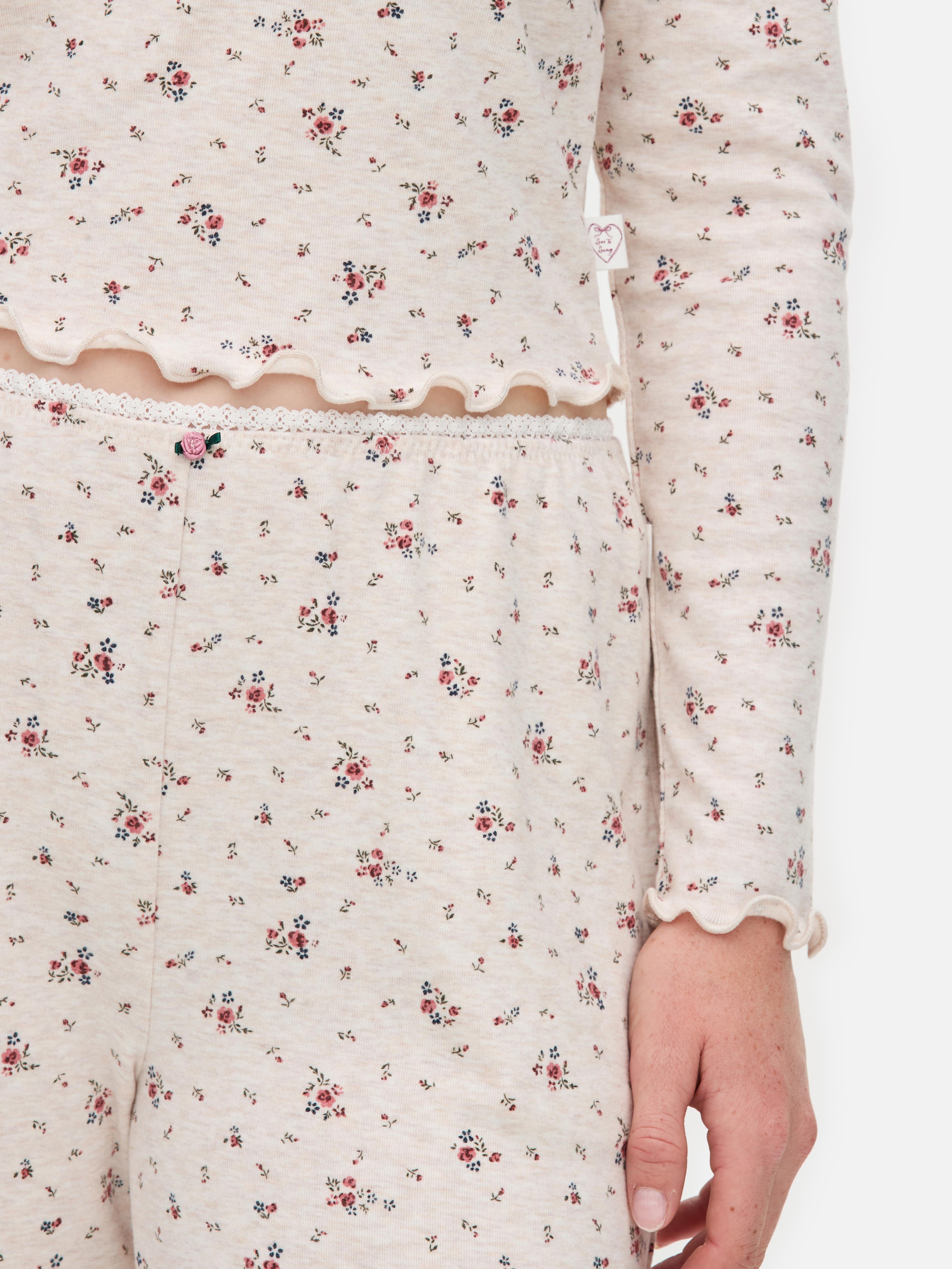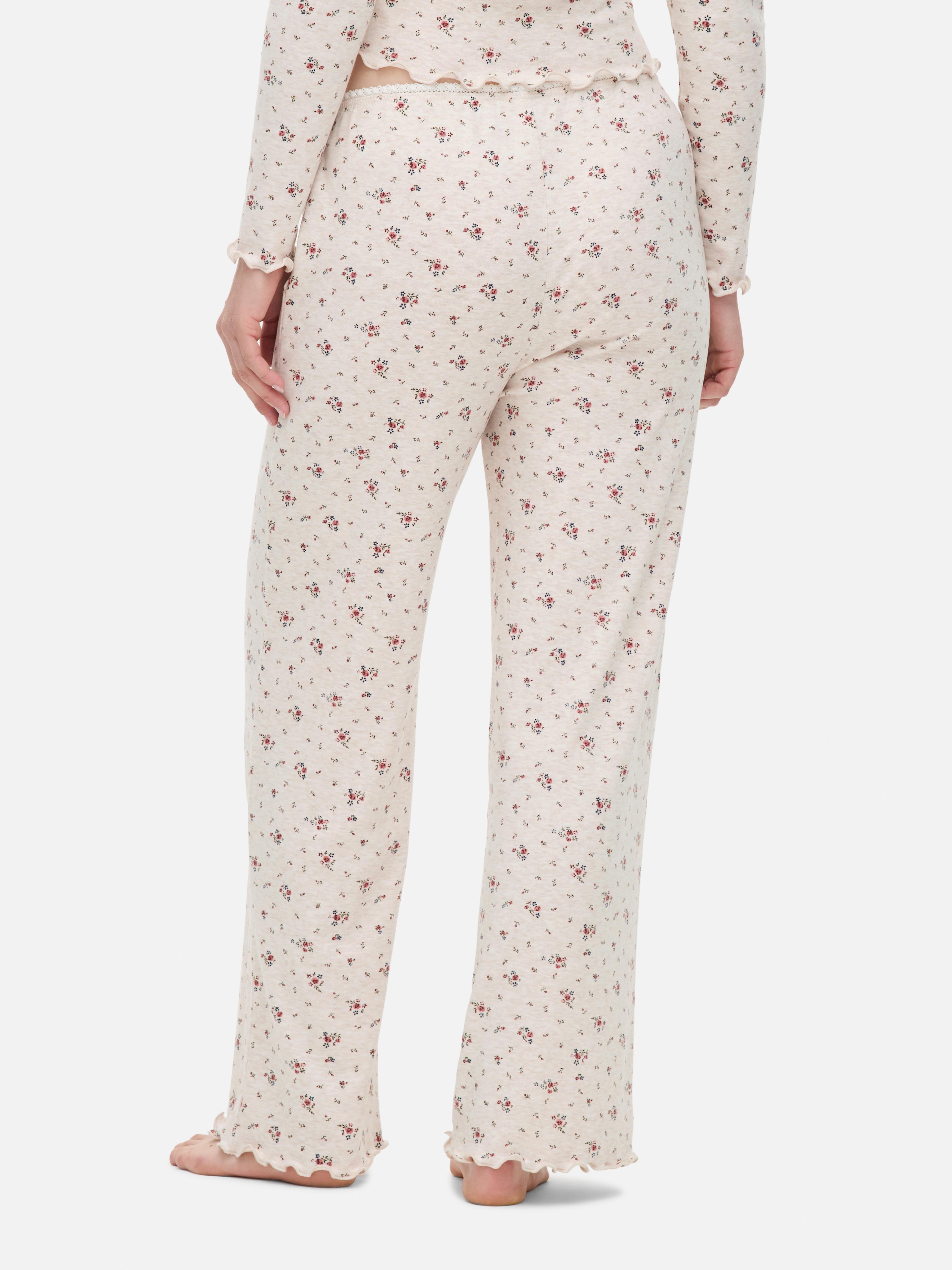 Wide leg pajama bottoms with lettuce hems and allover ditsy floral pattern
