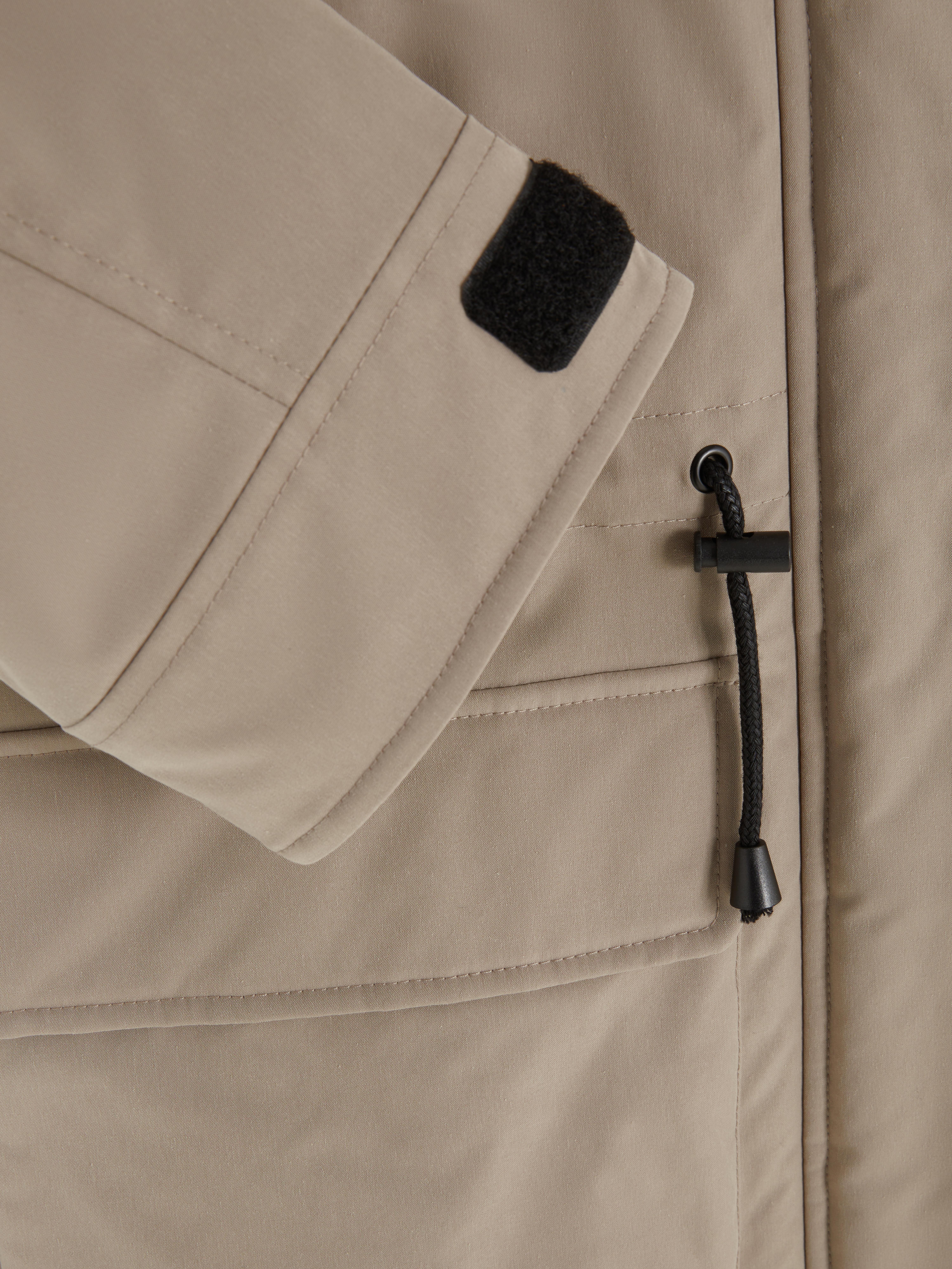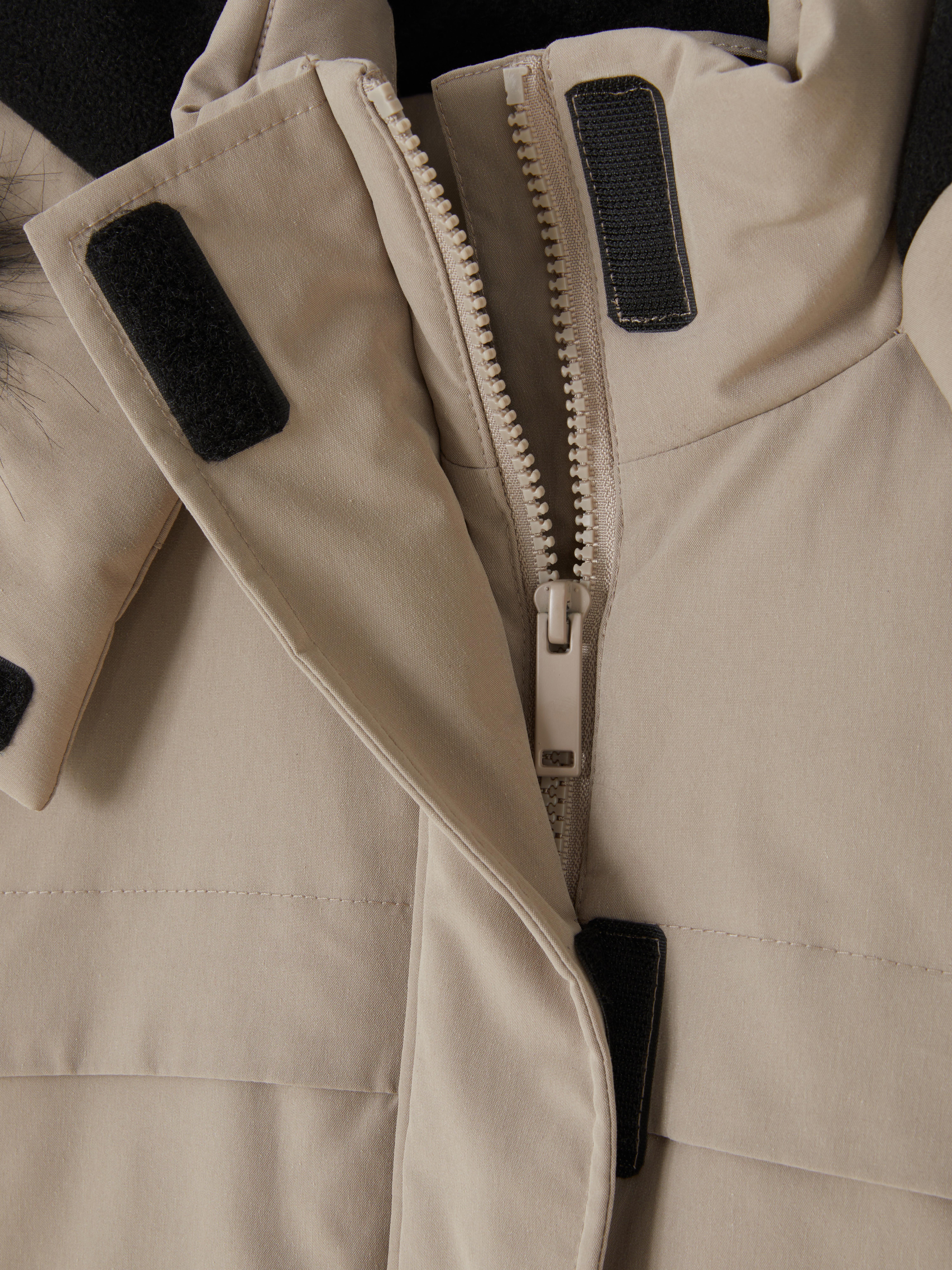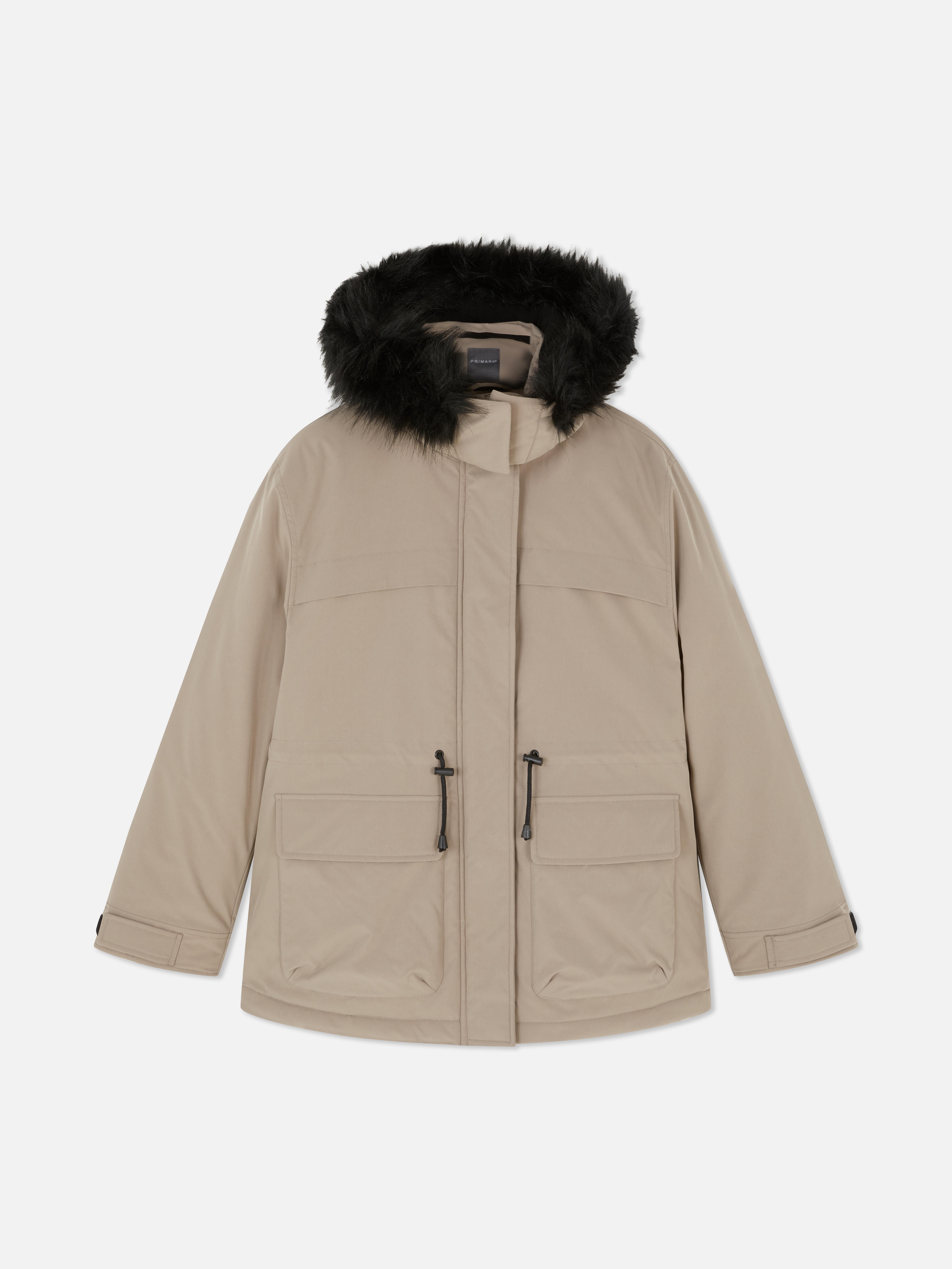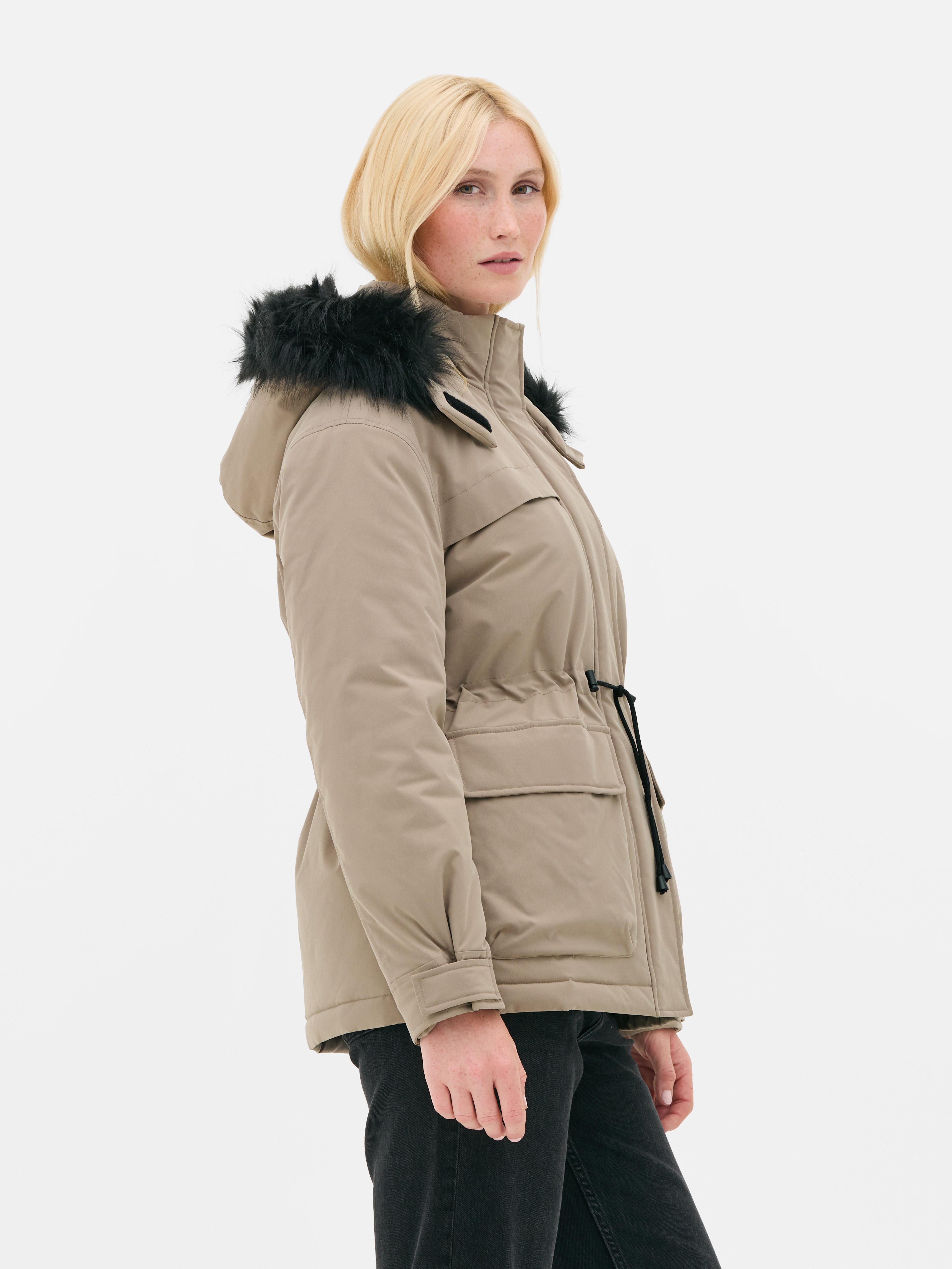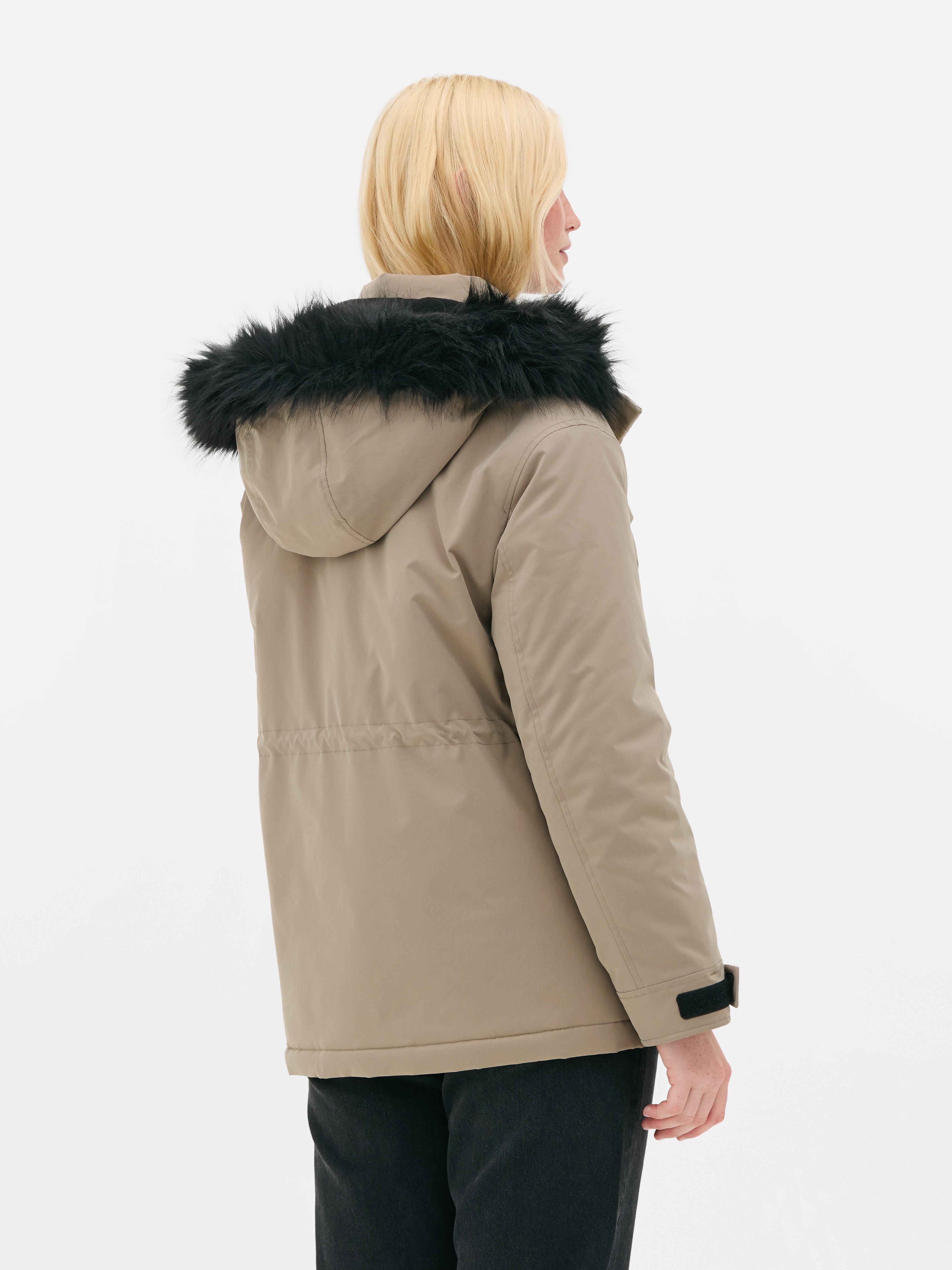 This parka coat comes with a hood with a faux fur trim, a full length zip and hook and loop fastenings in a regular fit