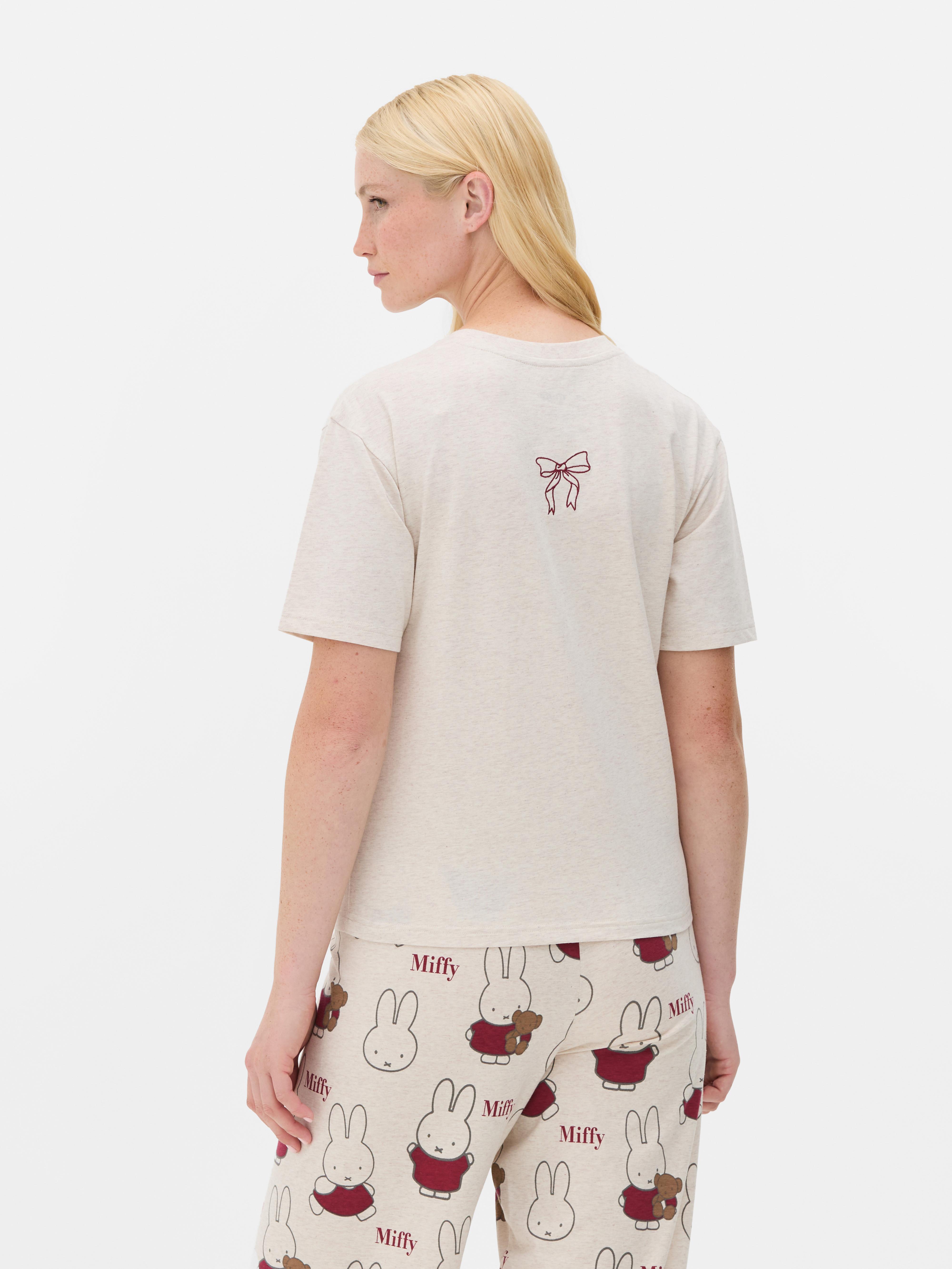 Settle in for relaxed evenings with this sweet Miffy pyjama top. Made from a soft cotton blend in a light oatmeal hue, it’s designed with short sleeves and a classic crew neckline for easy comfort. The front shows a large Miffy graphic, complete with her red and white checkered dress, with her name printed in dark red beside her. A small, printed bow at the back adds a playful finishing touch. With its relaxed fit, this top is perfect for pairing with the matching pyjama bottoms (sold separately!).