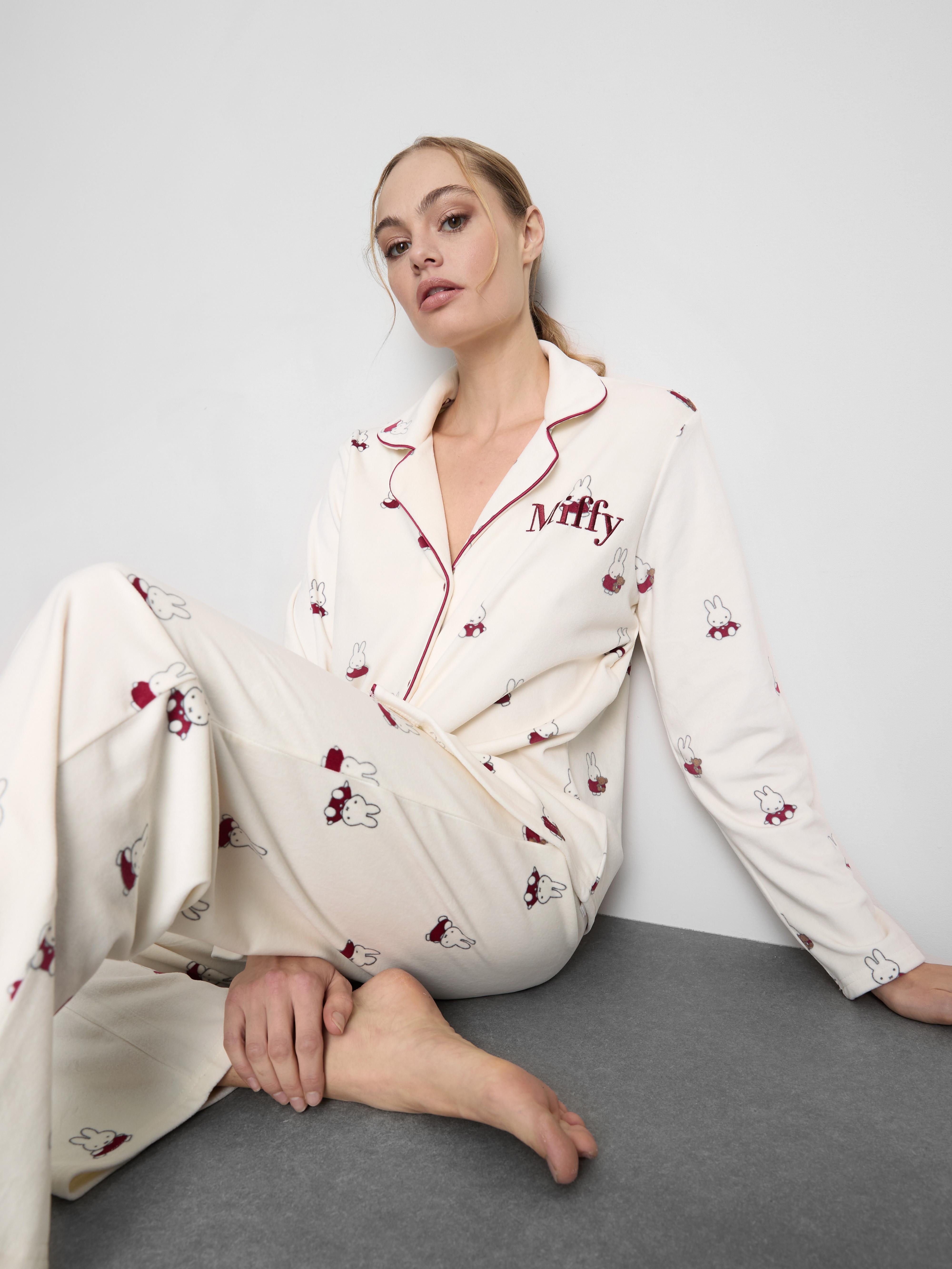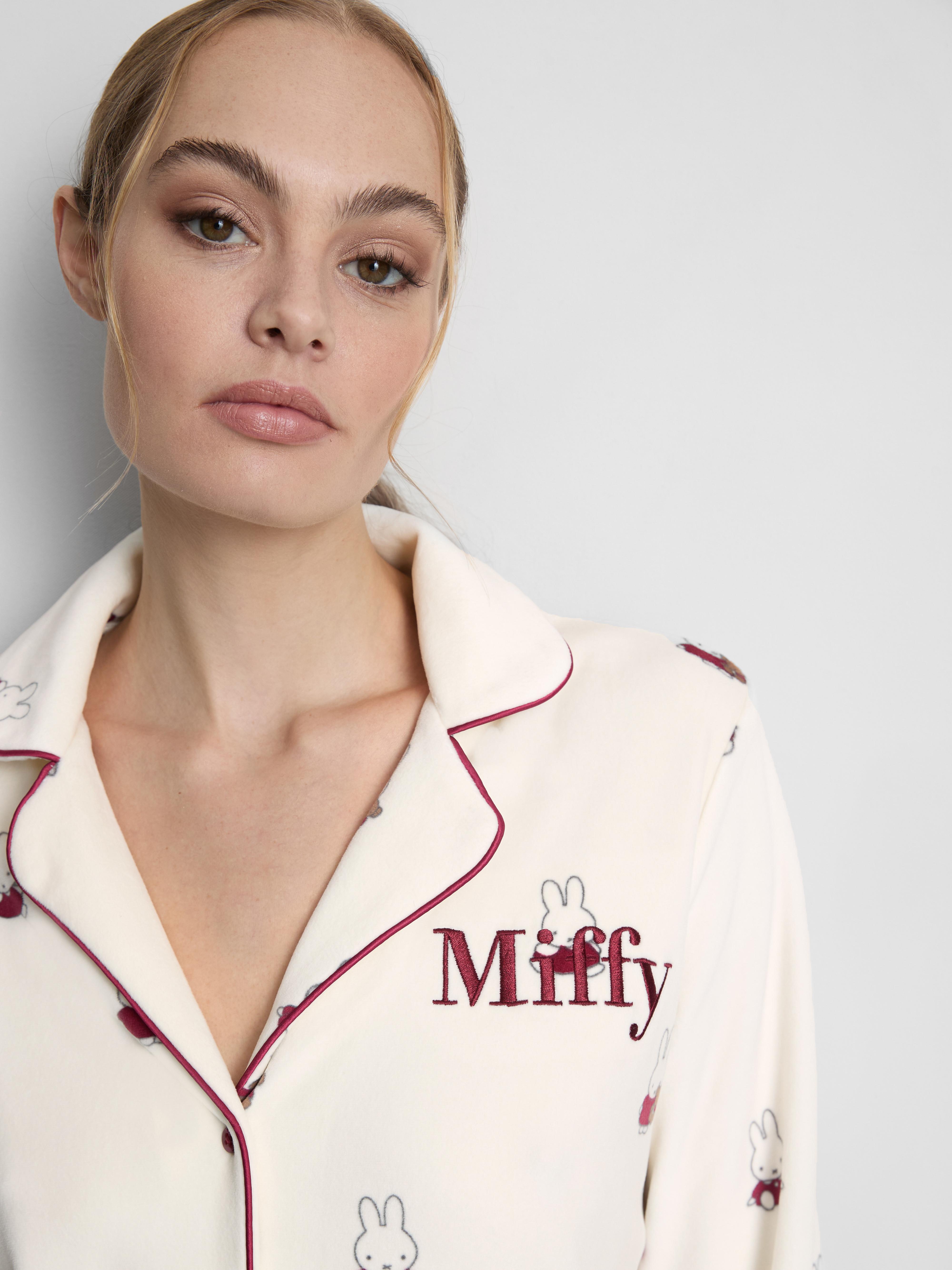 Settle in for comfort with this adorable Miffy plush pyjama set. Designed in a relaxed boyfriend fit, it includes a long sleeve button-up shirt with contrast piping, a revere collar, and embroidered “Miffy” text on the chest pocket. The matching full-length trousers come with an elasticated waistband for ease and comfort. Both pieces are covered in a playful all-over Miffy print, bringing a soft, characterful touch to your nightwear drawer. Perfect for movie nights or slow mornings at home.