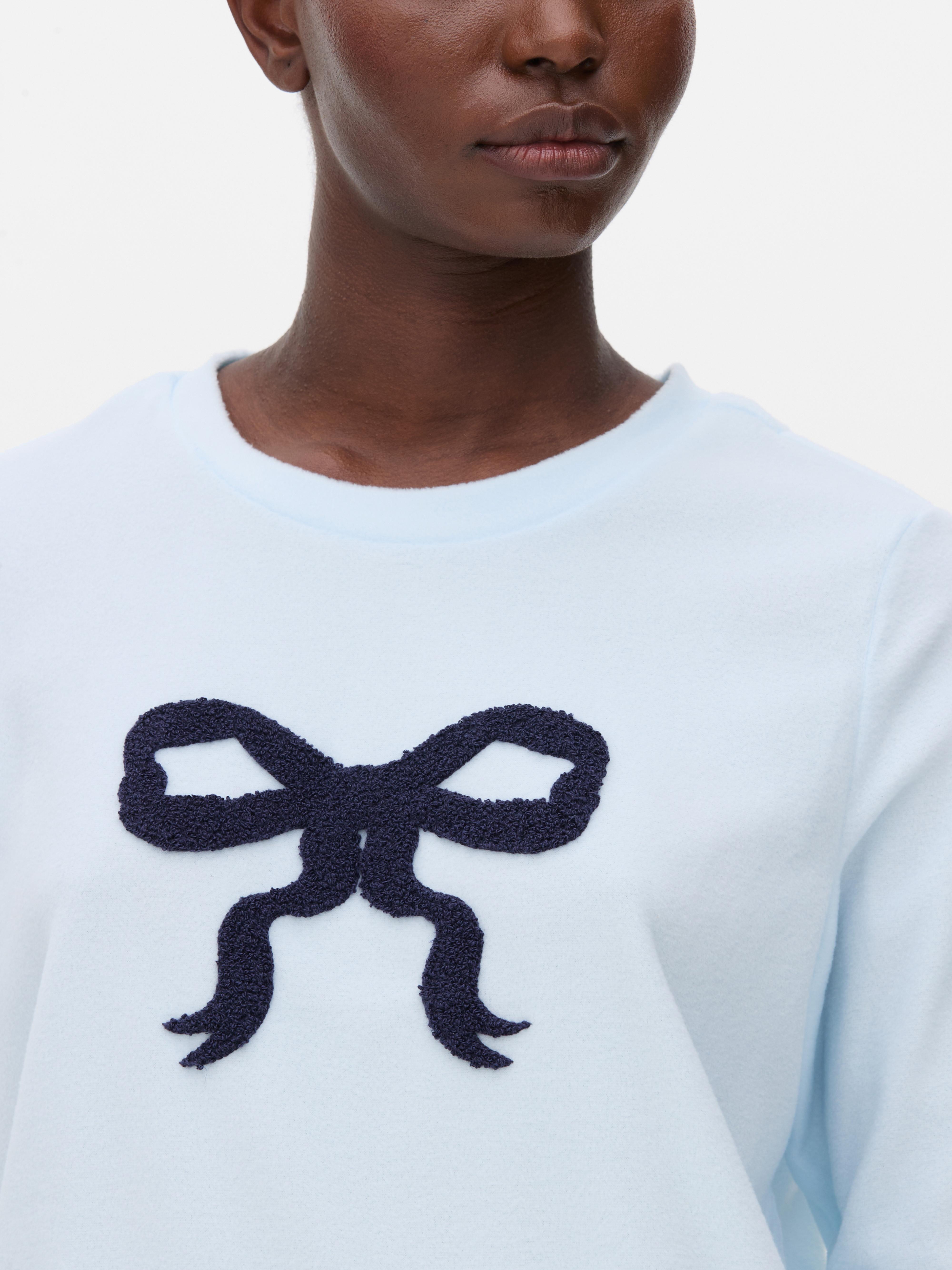 Snuggle season? You’re covered with this fleecey PJ favourite. The long sleeved top comes in a gentle light blue shade with a bold bow motif on the front, while the full length bottoms are printed all over with matching mini bows. The relaxed fit and elasticated waistband make it easy to move, snooze, or lounge in total comfort. Finished with a classic crew neck and cosy feel, you’ll struggle to put this pair of pyjamas down.