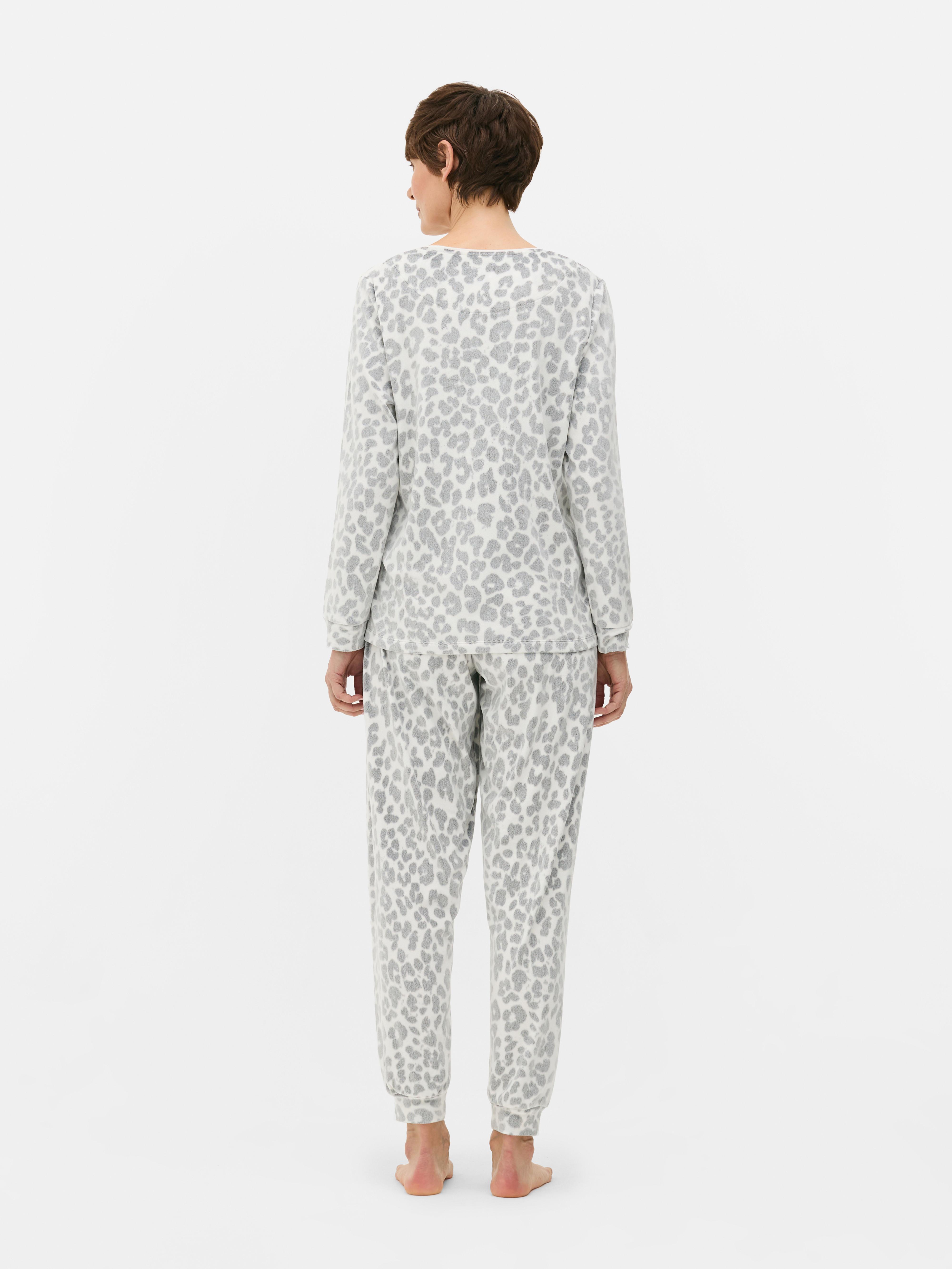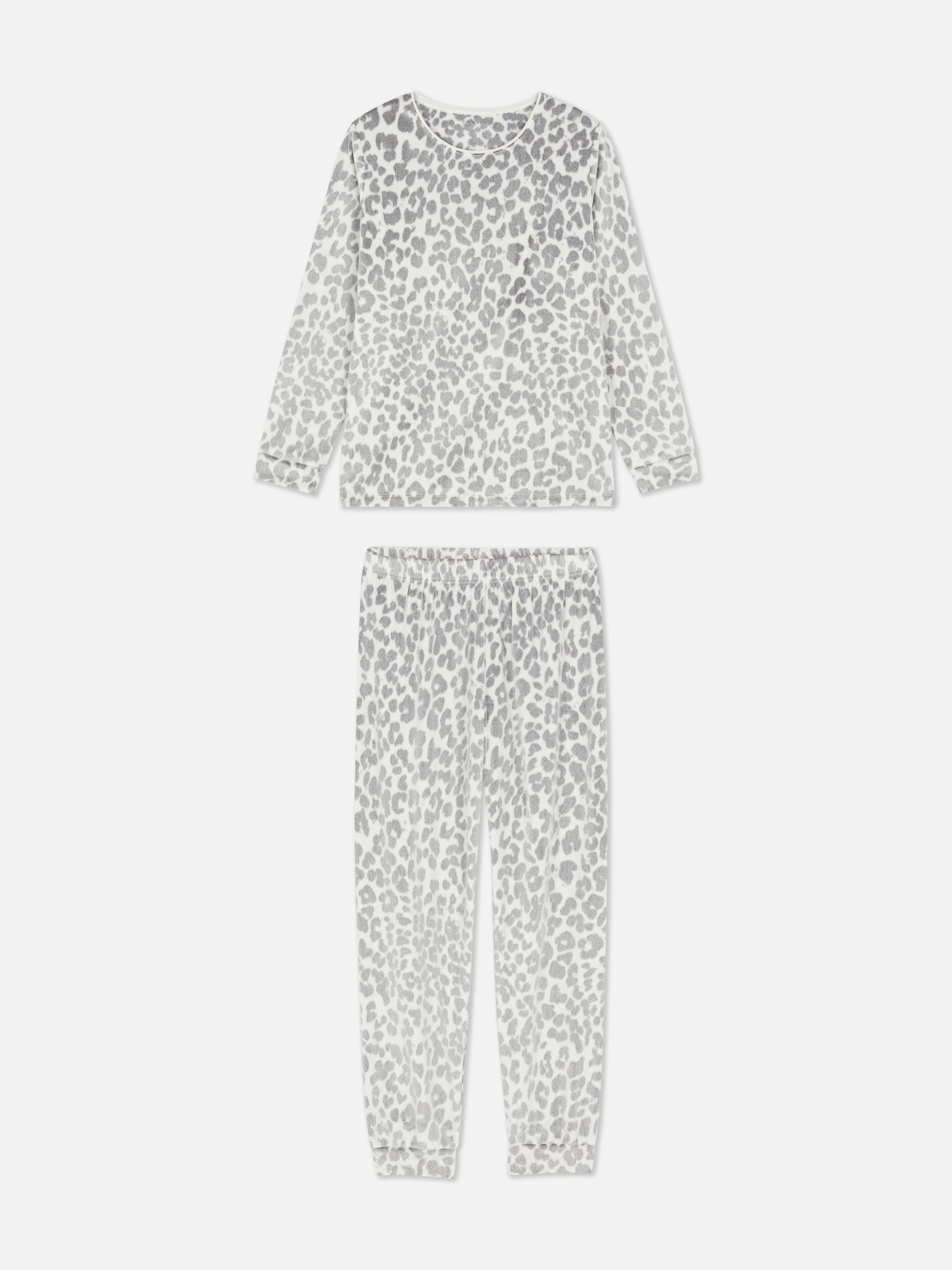 Snuggle into softness with this plush pyjama set. Made from fuzzy, plush fabric, this two-piece is all about warmth and comfort, with a relaxed fit that’s perfect for evenings in. The light animal print adds a fun twist, while the long-sleeved crew neck top and full-length bottoms keep things cosy. Finished with cuffed ankles to help lock in the warmth, it’s a set you’ll reach for whenever it’s time to unwind.