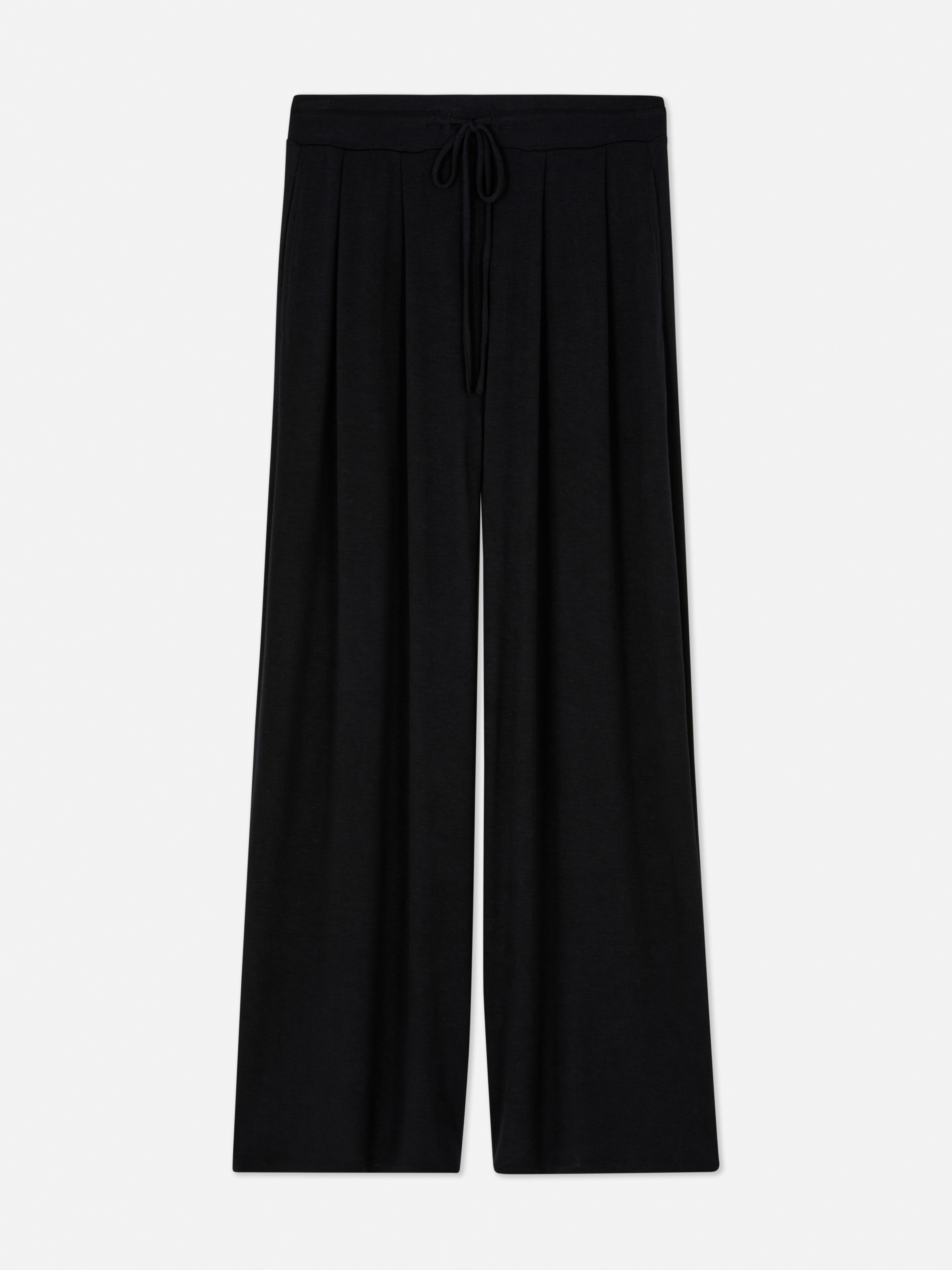Let comfort lead the way with these black wide leg sleep trousers. Made in a soft, flowing fabric for a light feel, they come in a relaxed, loose fit that keeps comfort top of the list. The elasticated waistband with an adjustable drawstring tie makes it easy to find your perfect fit, while side pockets add a practical touch for carrying your essentials around the house. Full-length to keep you comfy from top to toe, pair it with the matching top for a co-ordinated loungewear fit.