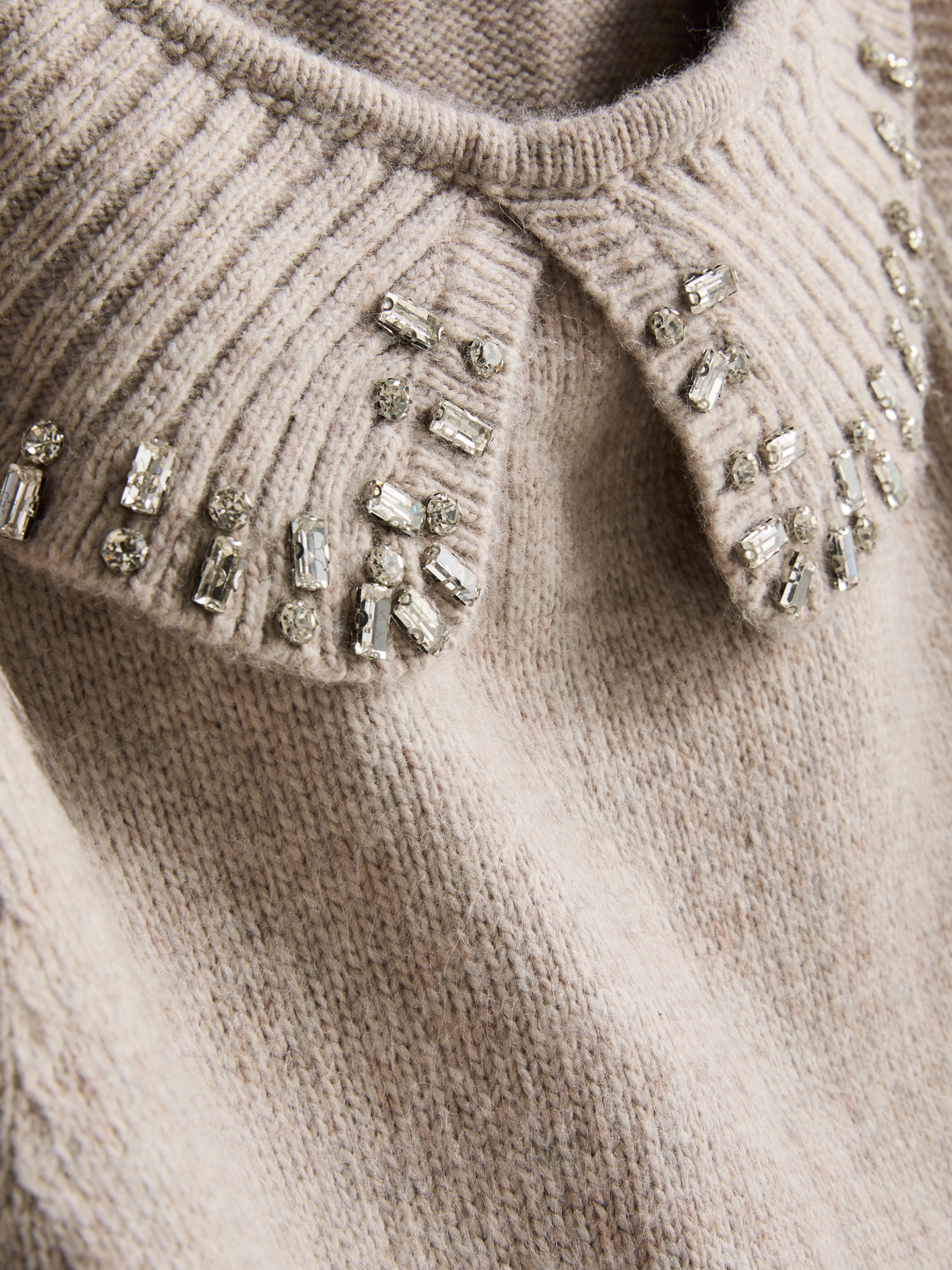 This 2 in 1 sweater has a knitted tank with a faux jewel embroidered collar and a shirt collar and sleeves poking out from underneath