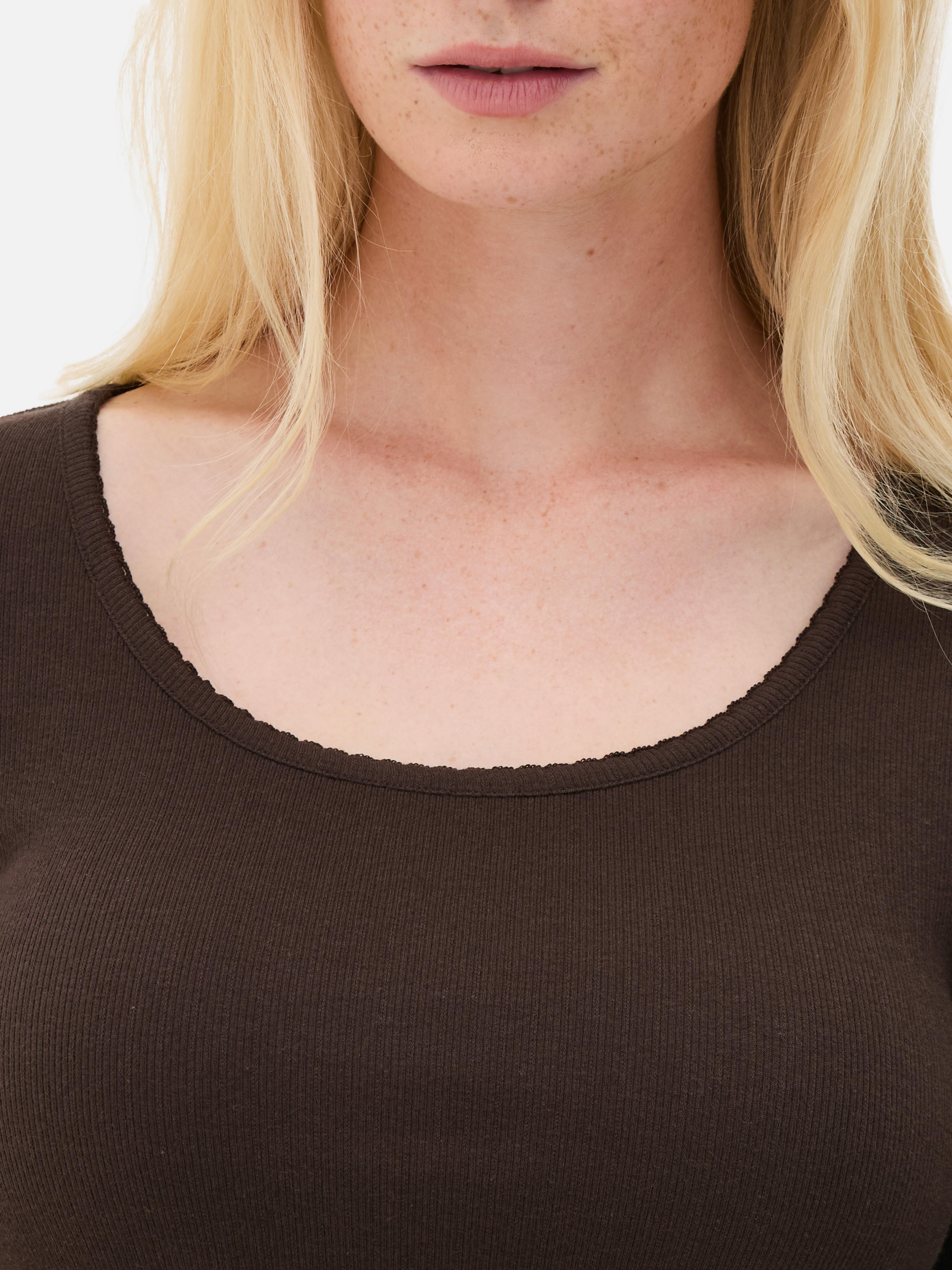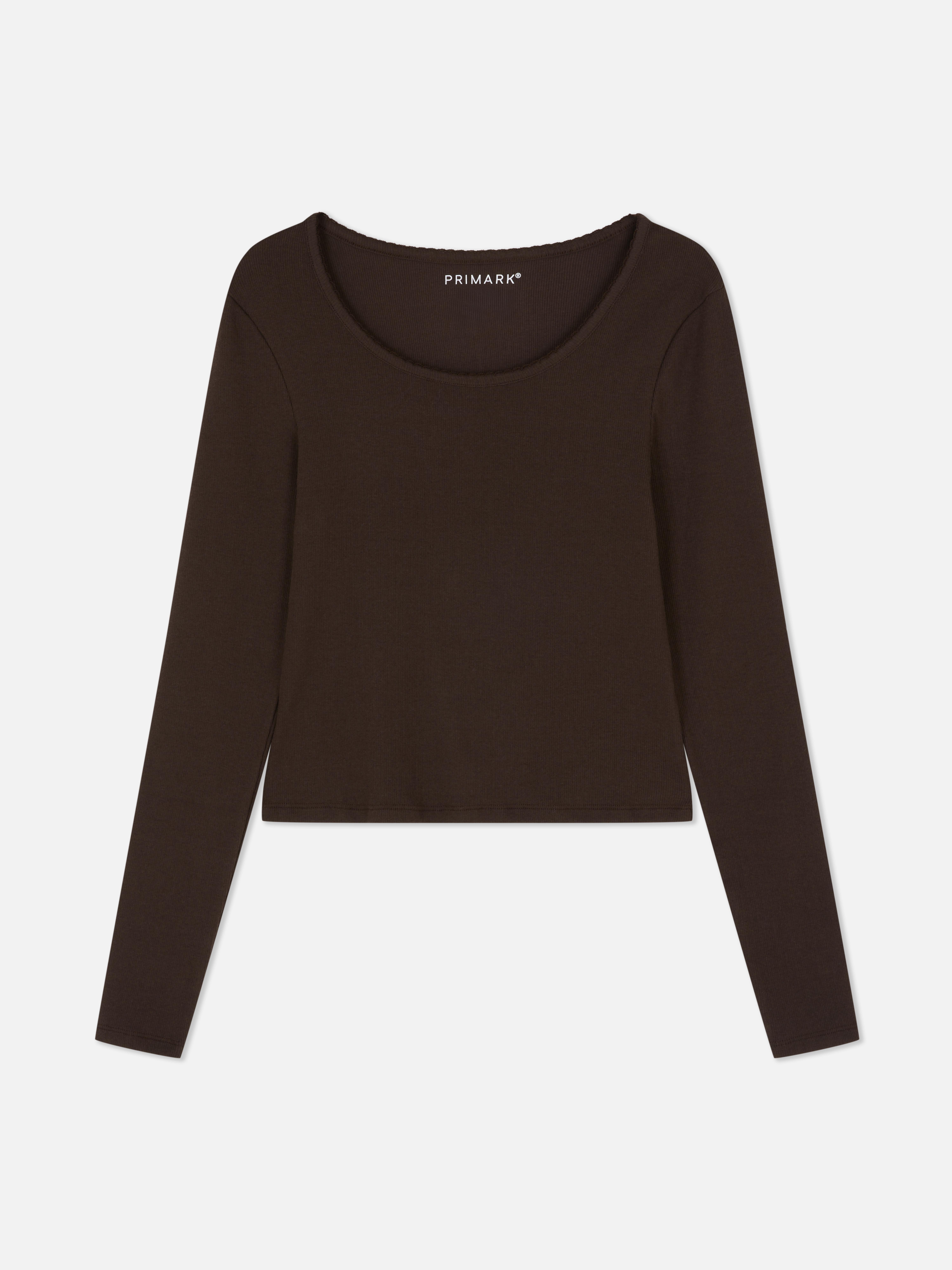 Soft, simple and perfect for layering, this scoop neck top is an everyday go to. Designed in a chocolate shade, it’s made from a cotton rich fabric. The body-hugging fit and long sleeves keep things snug, while the scoop neckline adds a gentle touch of shape. Whether worn solo or under your favourite jacket, it’s a comfy pick that goes with just about everything.