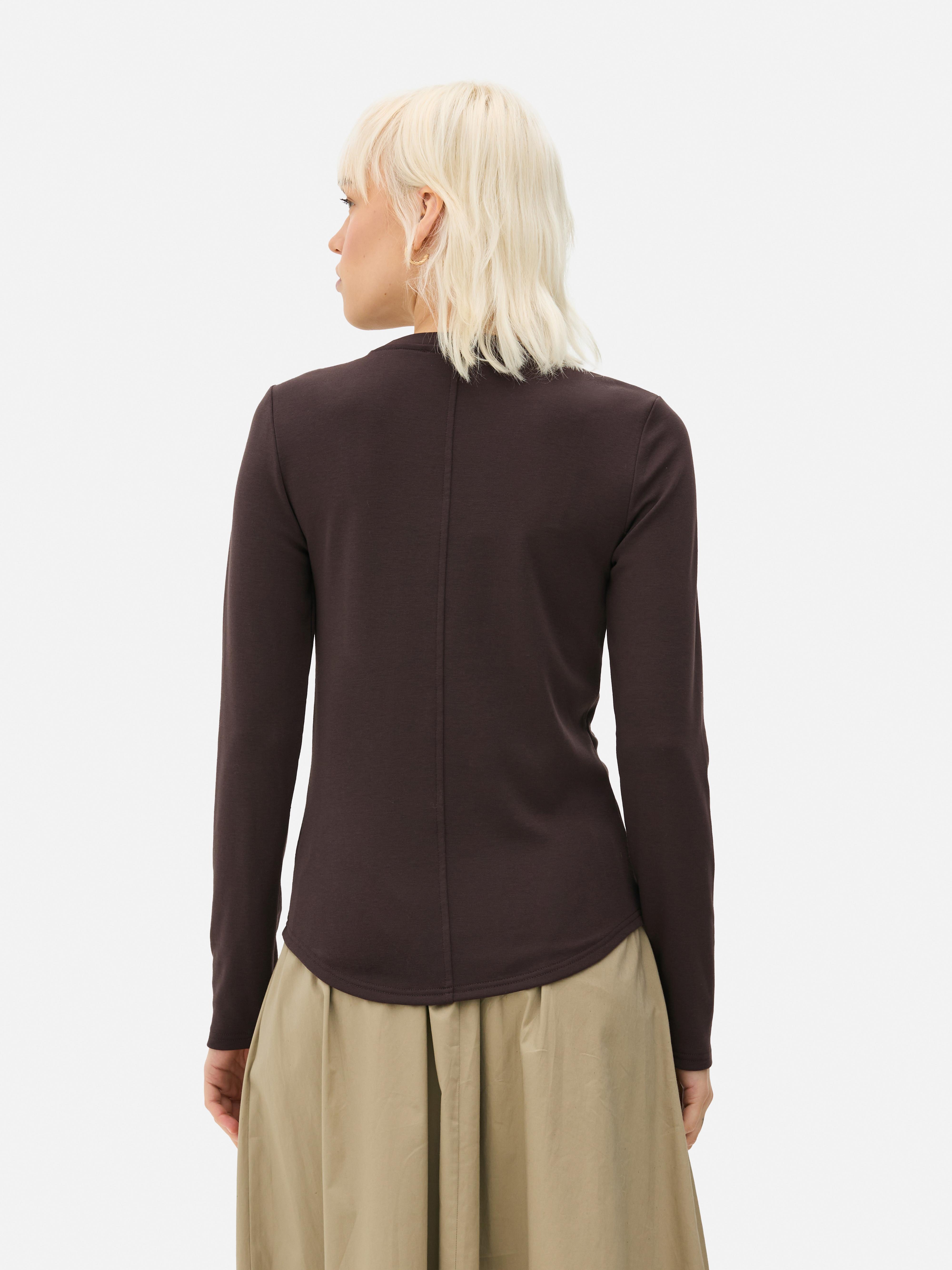 Wrap yourself in softness with this cosy long sleeve top. Made from a comfy fabric in a chocolate shade, it’s perfect for layering or wearing solo. The fitted silhouette hugs gently, while the crew neckline keeps things classic. A subtle curved hem adds shape and interest to the design, making it easy to tuck in or leave out. Whether you’re relaxing at home or heading out, this top brings warmth and versatility to your everyday wardrobe.