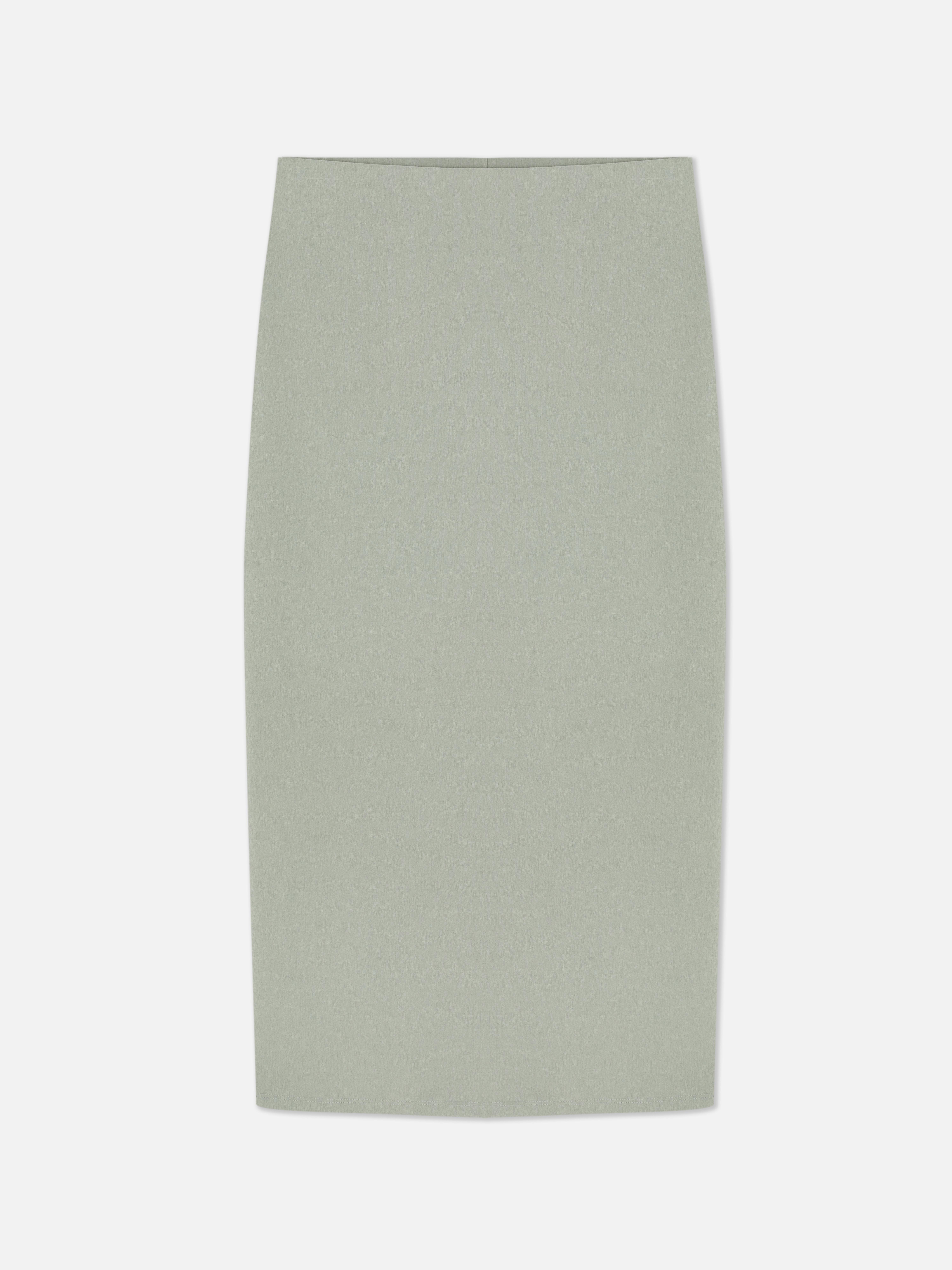 Sleek, simple and easy to style, this midi skirt is made from softly textured crepe fabric that drapes like a dream. It sits high on the waist and skims the body with a slim fit, falling to a classic mid-calf length. The solid sage green colour adds a neutral tone to your wardrobe – ideal for pairing with everything from tees to tucked in shirts. Whether you're dressing for the office or the weekend, this skirt brings that polished feel without the fuss.