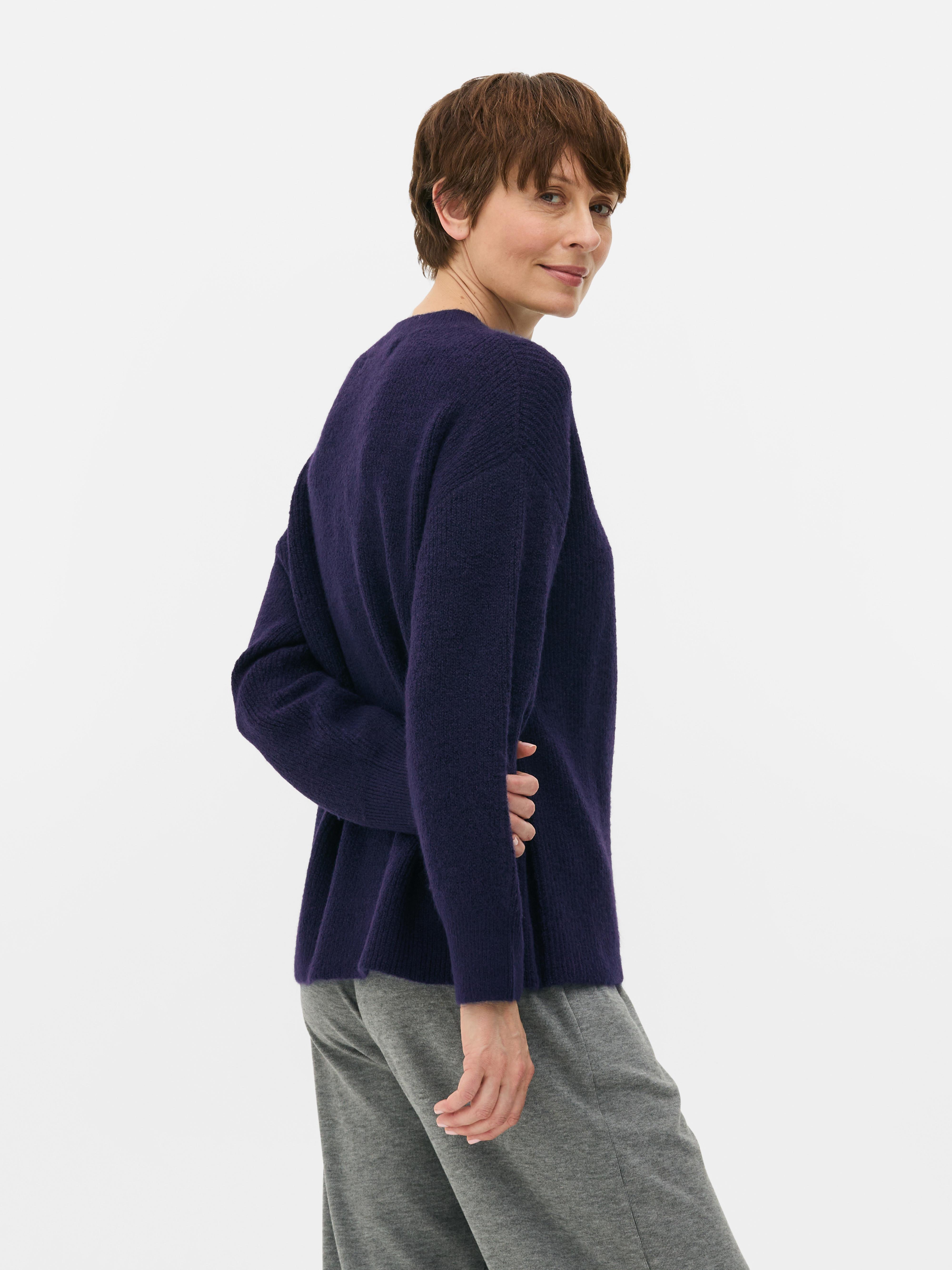 Keep it simple and stylish with this knitted crew neck jumper. Designed with a relaxed, boxy fit, it’s crafted from a soft knit with a lightly textured finish for added comfort. The classic crew neckline, long sleeves and ribbed trims at the cuffs and hem bring a neat touch to the overall shape. Finished in a deep navy blue shade, it’s a timeless piece you’ll reach for again and again. Perfect for layering or wearing on its own, this jumper makes everyday dressing easy while keeping you cosy.