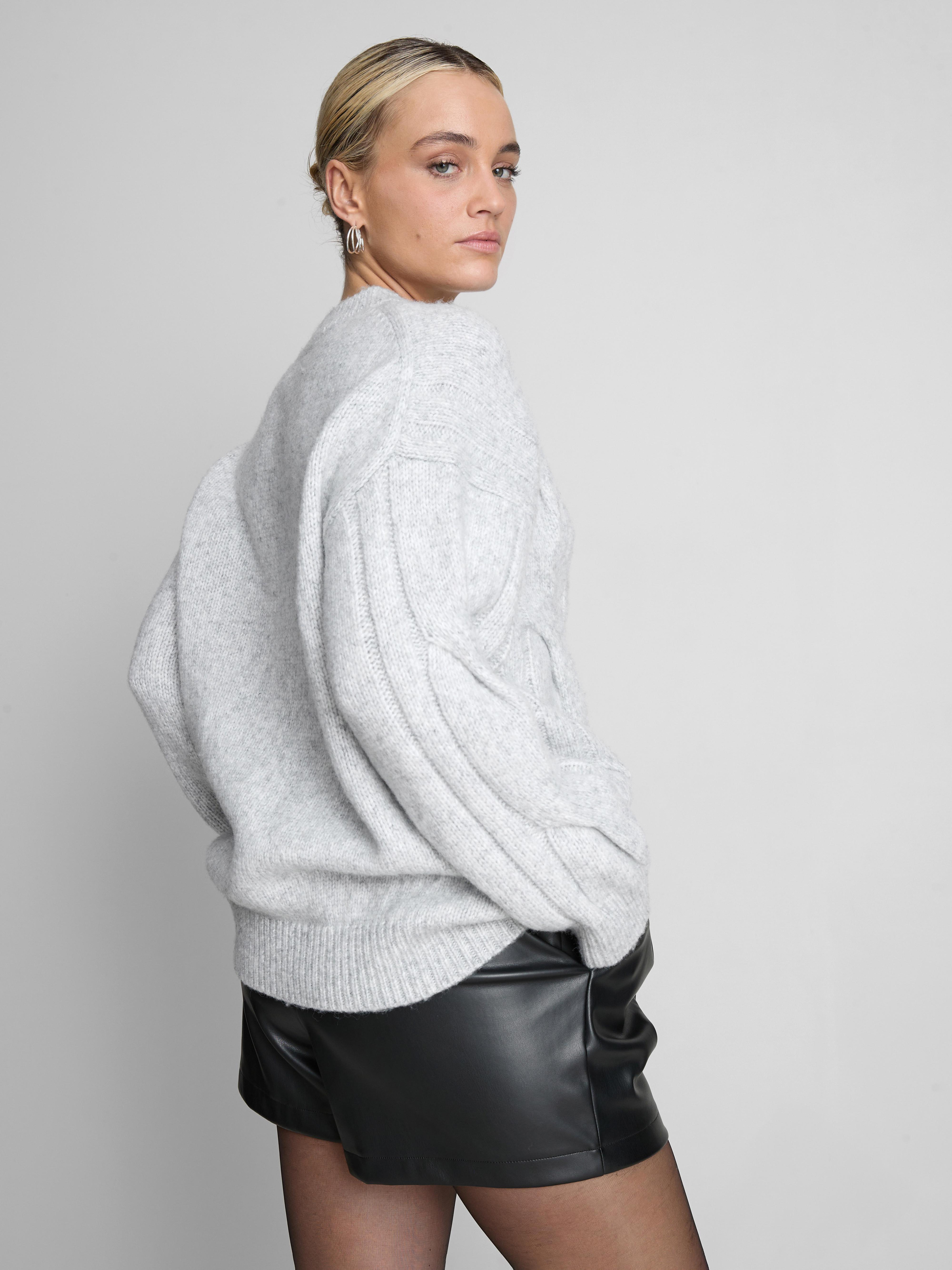 In a classic cable knit, this sweater has long sleeves, a crew neckline and an oversized fit