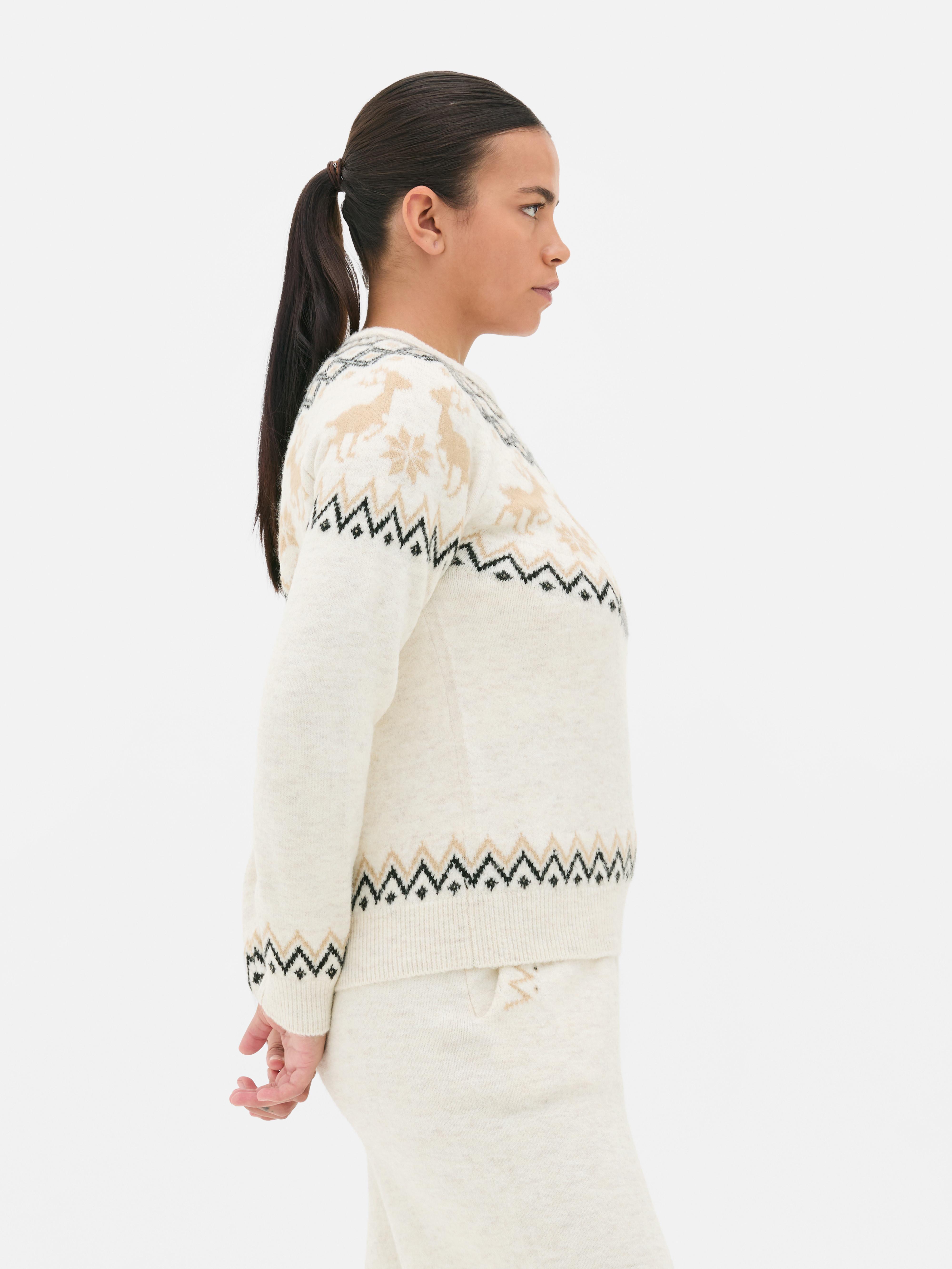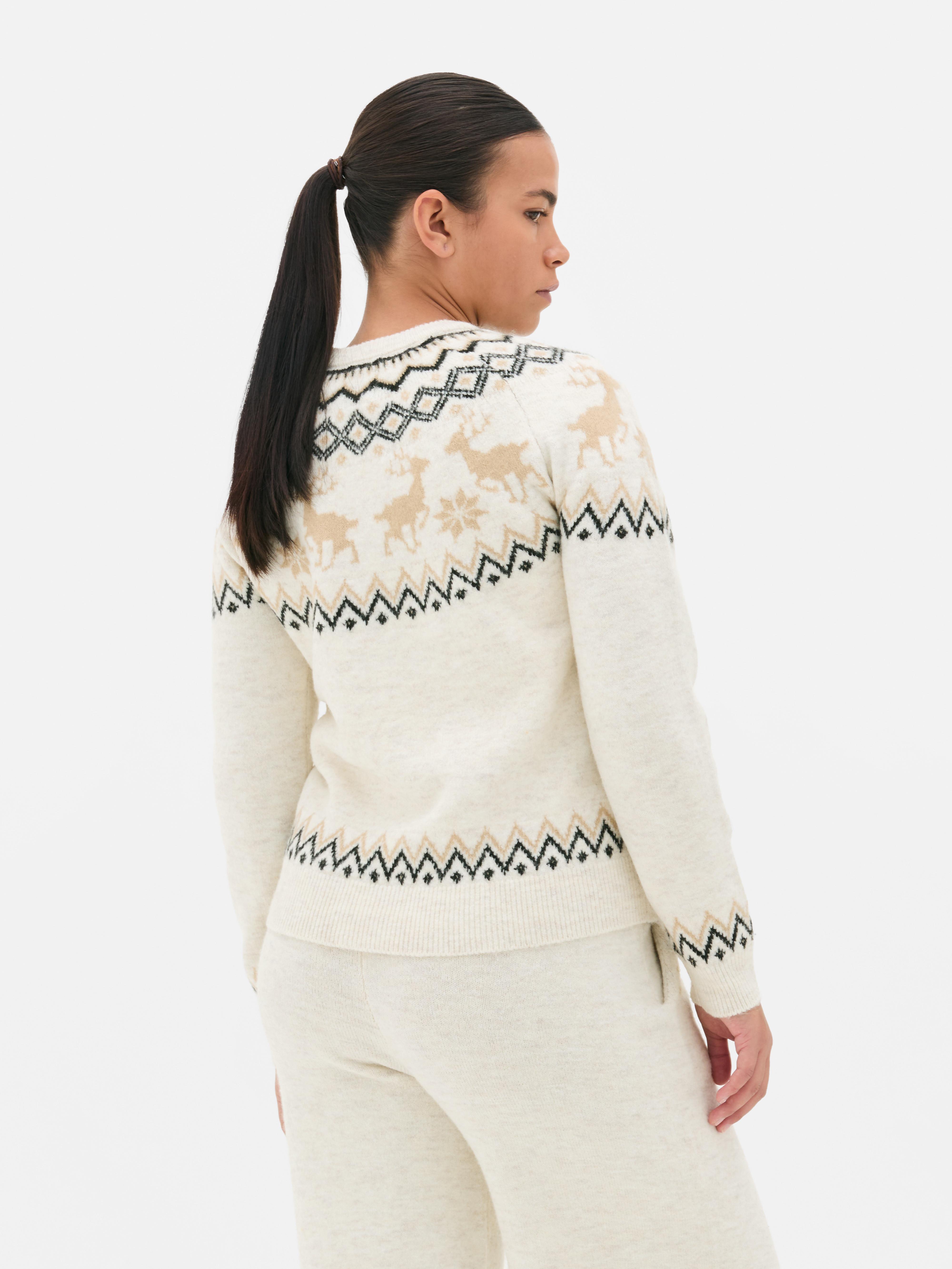 Get into the festive spirit with this Fair Isle Christmas jumper. Designed in a soft knit with a traditional reindeer and geometric pattern, it’s the perfect blend of cosy and seasonal. The ivory base is complemented by warm tones of beige, brown and black, giving it a timeless winter look. Complete with a classic crew neck, long sleeves and snug ribbed cuffs and hem, this jumper is all about comfort and warmth. Whether you’re wrapping presents, heading to a Christmas market or enjoying a festive film night, this knit keeps things merry and bright.