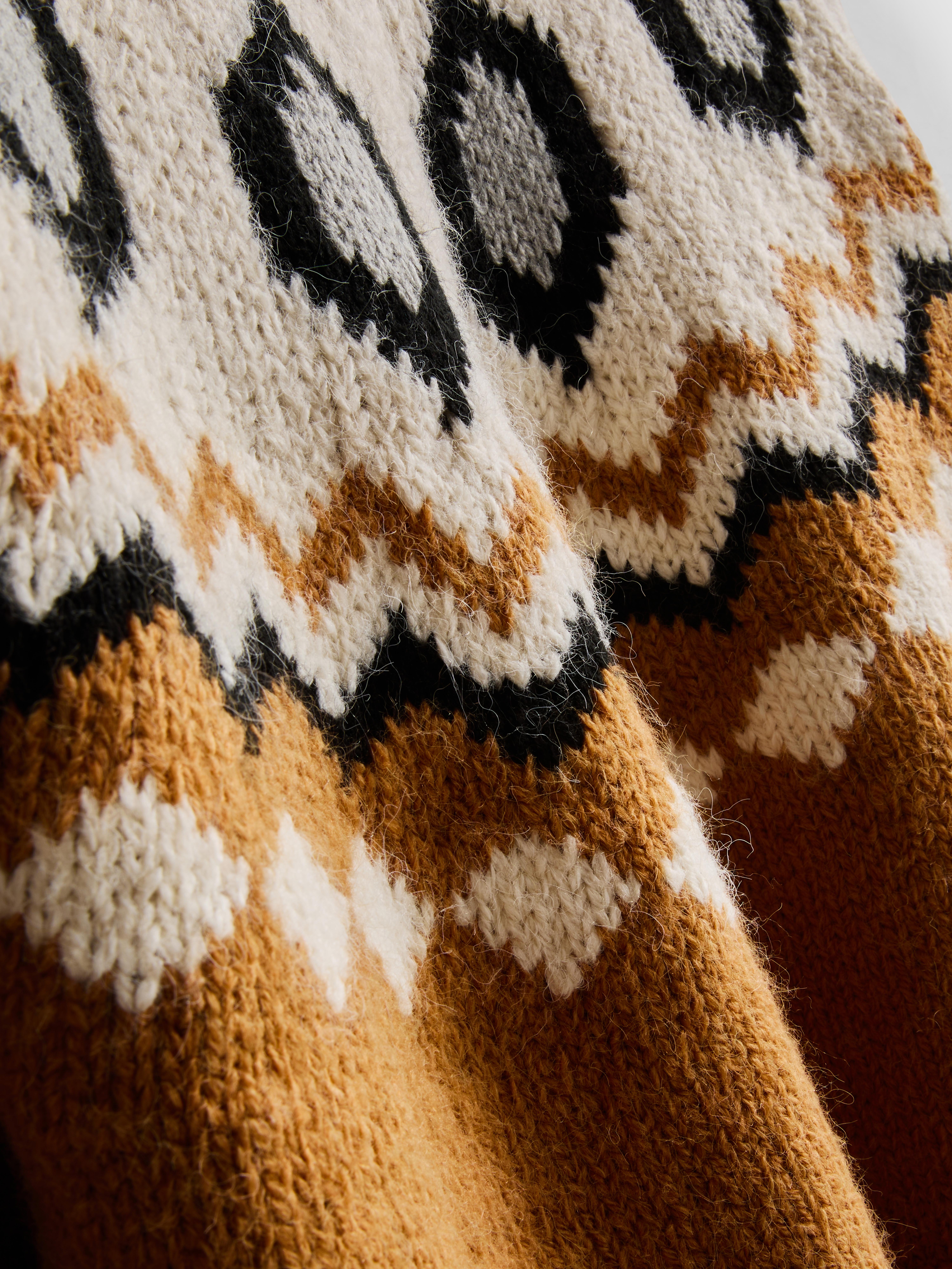 Wrap up in warmth and style with this gorgeous Fair Isle jumper. In a rich shade of mustard contrasted by neutral grey and black tones, it features a classic geometric Fair Isle pattern that instantly screams cosy vibes. The thick knit and snug cuffs make it a super warm pick! Pair this statement knit with distressed jeans and a pair of chunky black boots for a cool, vintage-inspired look. For a smarter twist, wear it with faux leather trousers and loafers. Your perfect jumper for coffee dates and winter walks!