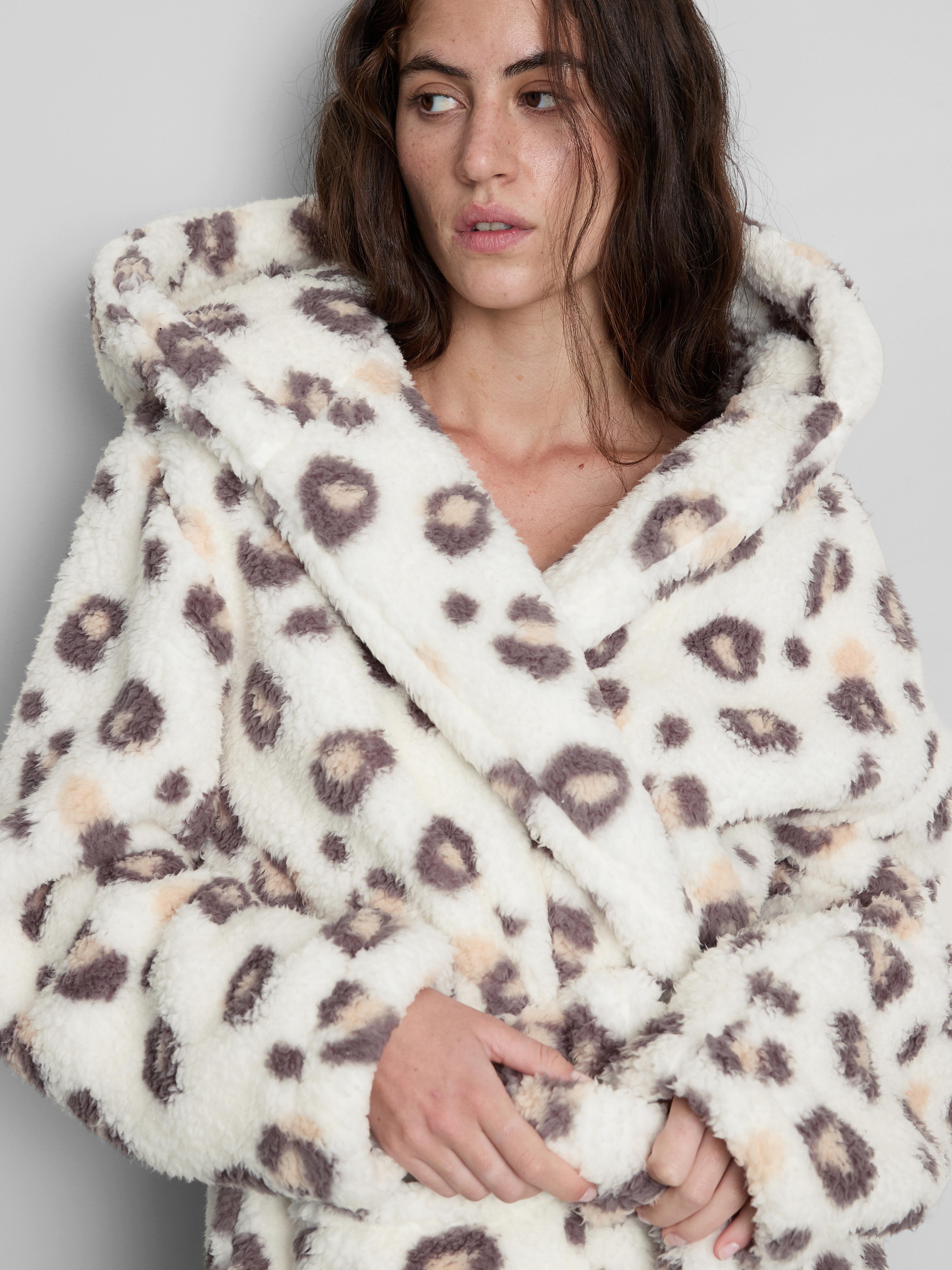 In a gorgeous borg fabric, this mid length dressing gown has a tie waist and hood and two front pockets