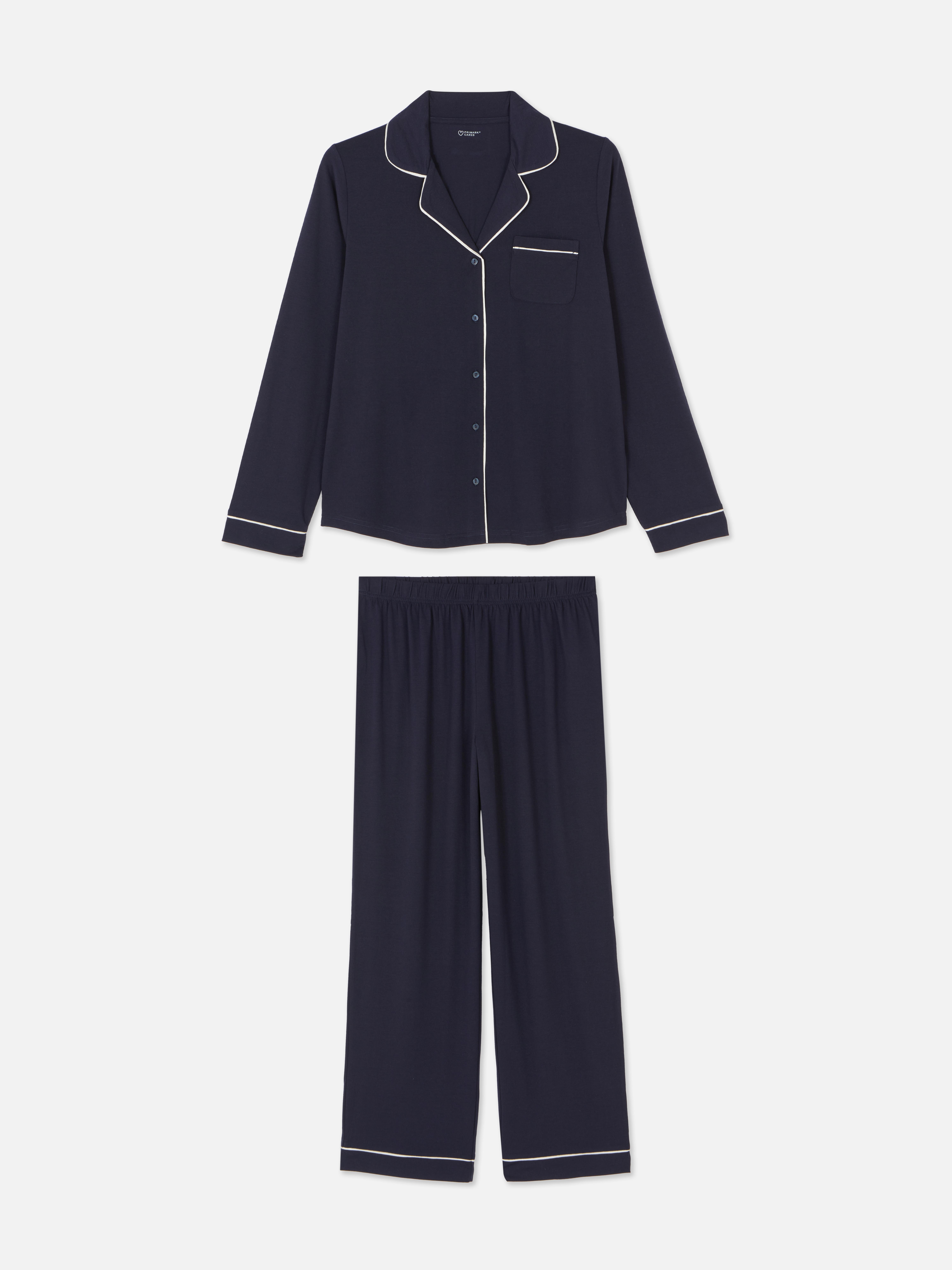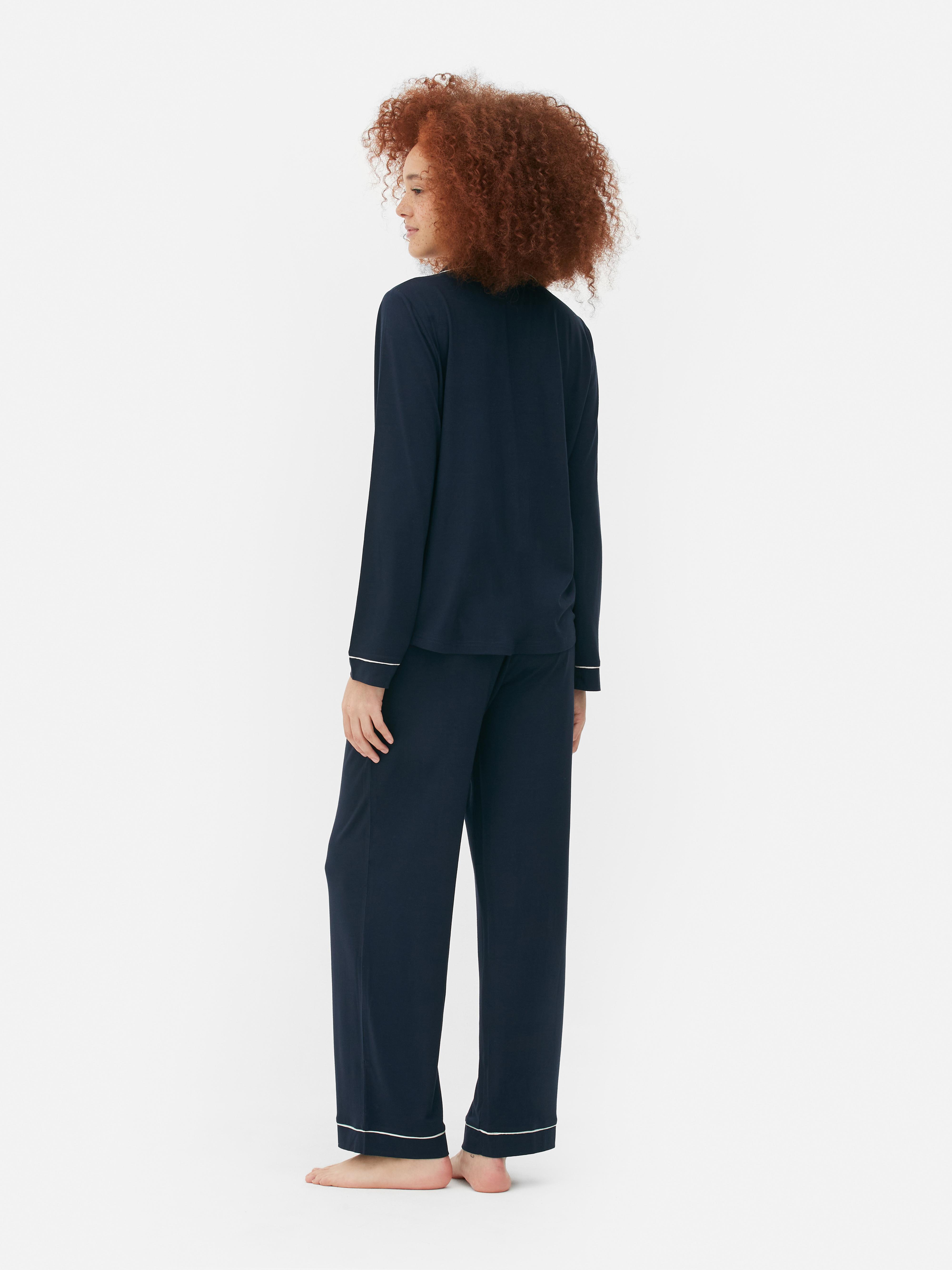 For nightwear that’s as stylish as your daytime wardrobe, you can count on these boyfriend pyjamas! Made from a soft jersey, the long sleeve top features a revere collar, button-up front and chest pocket for timeless charm. The coordinating trousers enjoy an elasticated waist that falls to a relaxed wide leg silhouette to offer a comfy wearing experience. Finished with classic contrast piping, you can layer these PJs with your fluffiest dressing gown for those moments you want to be extra toasty!