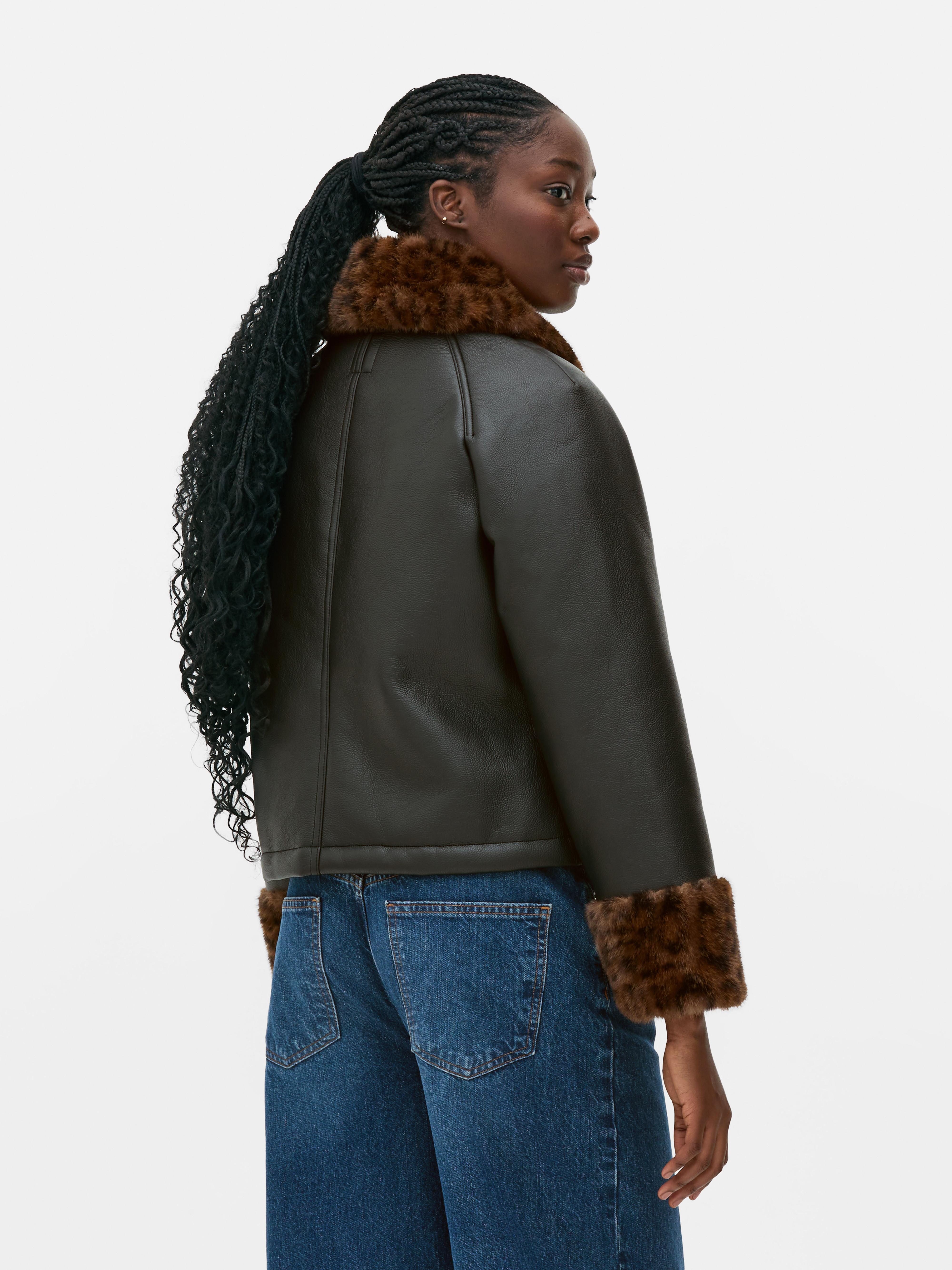 Leopard Trim Faux Leather Jacket