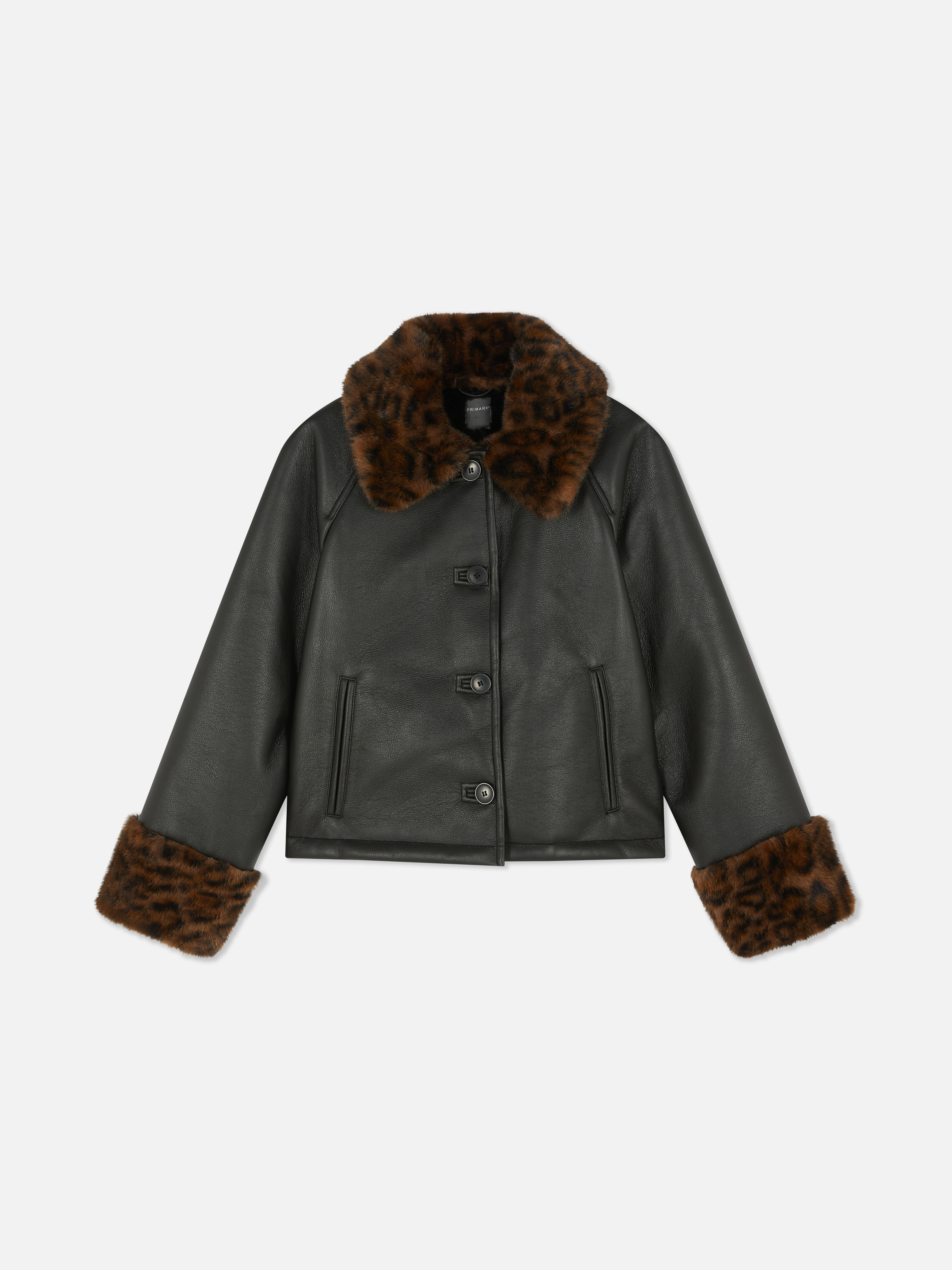 As fun as it is stylish, this faux leather jacket has a button front, two side pockets and is finished with a leopard faux fur trim on the cuffs and collar