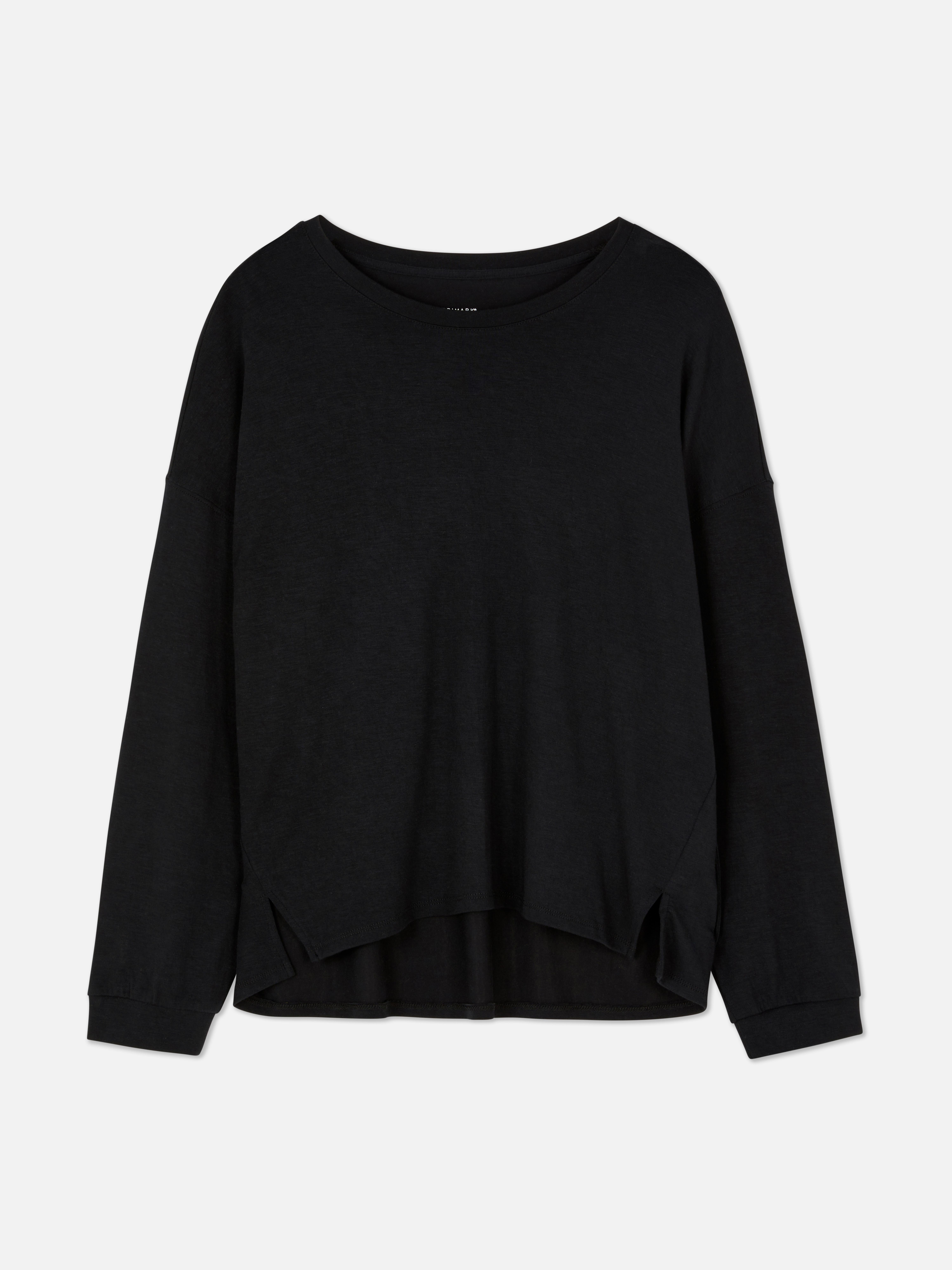Settle in for a comfy night with this black long sleeve sleep top. Made for easy evenings and slow mornings, it comes in a relaxed fit with a classic crew neck and long sleeves to keep you cosy. The soft fabric drapes gently, helped by a slightly dropped back hem and small side slits that add to the easy feel. Pair it with the matching bottoms for a fit that is ready for movie nights and early coffees.