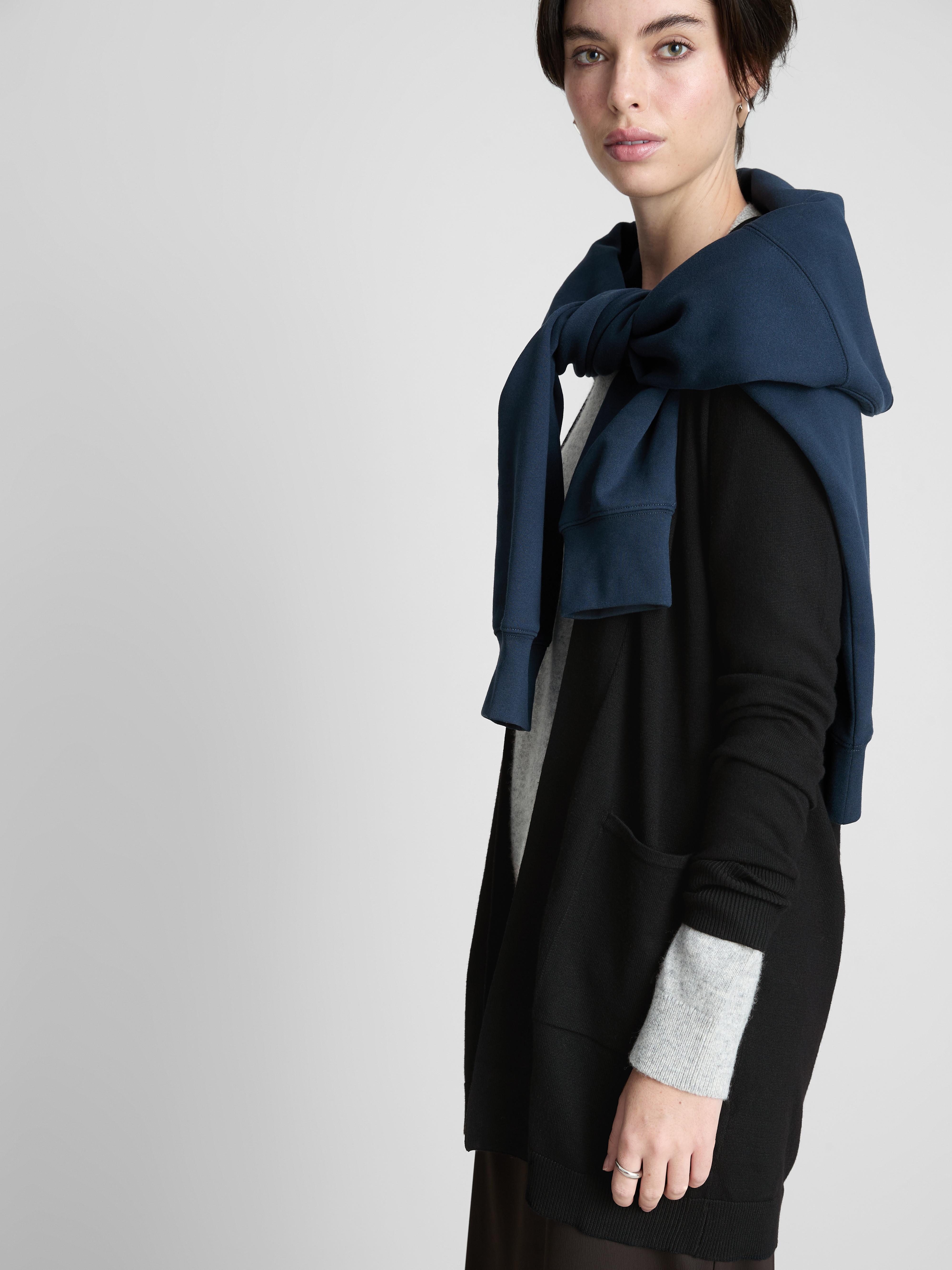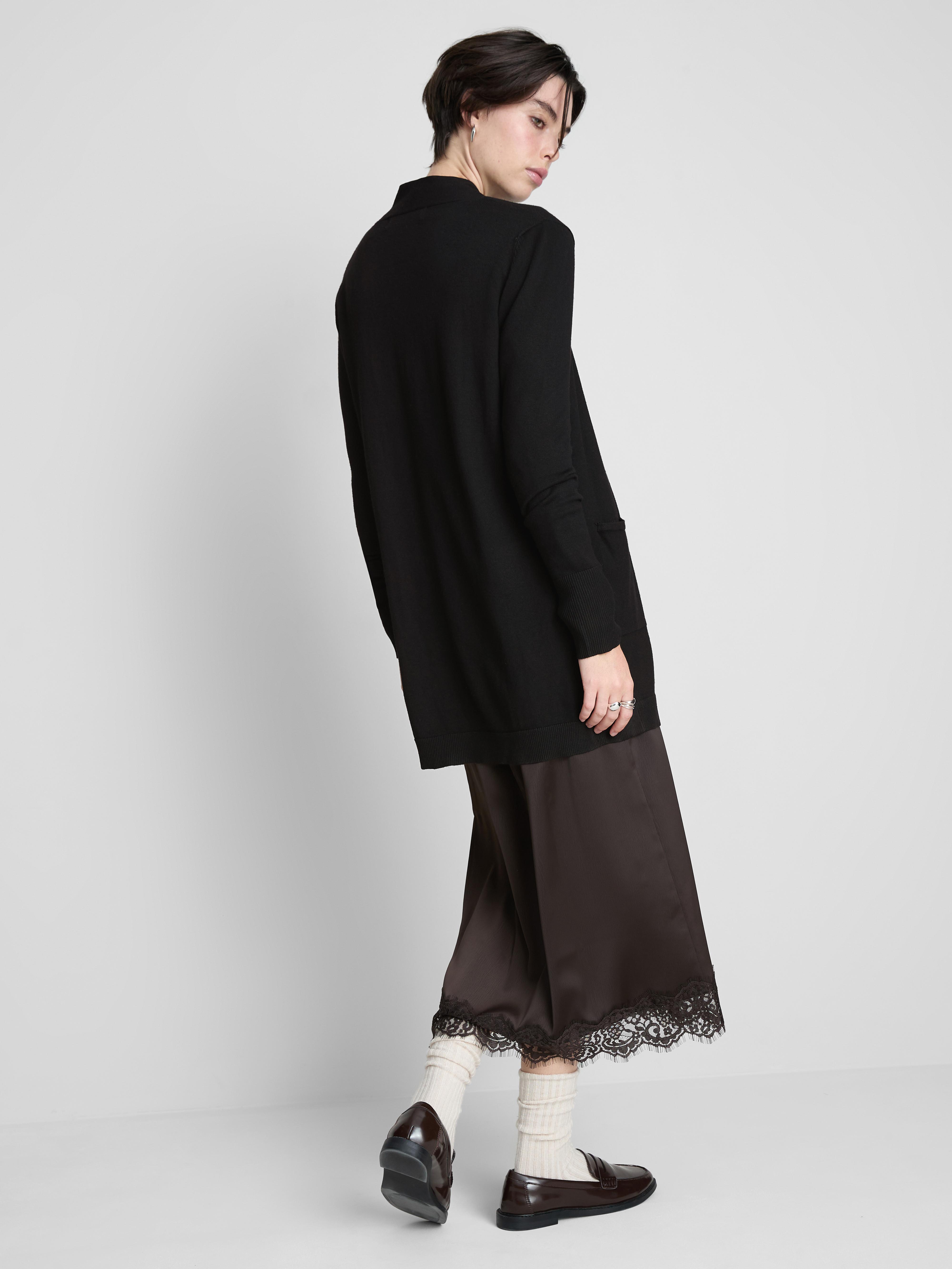 Slip into this longline waterfall cardigan for an easy extra layer that works any day of the week. Its open front falls smoothly for a clean, draped look, while the mid-thigh length adds simple coverage. Made from a fine-gauge knit, it feels soft and lightweight with a neat finish. Set-in sleeves keep the shoulders looking tidy, and two roomy patch pockets add practical touches. In classic black, it’s a go-to piece for simple comfort and effortless style.