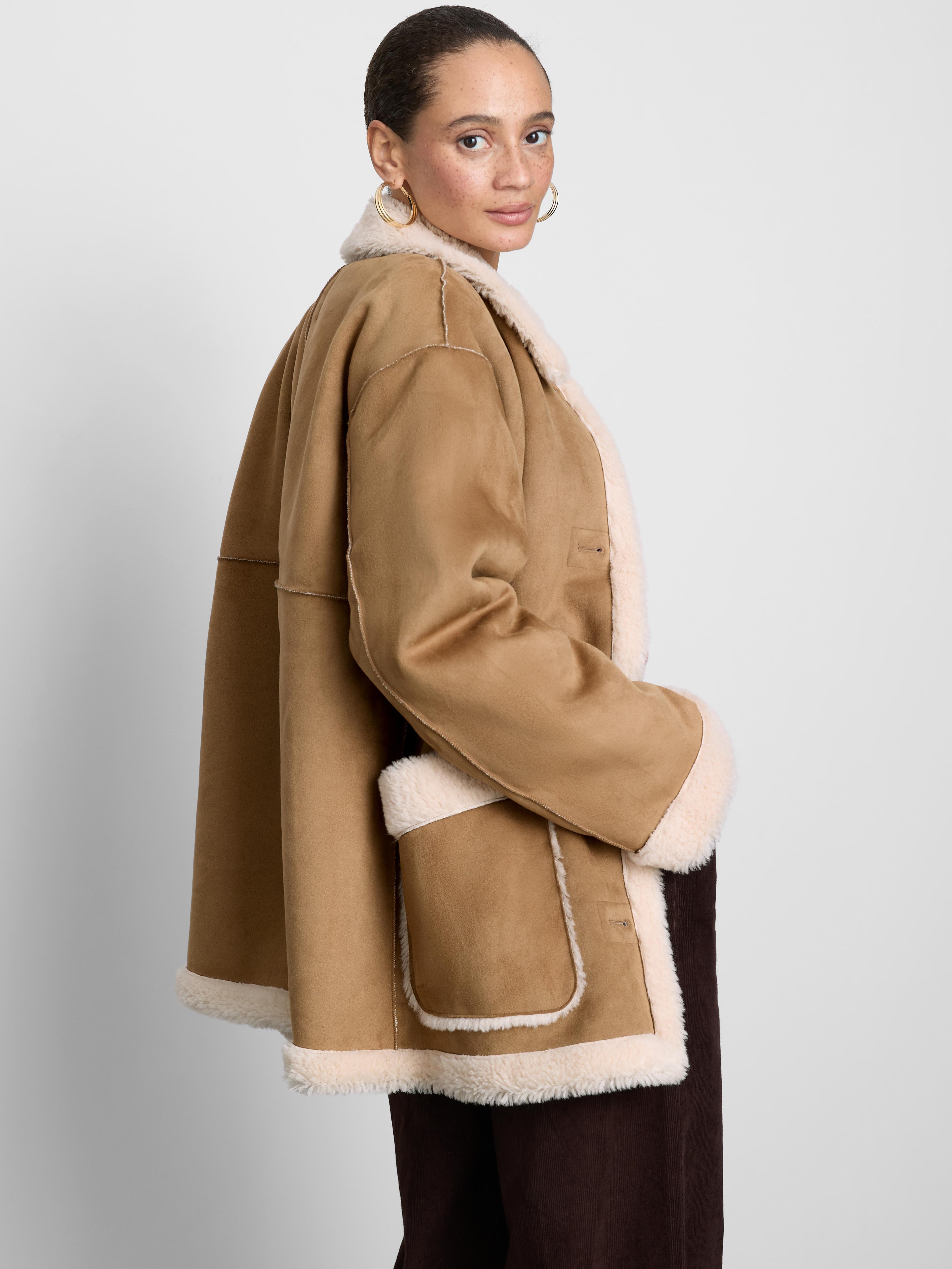With a shearling lining, collar and trims, this coat comes in a relaxed fit with two patch pockets
