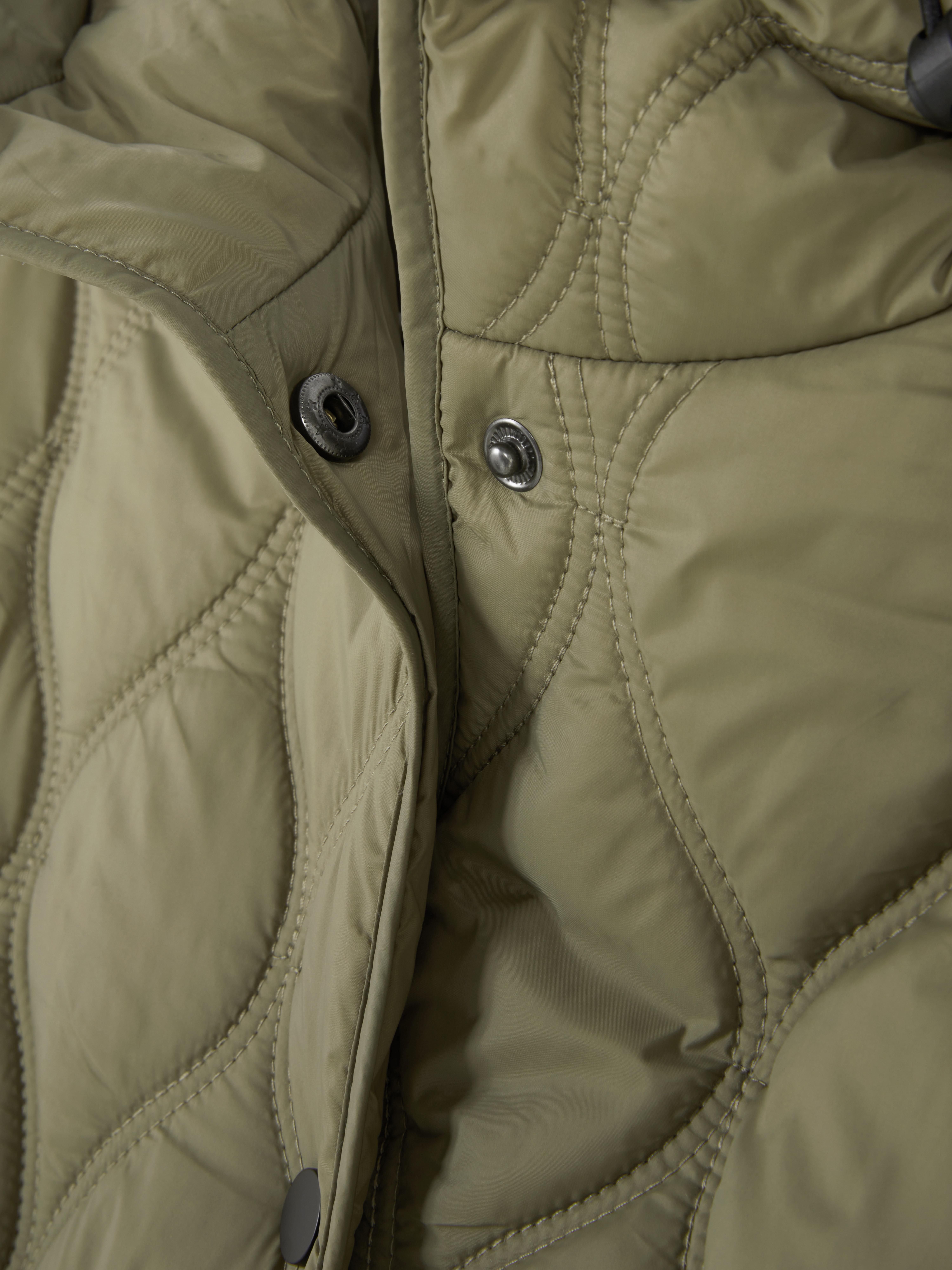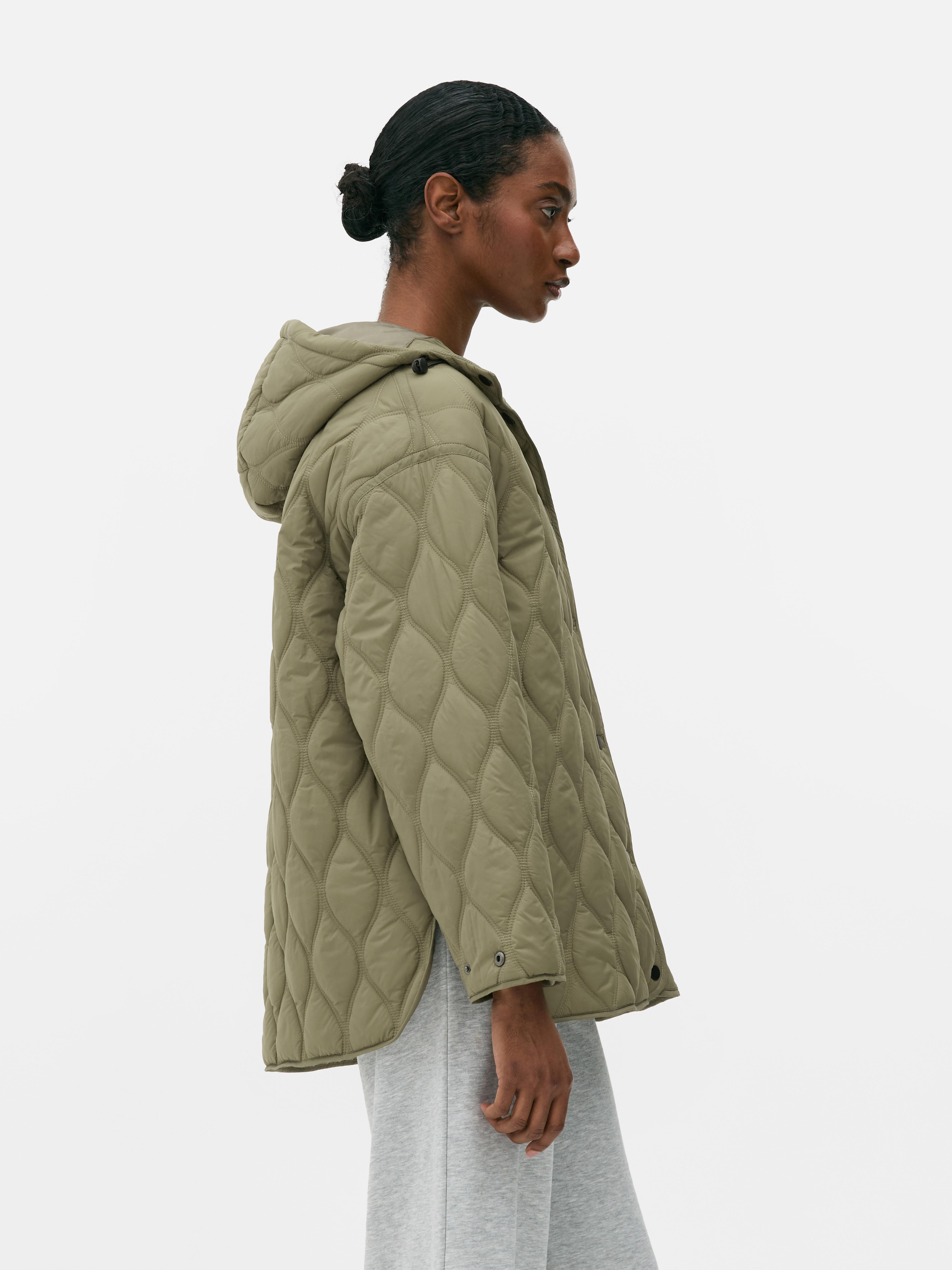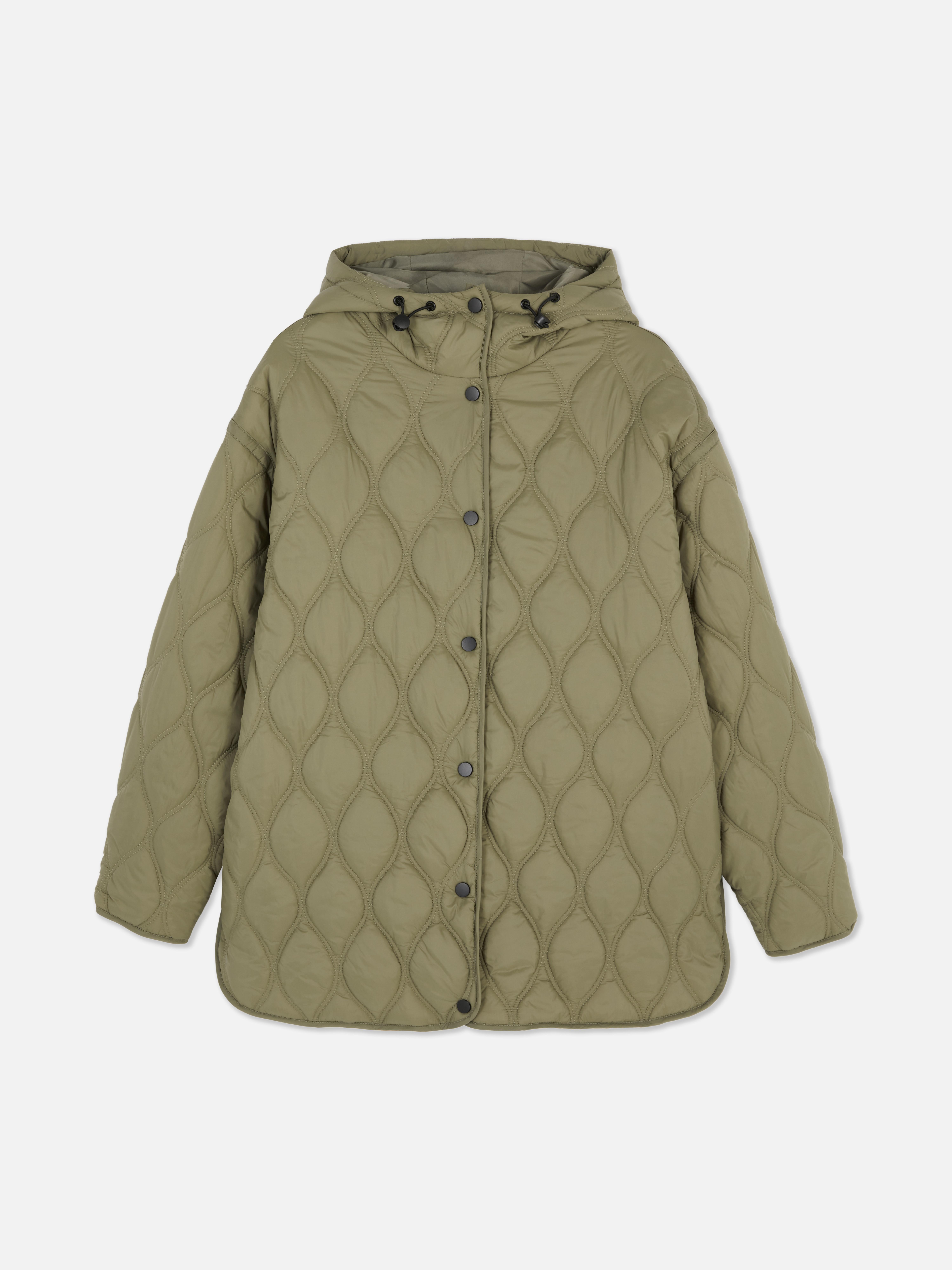 Wrap up without the bulk in this khaki quilted hooded coat, made for cool days and easy layering. Designed in a relaxed, oversized fit with soft padding and a diamond quilt pattern, it brings warmth without feeling too heavy. The high neckline and hood help keep the chill out, while the snap-button closure and side seam pockets add practical touches. Finished with long sleeves and a gently rounded hem, it’s the kind of coat that’s comfy, cosy and always ready to go.
