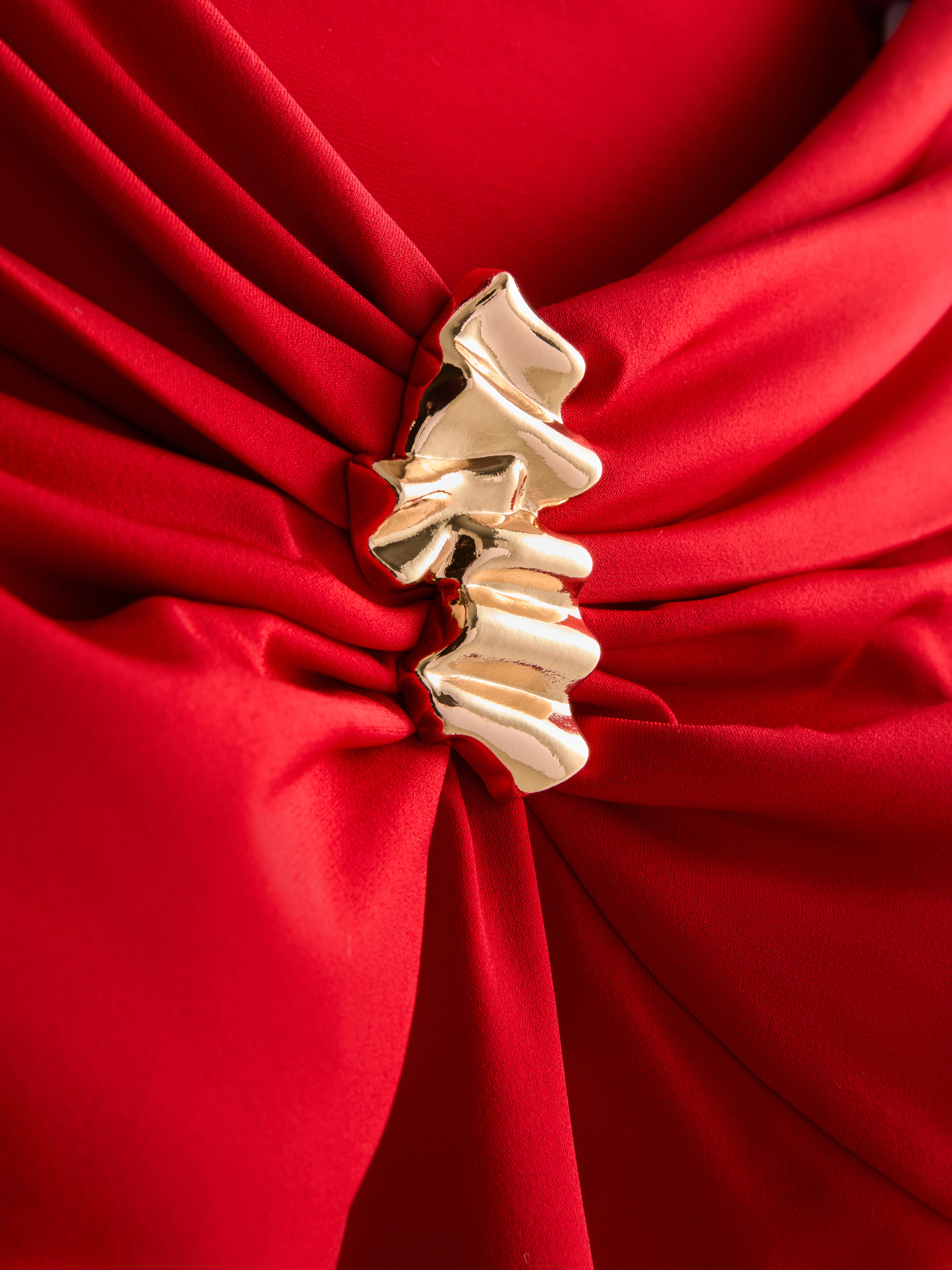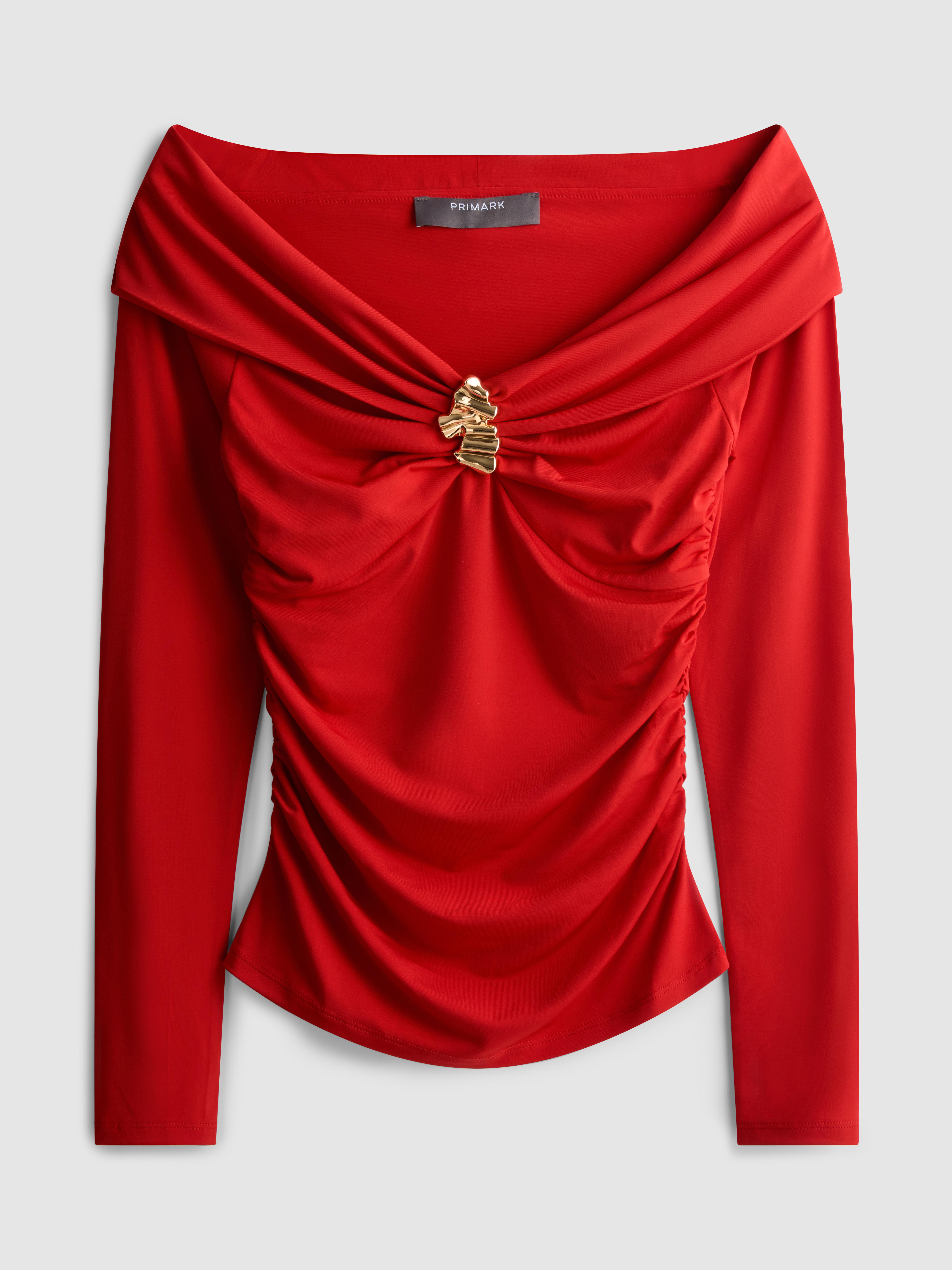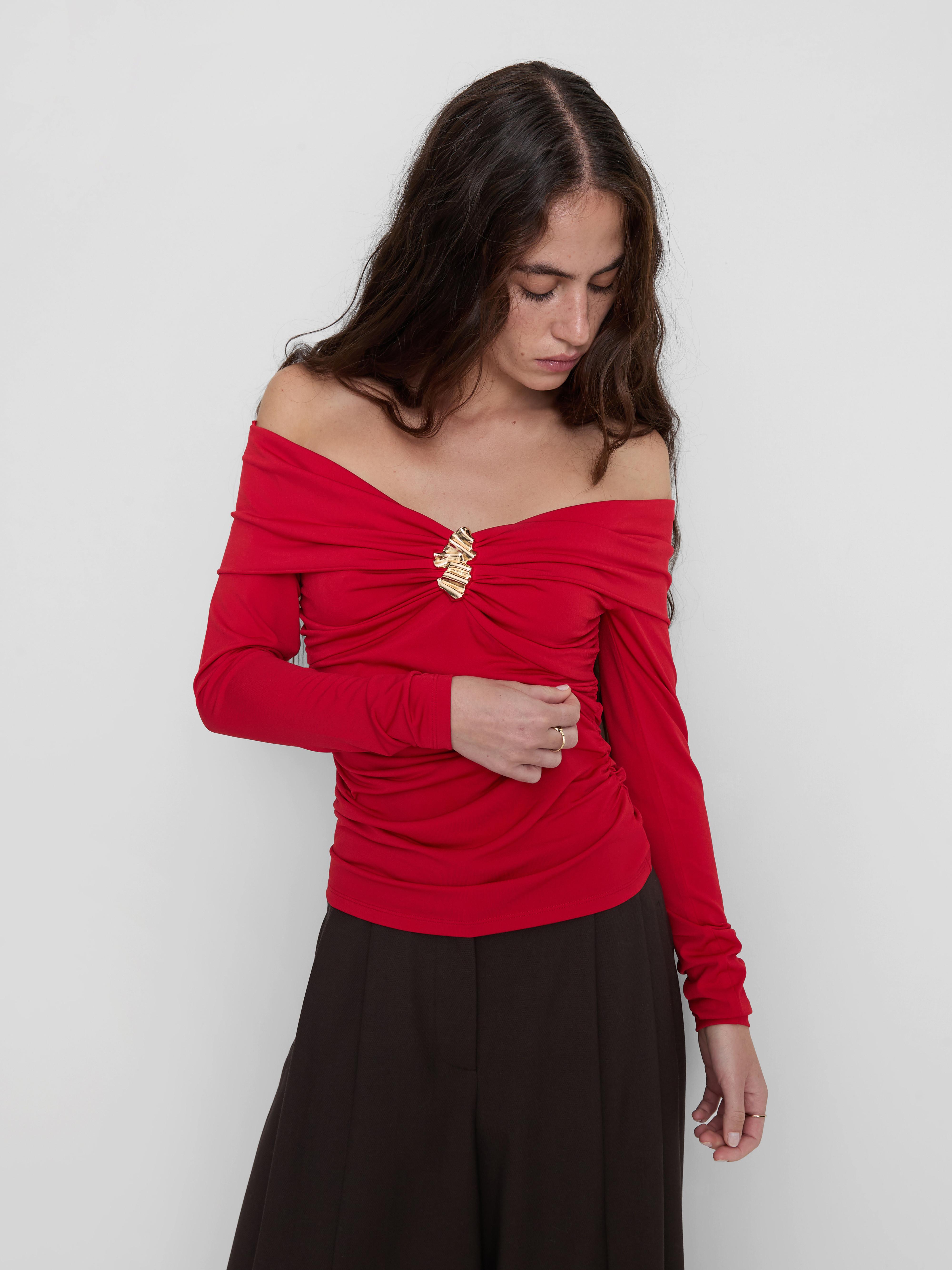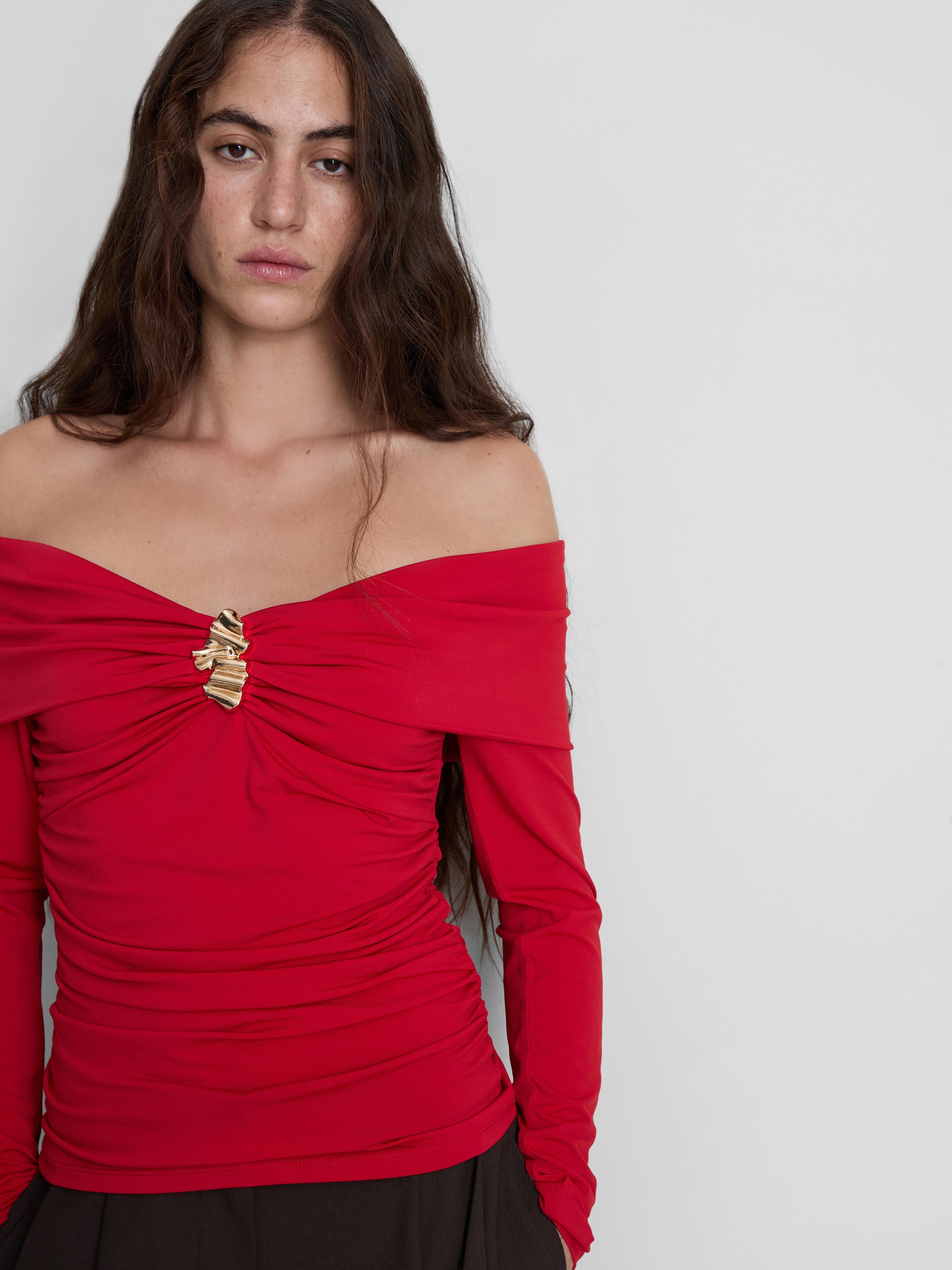 Long sleeve Bardot top with ruched sides and metallic hardware on the center front
