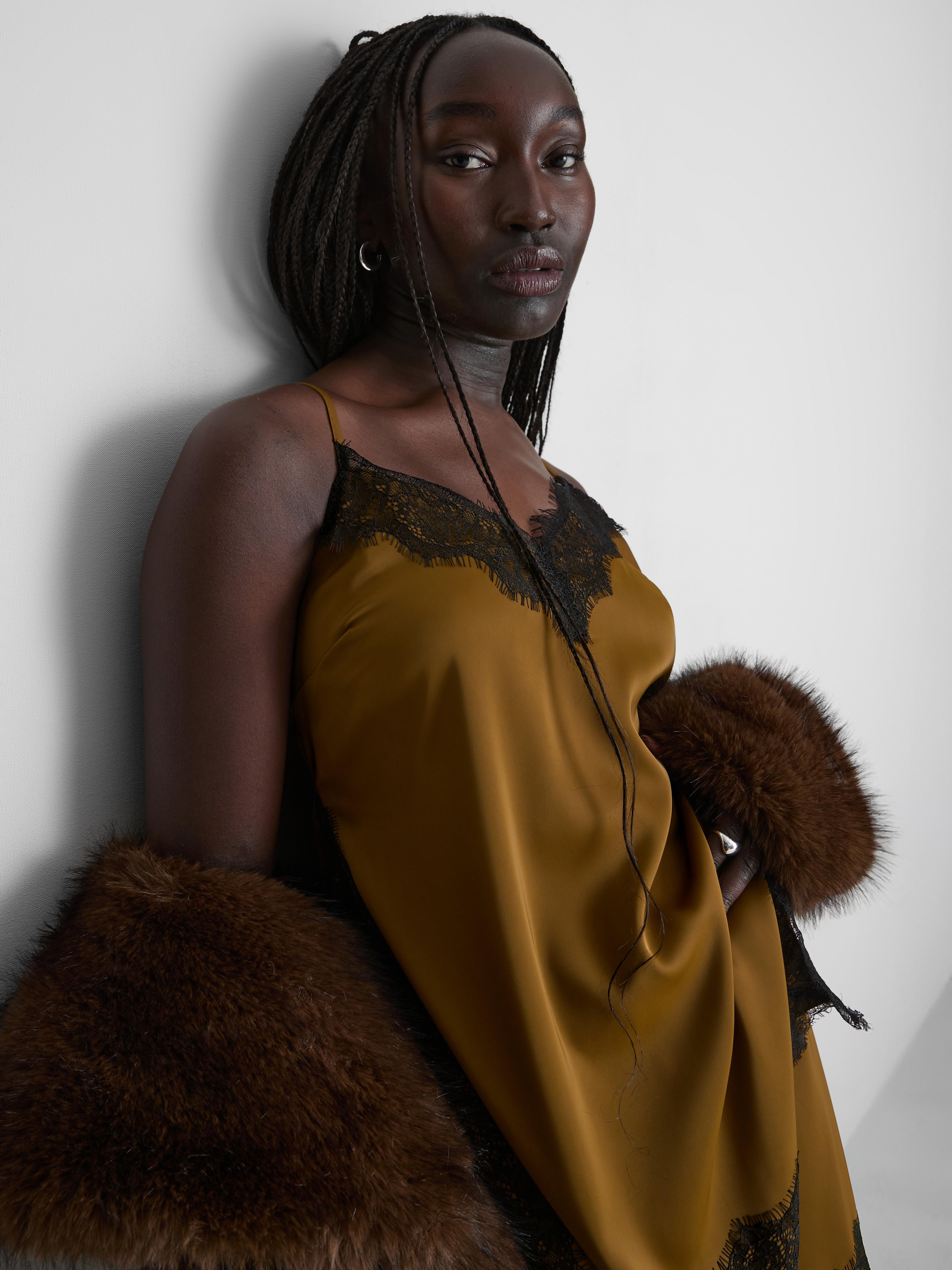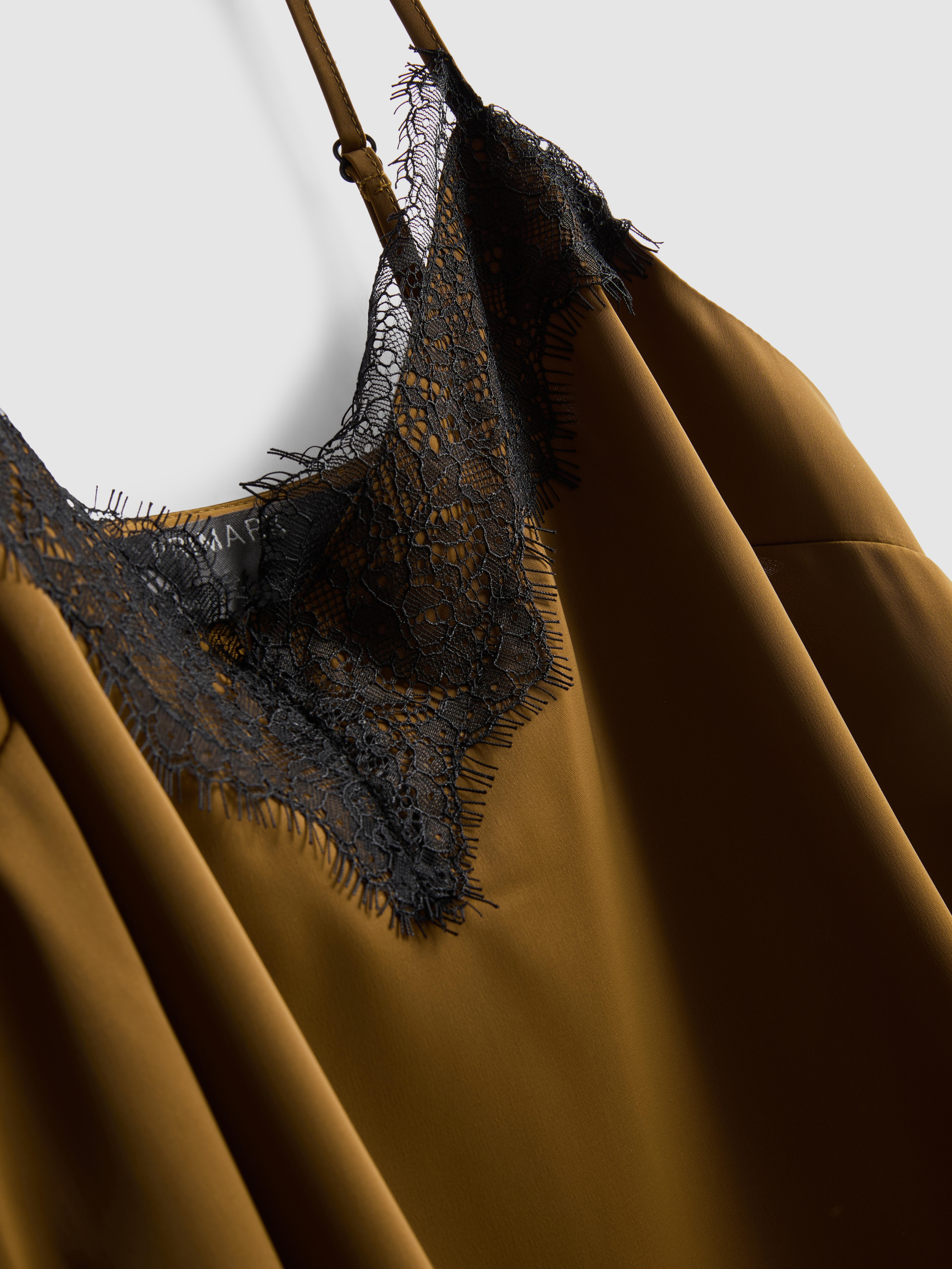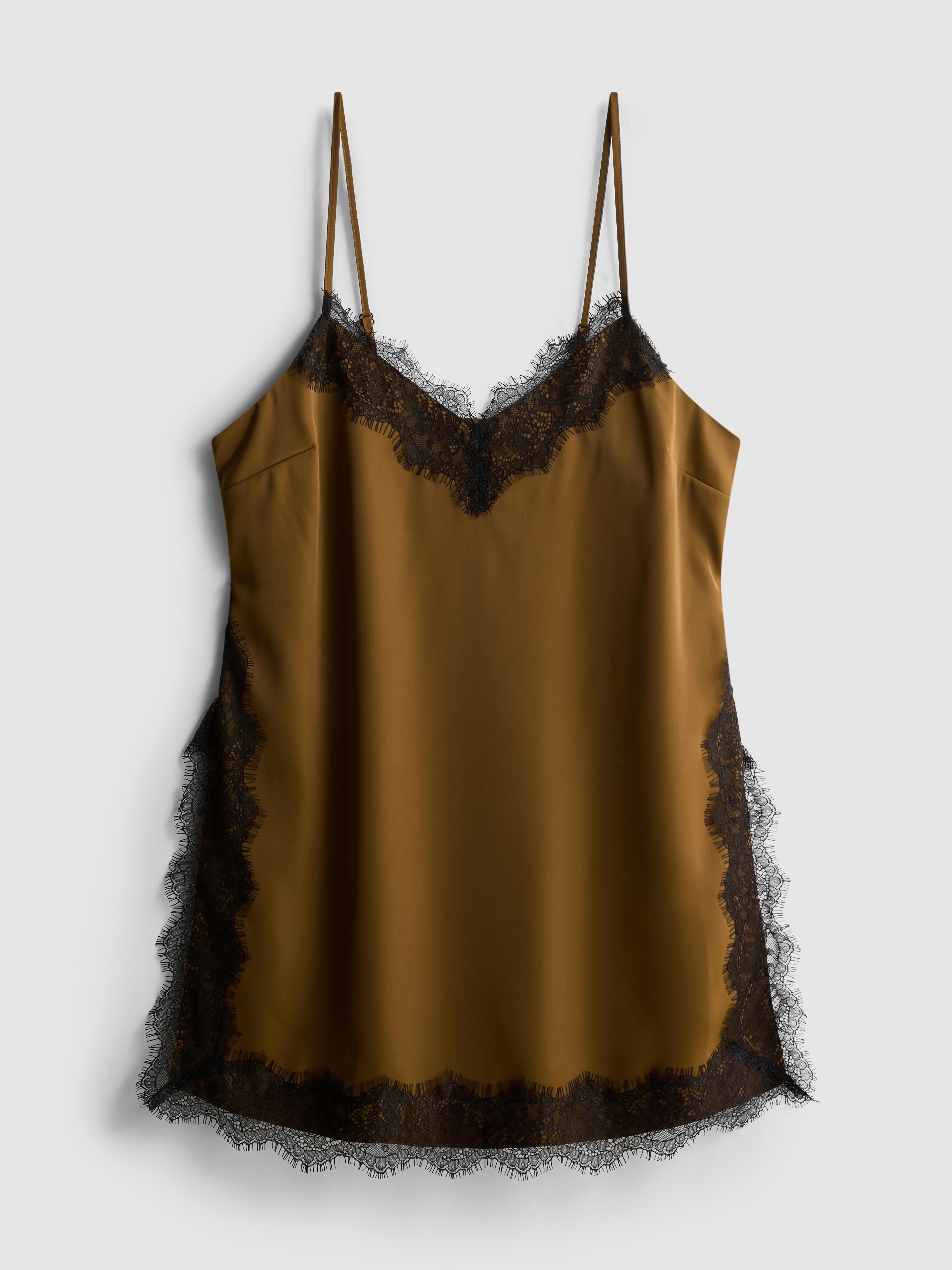 In a satin texture, this cami top has a scoop neckline, spaghetti straps, and a lace trim design