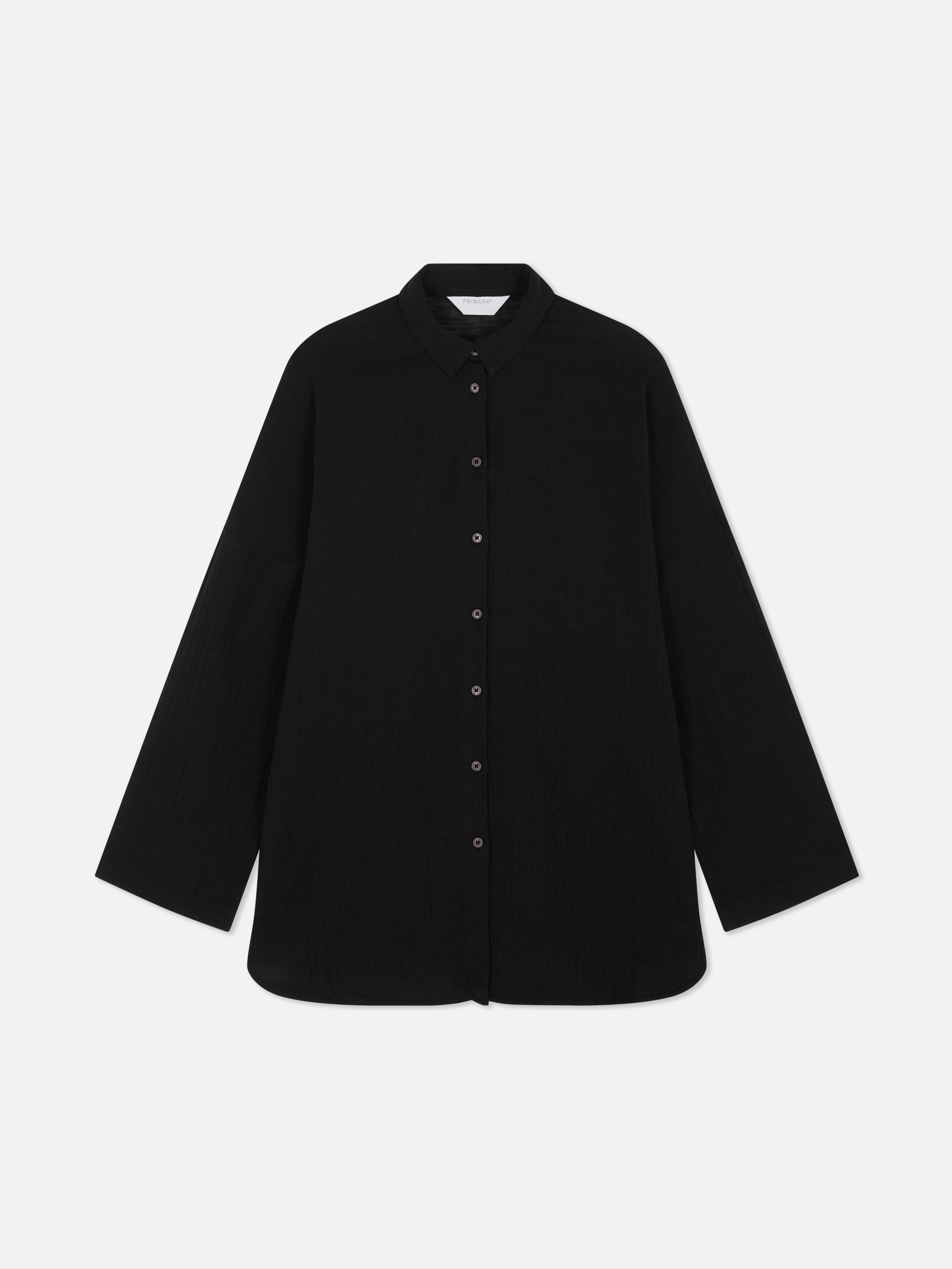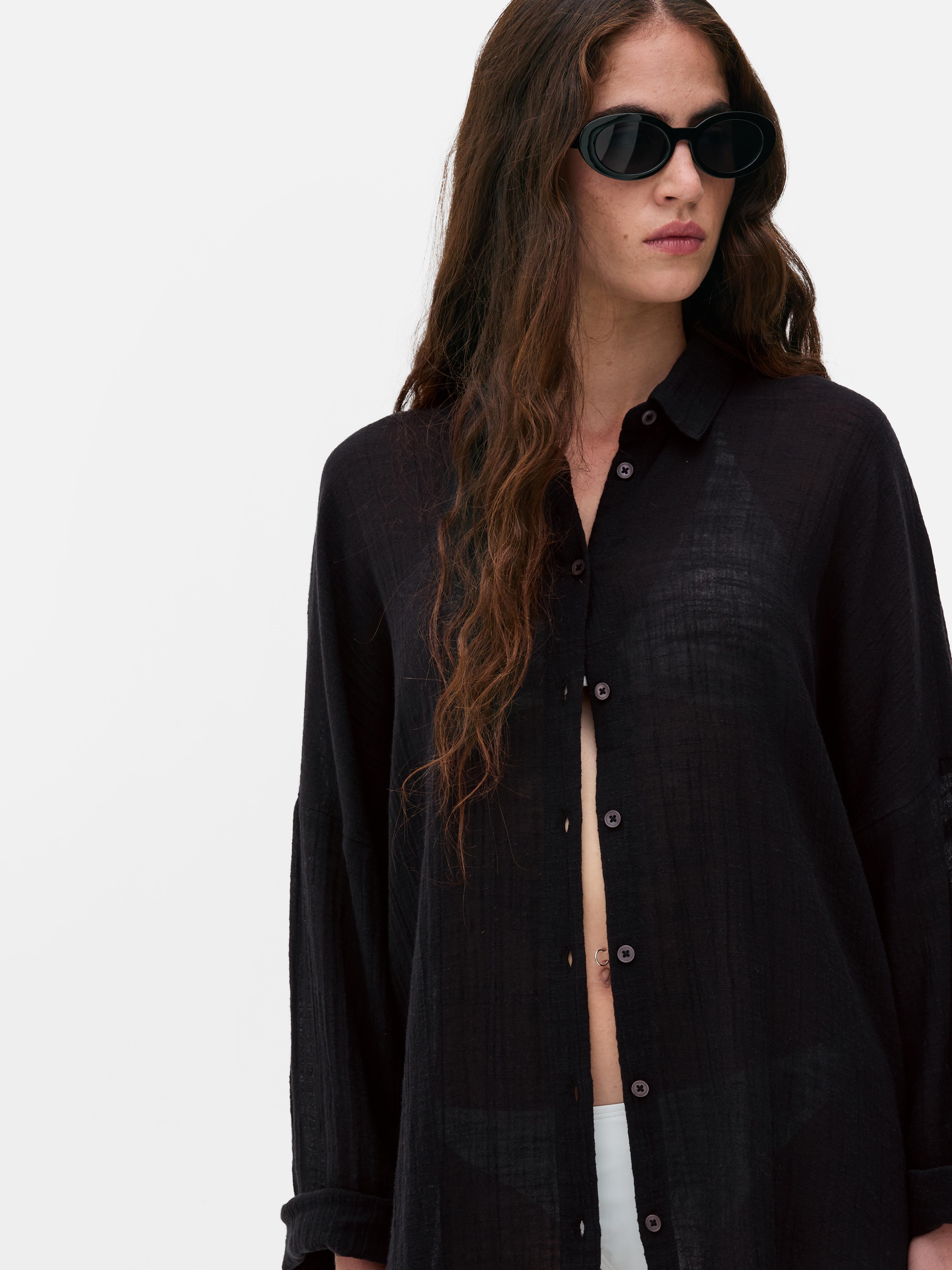 The ultimate cover-up—this beach shirt comes in a relaxed fit, with a curved hem and a slightly sheer material
