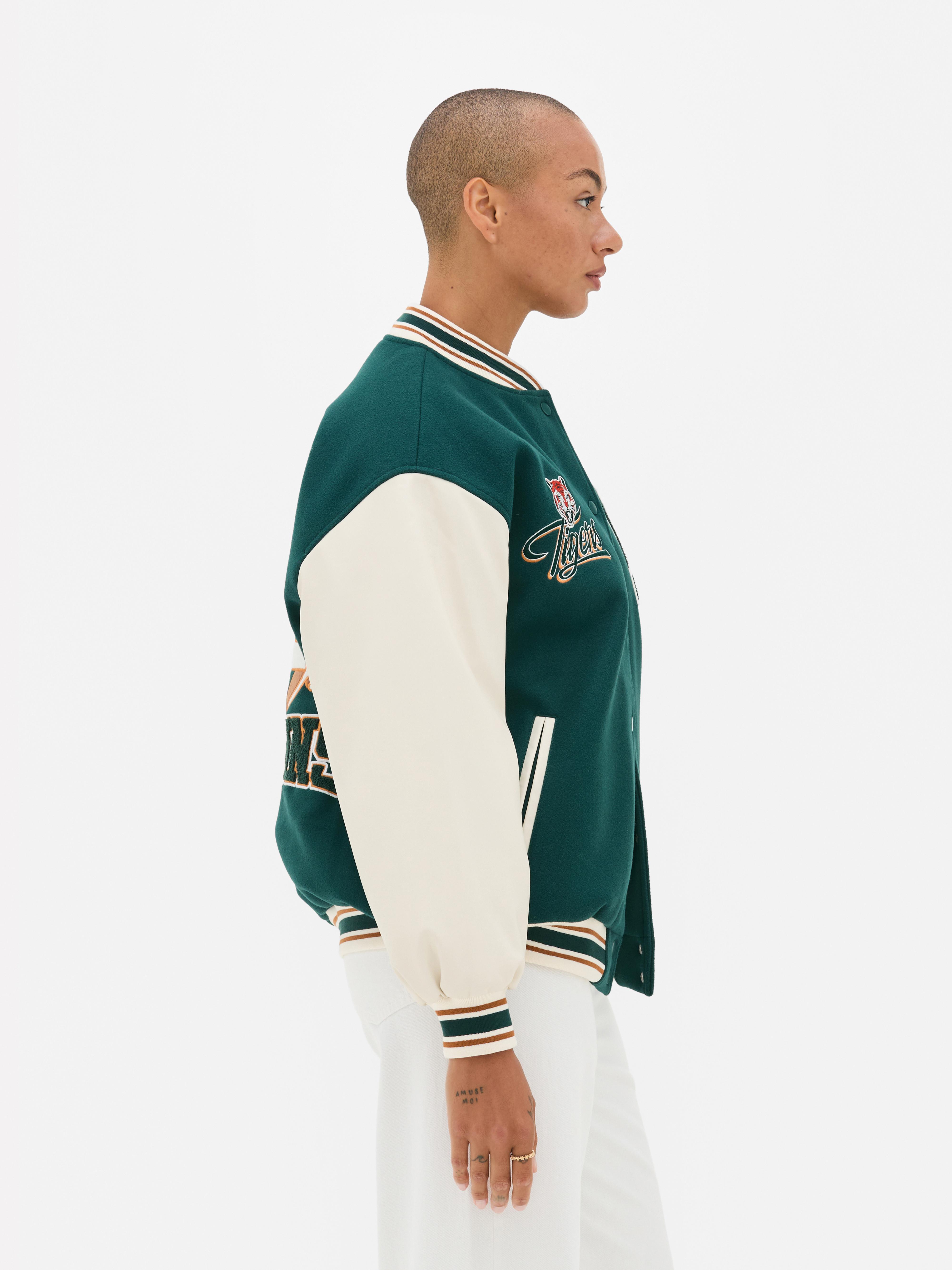 Channel varsity style with this Stranger Things Hawkins Tigers bomber jacket. The dark green body contrasts with off-white sleeves for a classic collegiate look, while striped ribbed trims in green, white, and maroon add a bold finish. A button-up front with snap fastenings makes it easy to wear, and the patches on the chest give it true team spirit—one with a large “H” and the other with a tiger head and “Tigers” lettering. On the back, a statement tiger crest graphic with laurel wreath, banner, and “1987 Hawkins” design completes the look. Cut in a relaxed, oversized fit for layering.