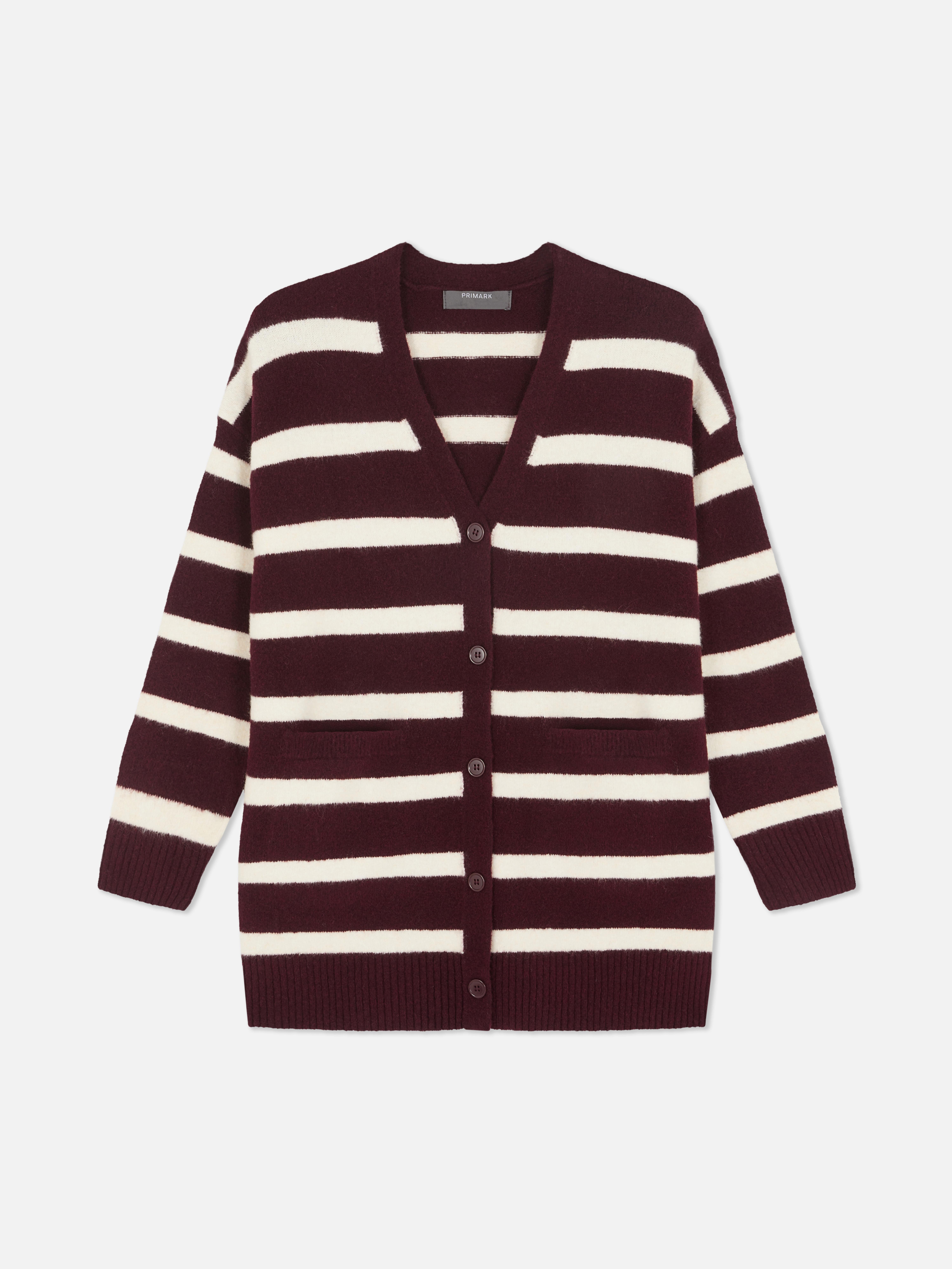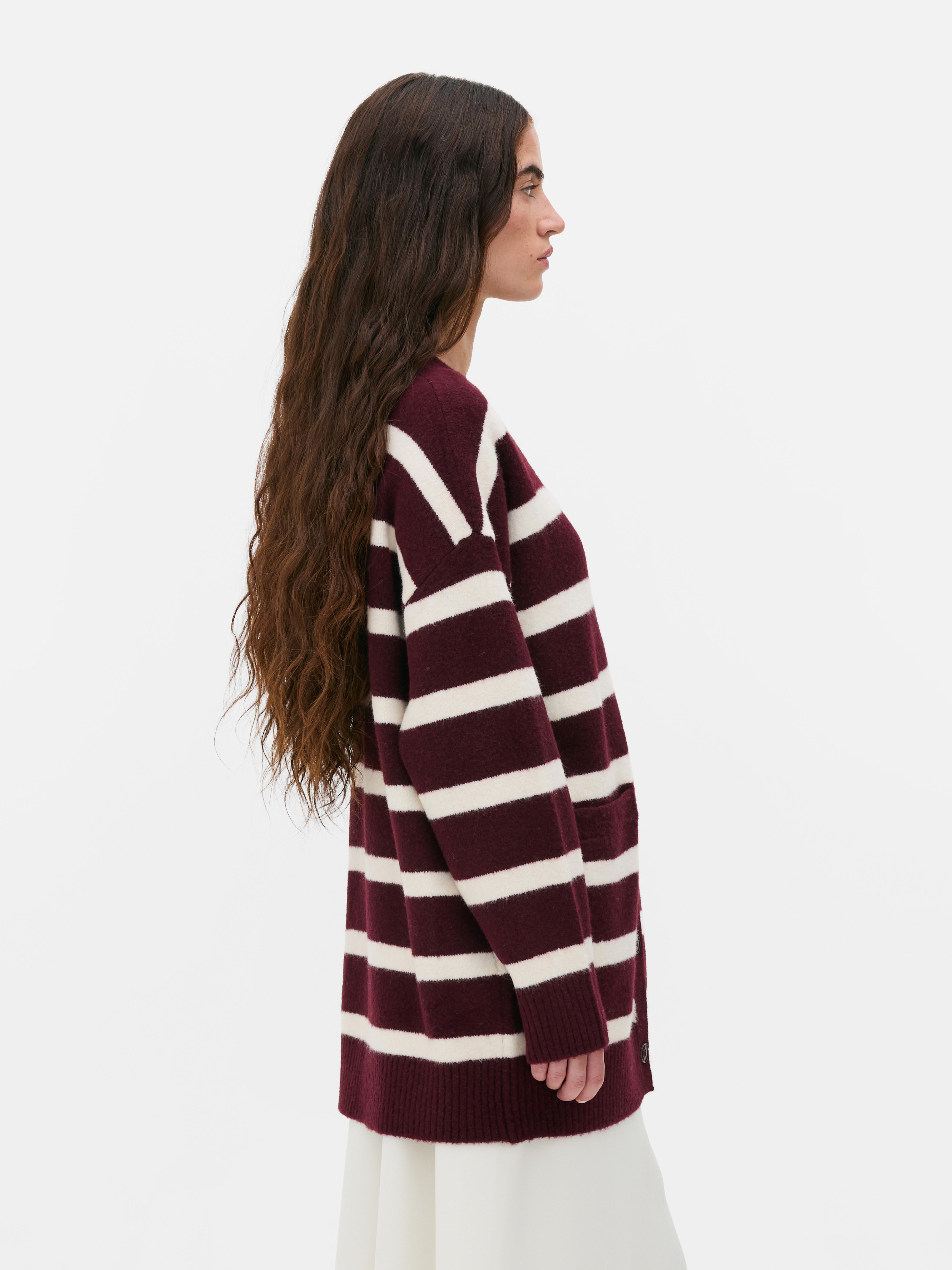 Wrap up in comfort with this striped longline cardigan. Designed with a button front and a relaxed V-neckline, it comes in an oversized fit with long sleeves for a cosy, easy feel. The soft knit is patterned with horizontal stripes in burgundy and cream, adding warmth and texture to the look. Two handy front pockets bring a practical touch, while the midi length gives it extra coverage. Perfect for layering, this cardigan is a versatile piece you’ll reach for again and again.