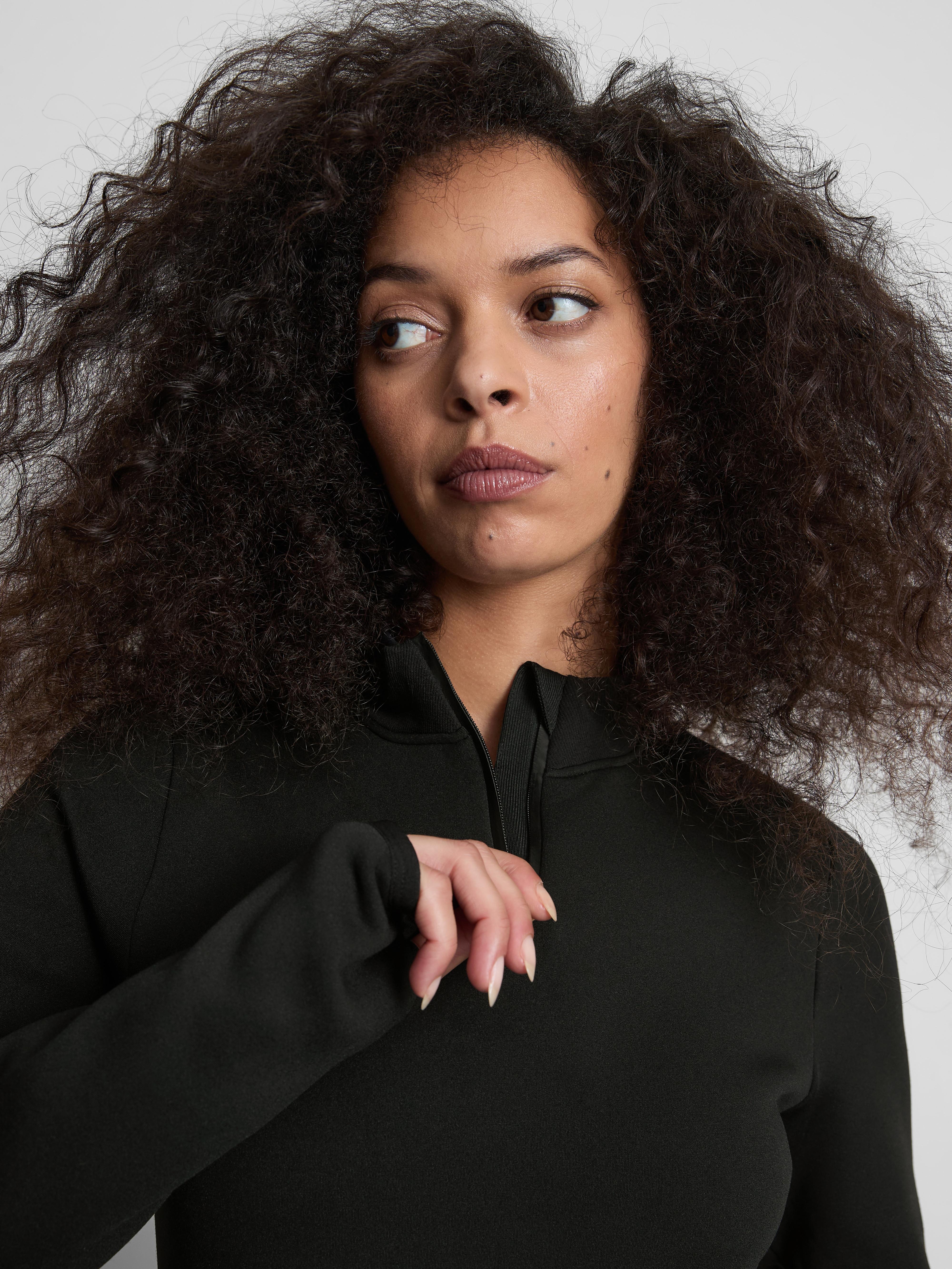 Made in a velvet plush texture to keep the heat in, this top comes in a long sleeve, high neck design with a quarter zip