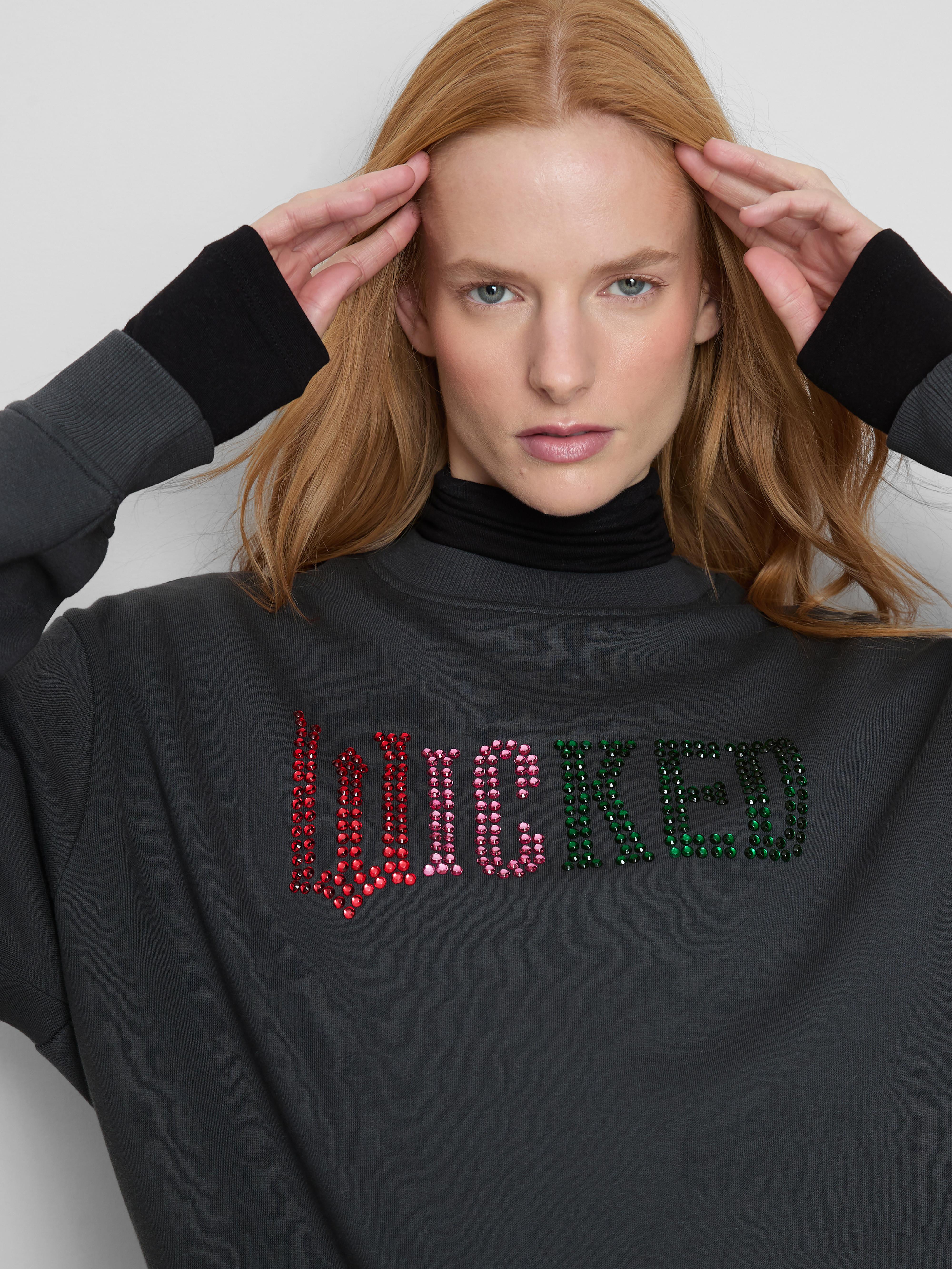 Add a little sparkle to your wardrobe with this Wicked The Movie Cotton Blend Diamanté Sweatshirt. Made in a dark charcoal grey cotton blend, it’s designed with a relaxed fit, classic crew neck, and ribbed trims for an easy, comfy feel. The chest showcases a bold “WICKED” logo embellished with pink, red and emerald rhinestones — a nod to Glinda and Elphaba’s iconic colours. A magical pick for fans of the hit musical and film alike.