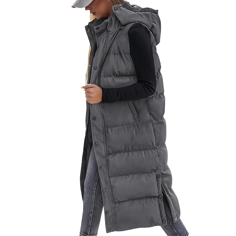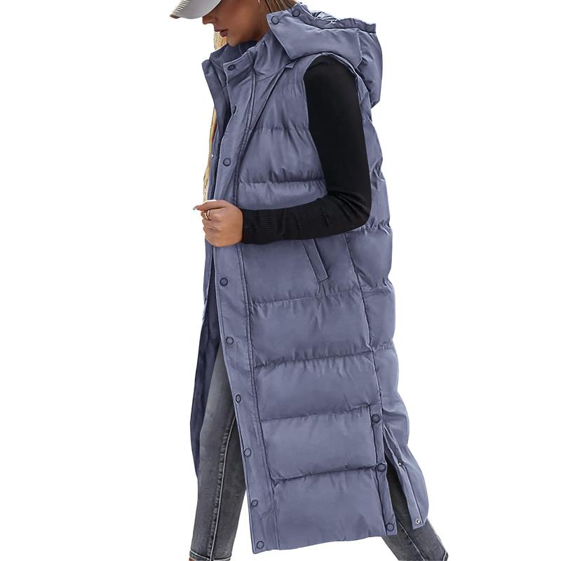 Women's Long Puffer Vest with Quilted Hood and Button Down Closure for Winter Coat 2025 - Tops, Womenswear