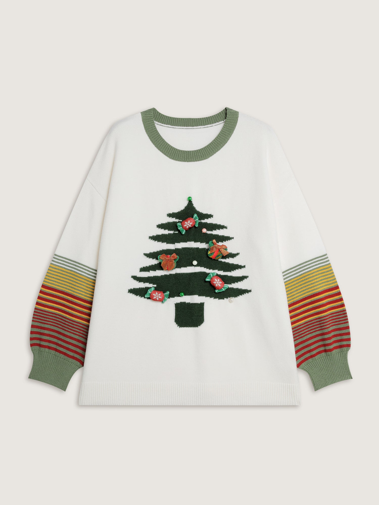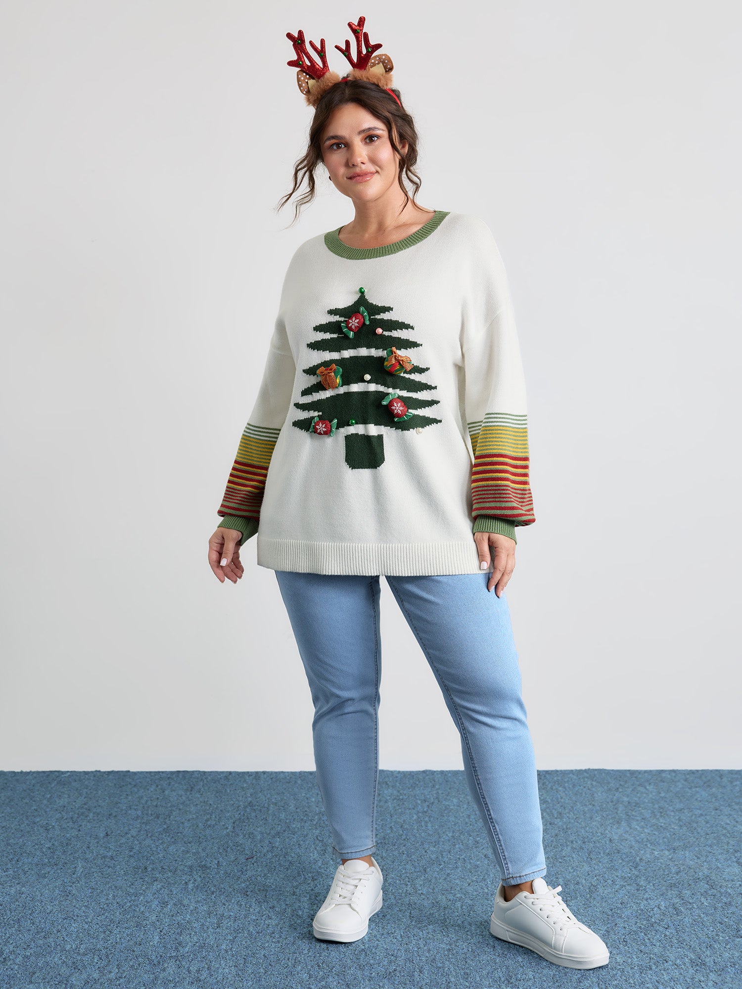 Shop Christmas Tree Pattern Jacquard Stripe Pullover now and redefine your style with confidence at BloomChic. Tailored for mid and plus-size women. This trendy Sweaters Cardigans Women, sizes 10-30. Color:Ivory;Neckline:Round Neck;Sleeve Type:Drop shoulder sleeve;Pattern Type:Christmas;Prints:Non;Details:Contrast;Pocket:No-pocket;Belt:No-belt;Closure Type:Non