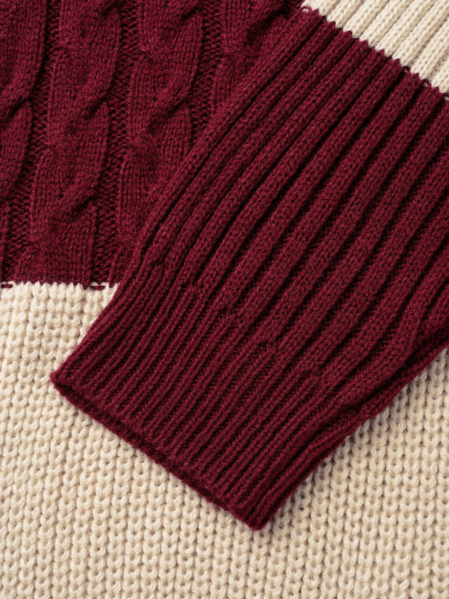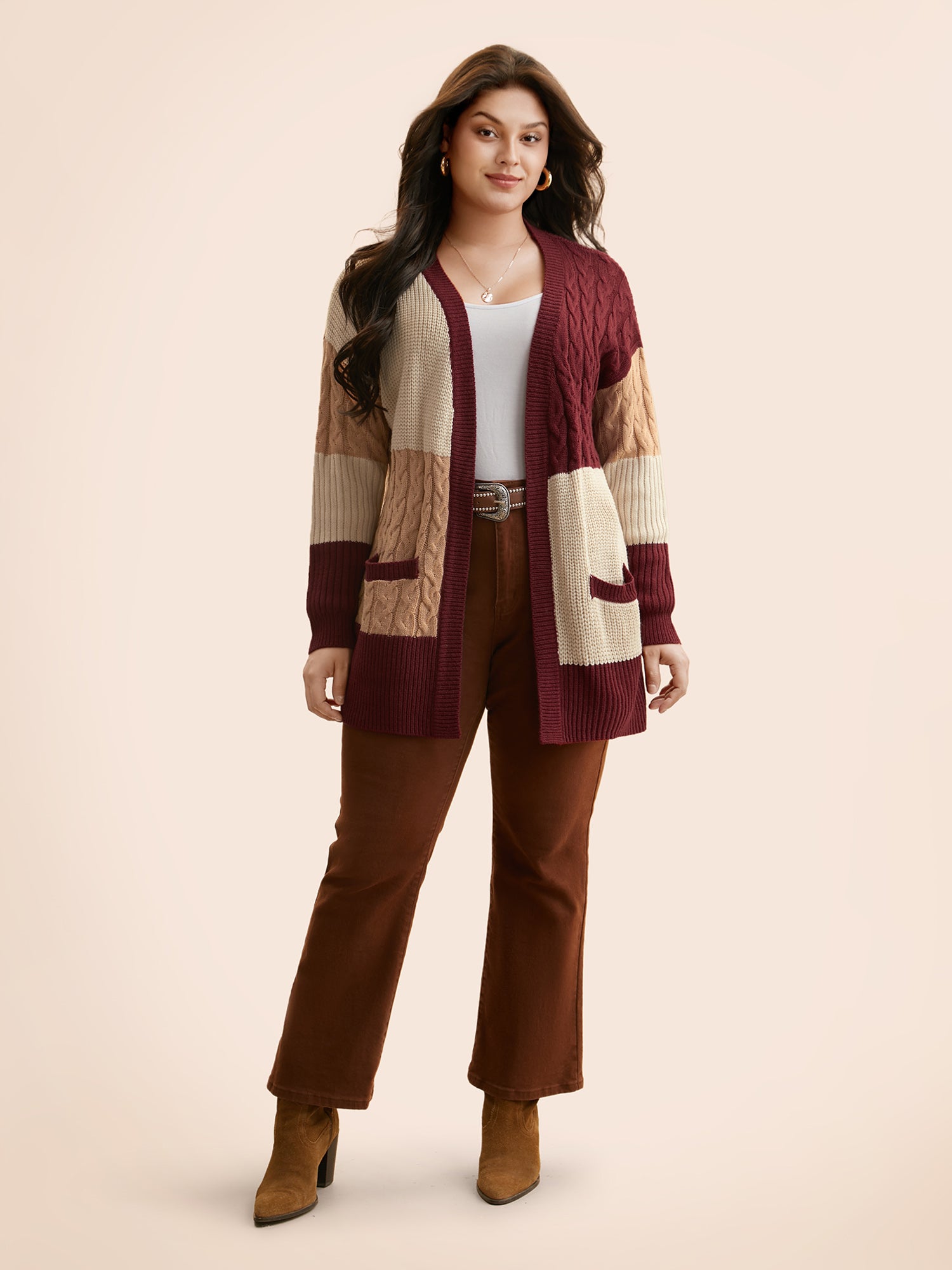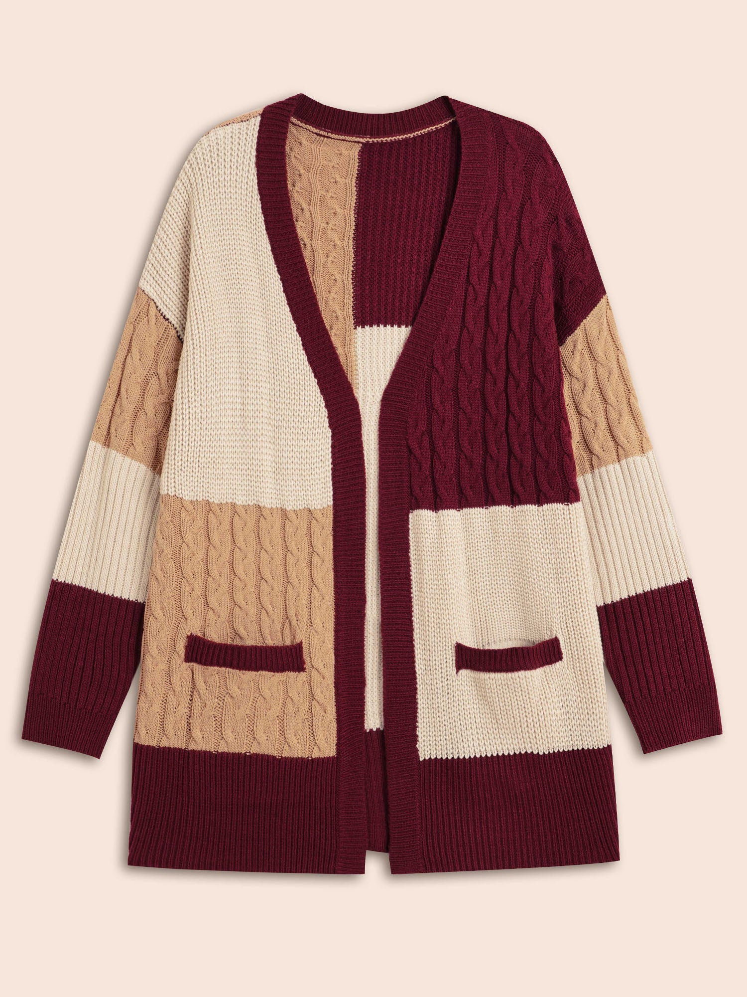 Shop Colorblock Contrast Cable Knit Pocket Cardigan now and redefine your style with confidence at BloomChic. Tailored for mid and plus-size women. This trendy Sweaters Cardigans Women, sizes 10-30. Season:Winter;Color:Maroon;Style:Casual;Neckline:Kimono collar;Sleeve Type:Drop shoulder sleeve;Prints:Geometric & color block;Details:Contrast, Cable Knit, Texture;Pocket:Patch pocket;Belt:No-belt;Closure Type:Open front without closure