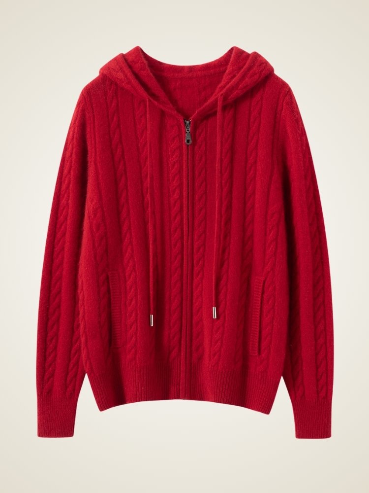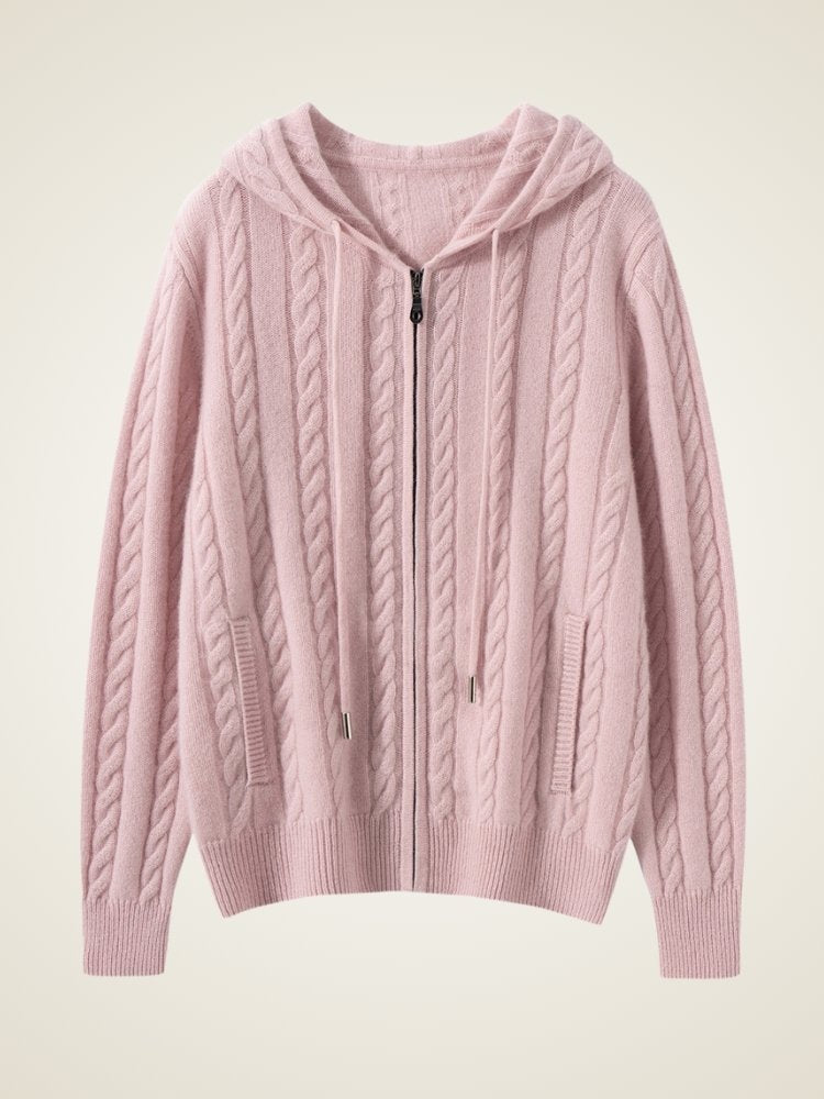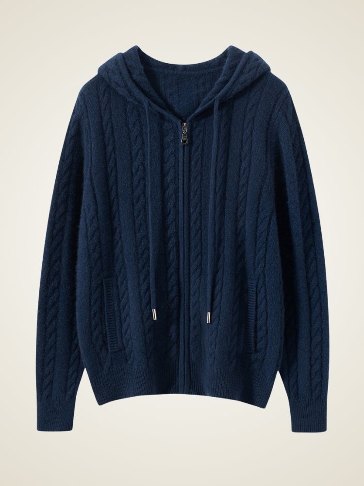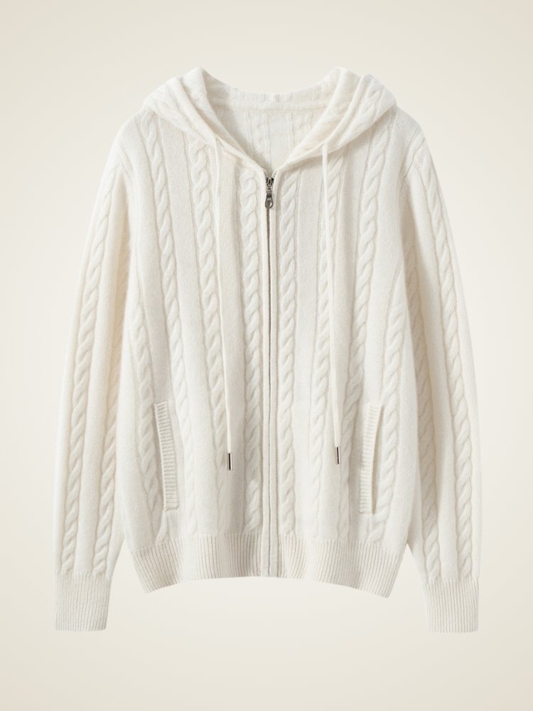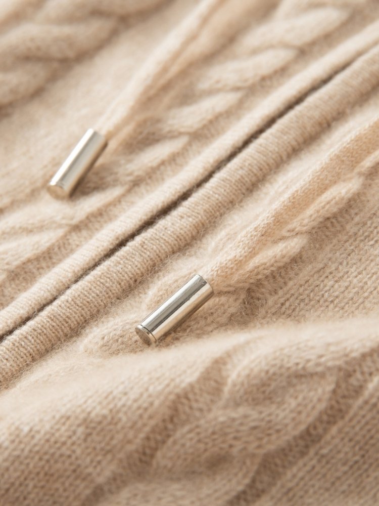 Rediscover the beauty of simplicity with The Marisel �� Hooded Cashmere Cardigan. Designed with a timeless cable-knit pattern, it brings a subtle texture that elevates even the most relaxed looks. The full-zip front and adjustable hood offer effortless versatility, making it a refined yet laid-back companion for any moment of the day.