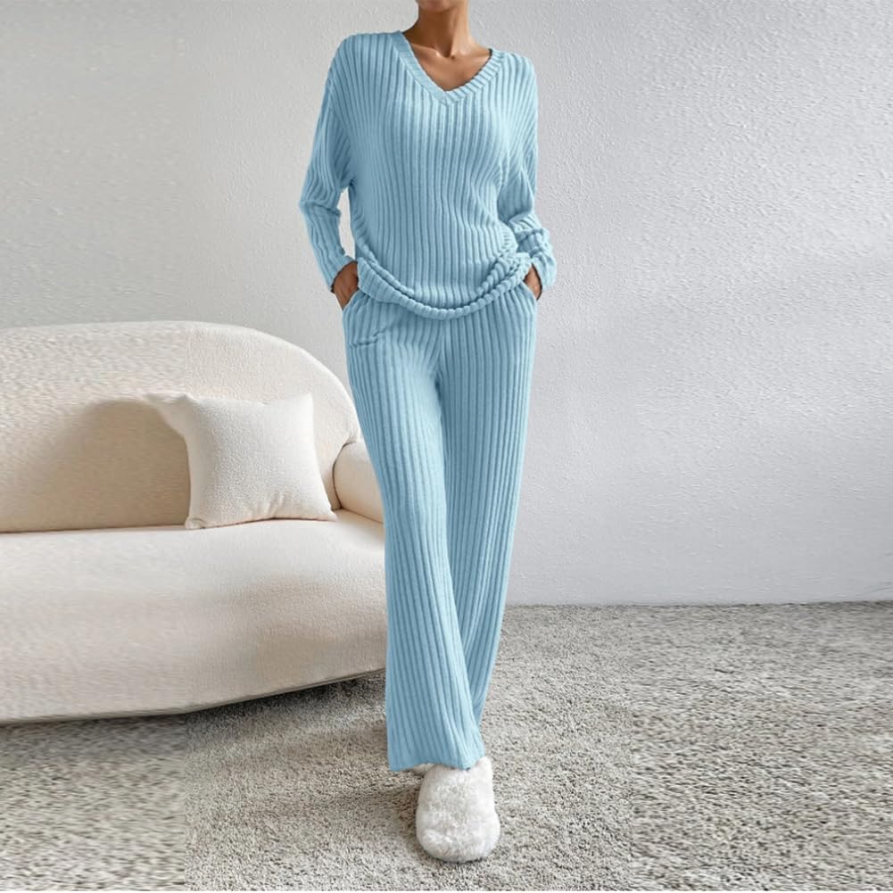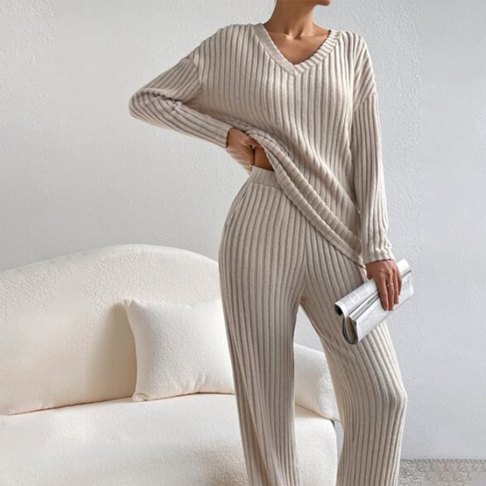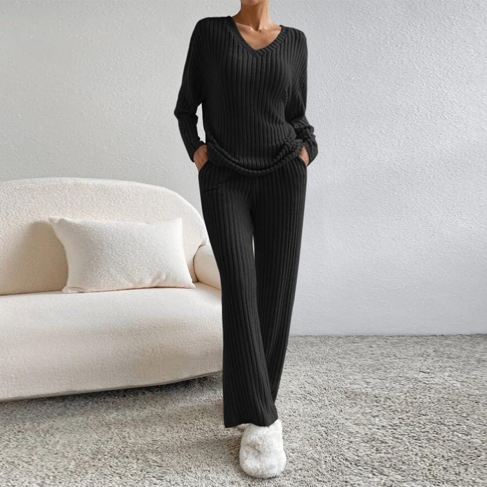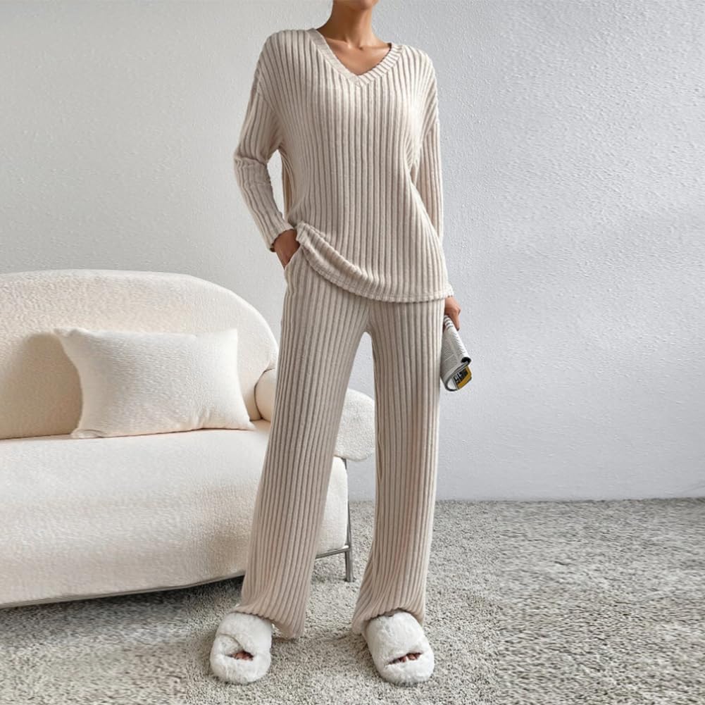 Unique Design: Women 2 piece outfit long sleeve knit top with pants set, V Neck ribbed knit pullover top, can offer a total coverage to the arms. 2 piece lounge set medium rise wide leg pants with pockets, elasticized waistband for a suitable fitting