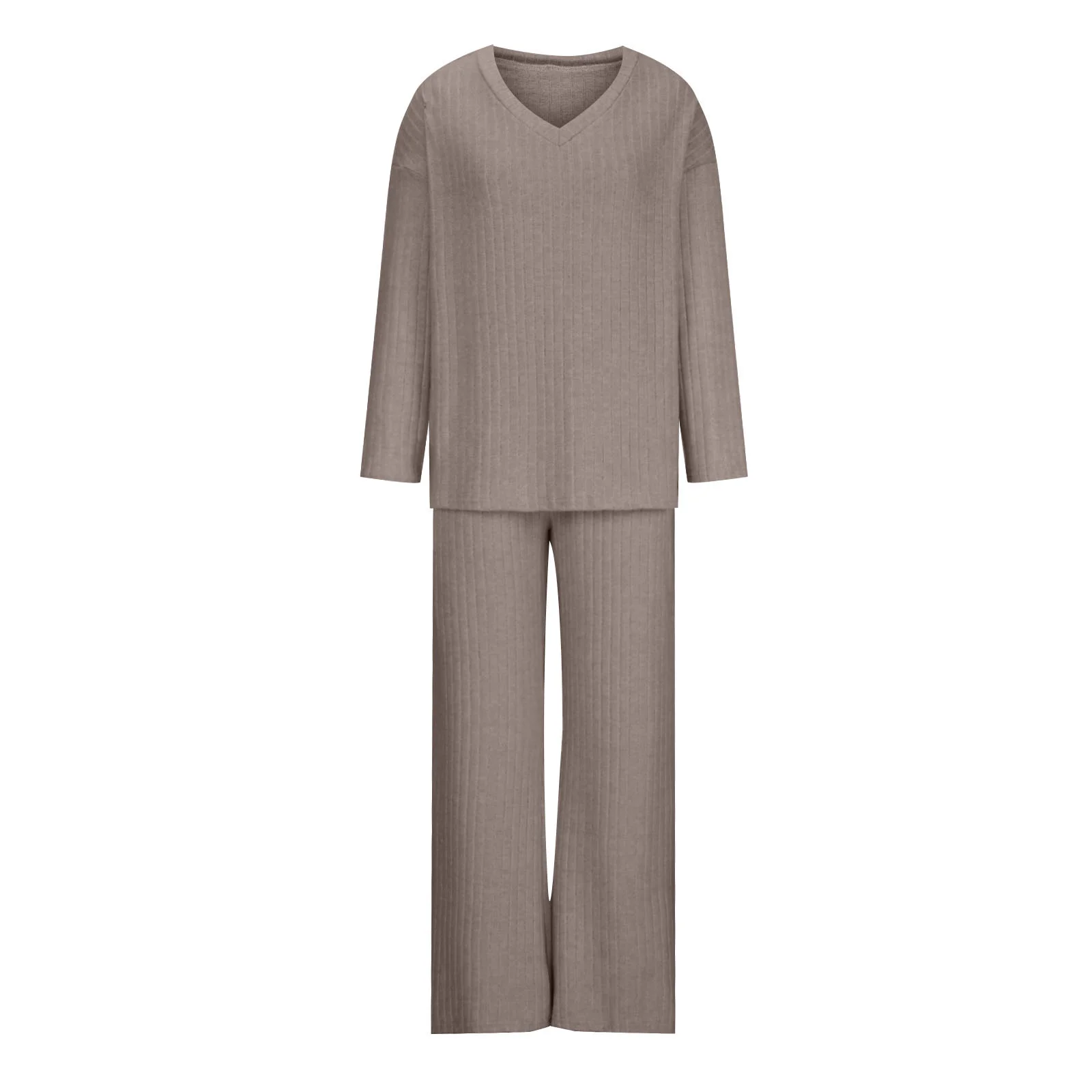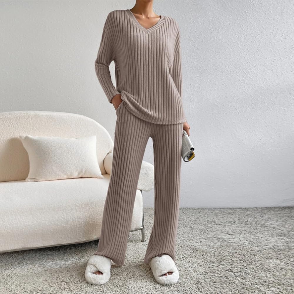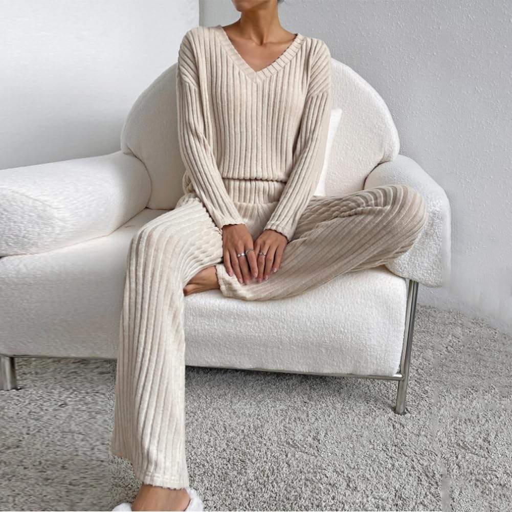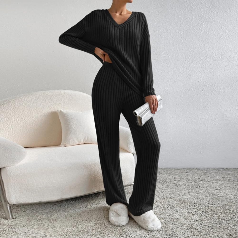 Unique Design: Women 2 piece outfit long sleeve knit top with pants set, V Neck ribbed knit pullover top, can offer a total coverage to the arms. 2 piece lounge set medium rise wide leg pants with pockets, elasticized waistband for a suitable fitting