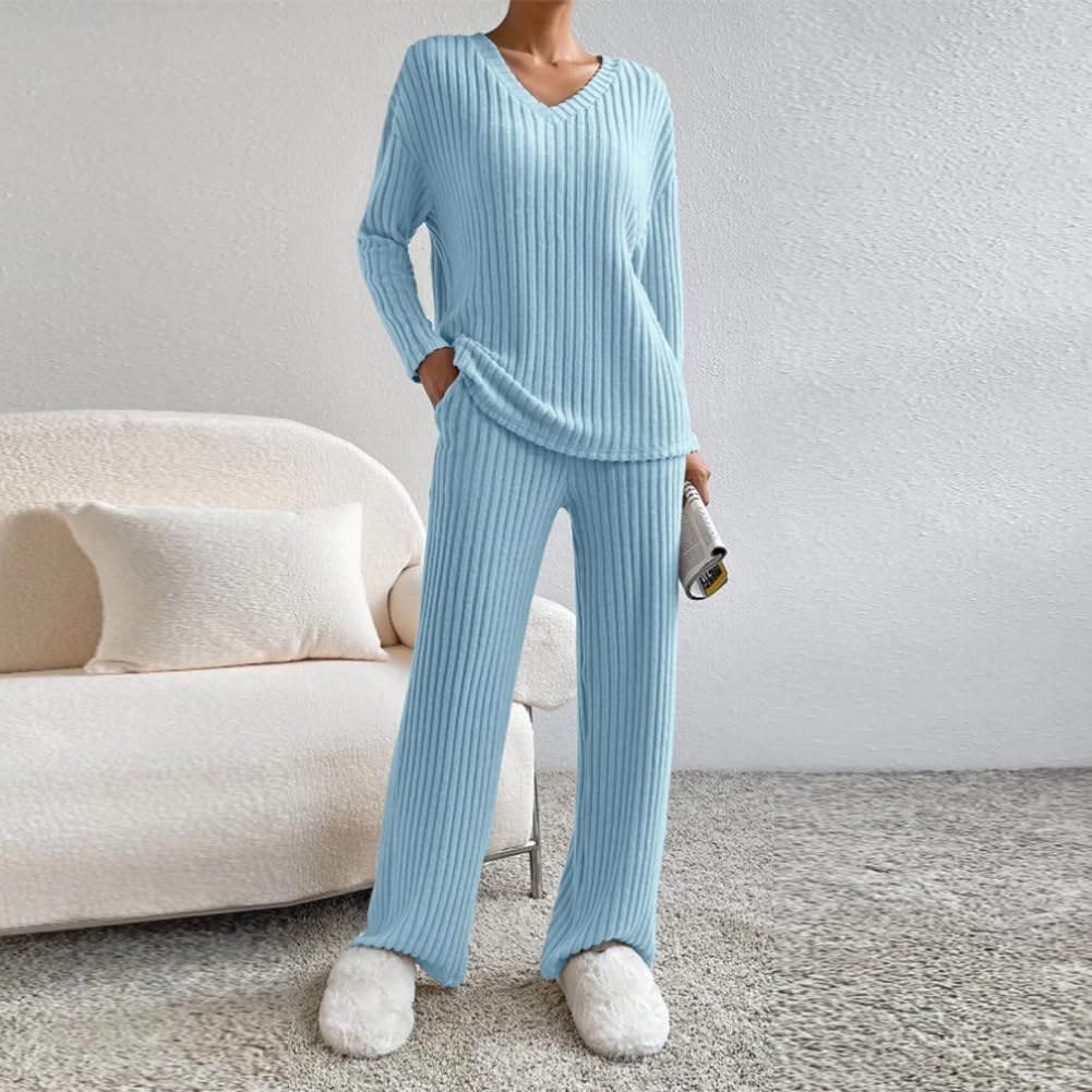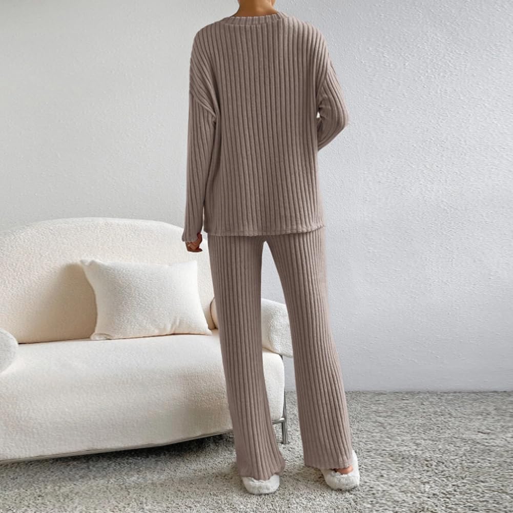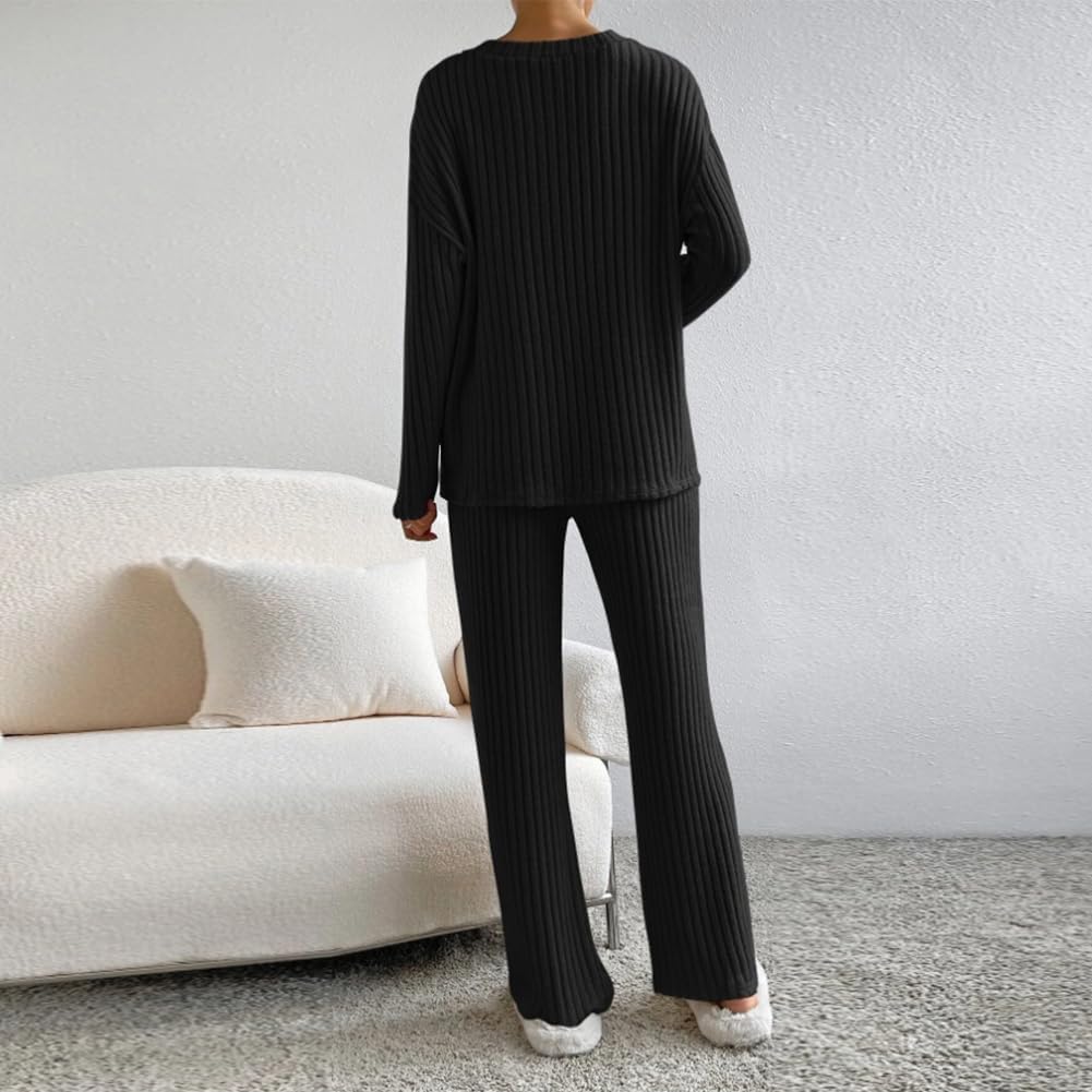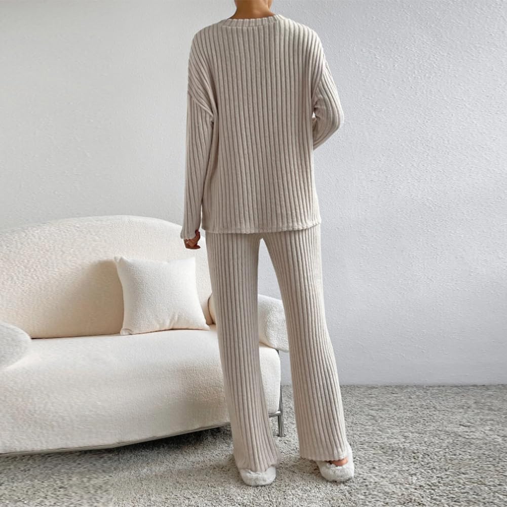 Women Fall Winter Two Piece Outfit Ribbed Knit Pullover Sweater Top + Loungewear Wide Leg Pants Casual Pajama 2PCS Set
