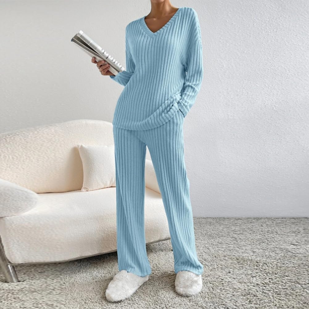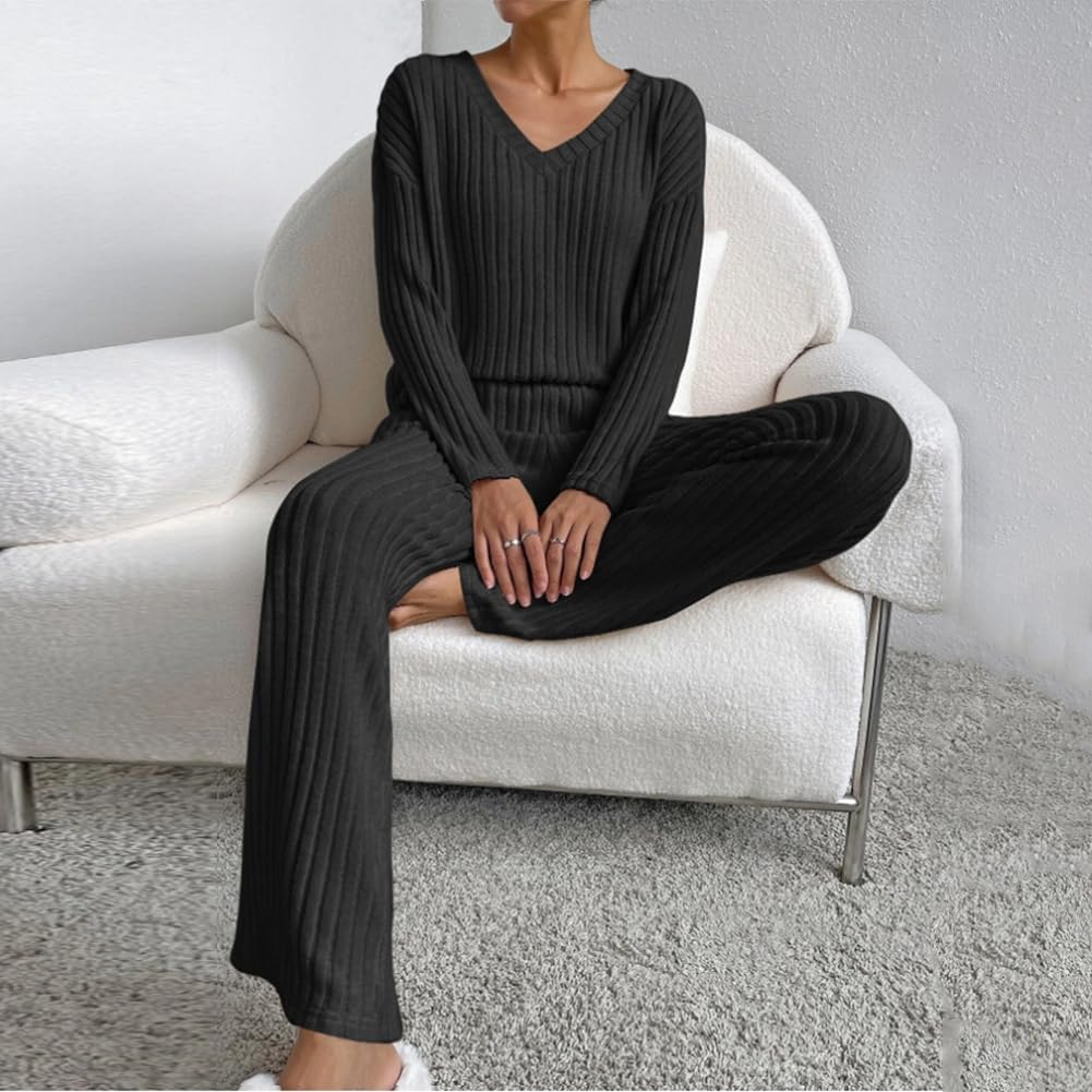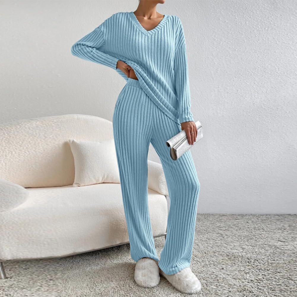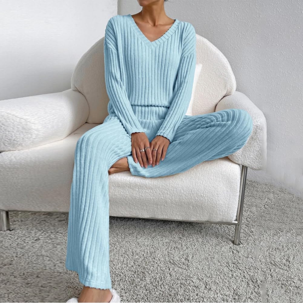 Women Fall Winter Two Piece Outfit Ribbed Knit Pullover Sweater Top + Loungewear Wide Leg Pants Casual Pajama 2PCS Set