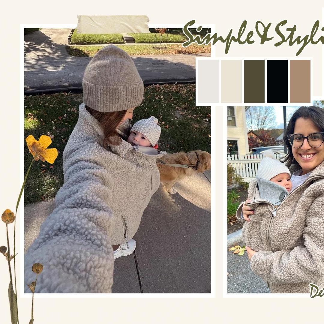 Loose-fit jacket in soft teddy fleece for wear during and after pregnancy with a detachable panel for carrying the baby. They provide warmth, comfort, and practicality for both you and your little one.