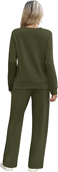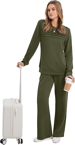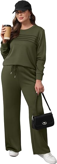 Features: Crewneck/Adorable Pleated Front tops. Elastic waist pants/ drawstring pants/ wide leg sweatpants and Equipped with convenient pockets