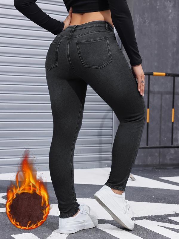 • Women's Fall Winter Fleece Lined Denim Jeans, Elegant Woven Fabric, Thicken Warm Comfortable Pants, High Waist Slim Fit Design