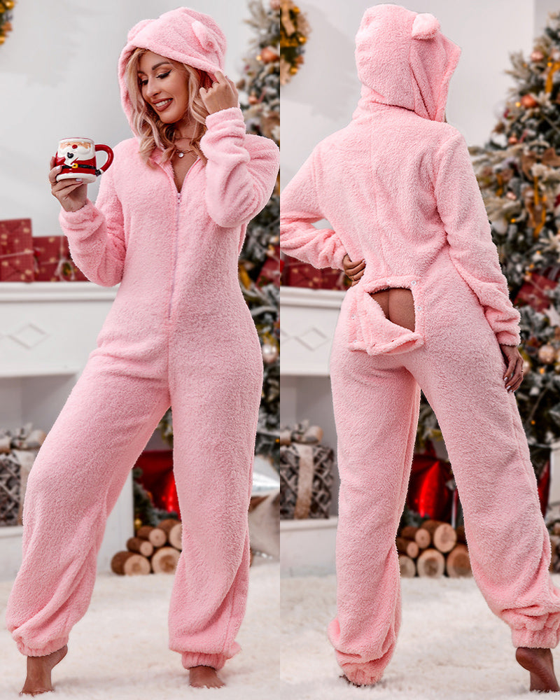 3D Ear Buttoned Flap Functional Fluffy Lounge Jumpsuit