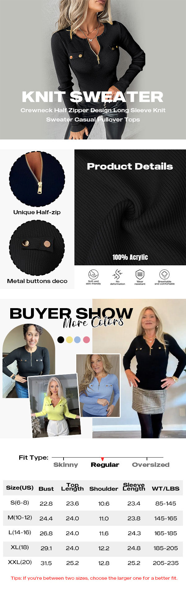 • Crewneck Half Zipper Flap Detail Knit Sweater Long Sleeve Slim Fit Ribbed Pullover Top